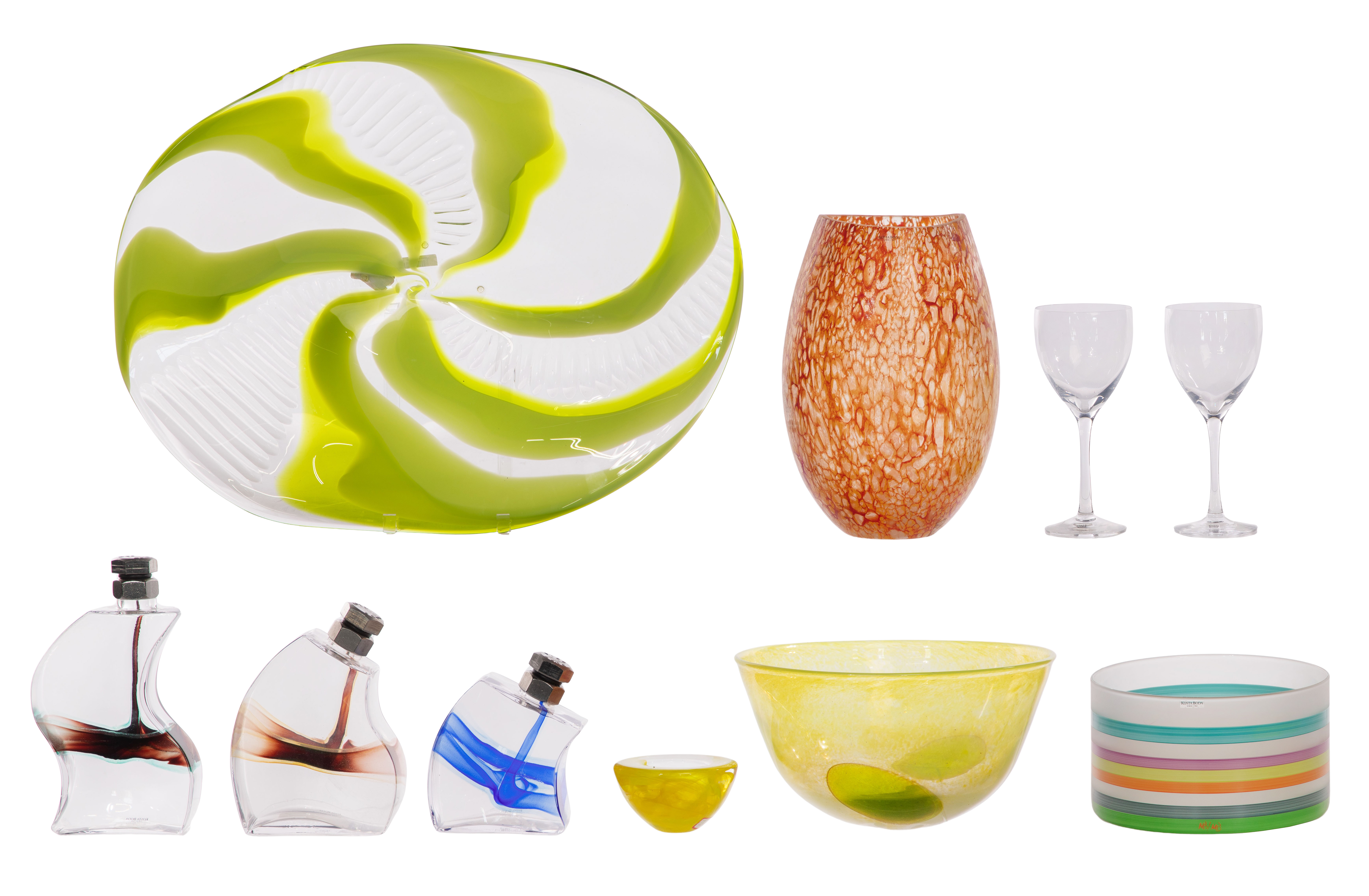 (10) items including (3) bowls, (3) bottles with metal toppers, a pair of wine glasses, a vase and a charger, in various shapes, sizes and colors, some signed