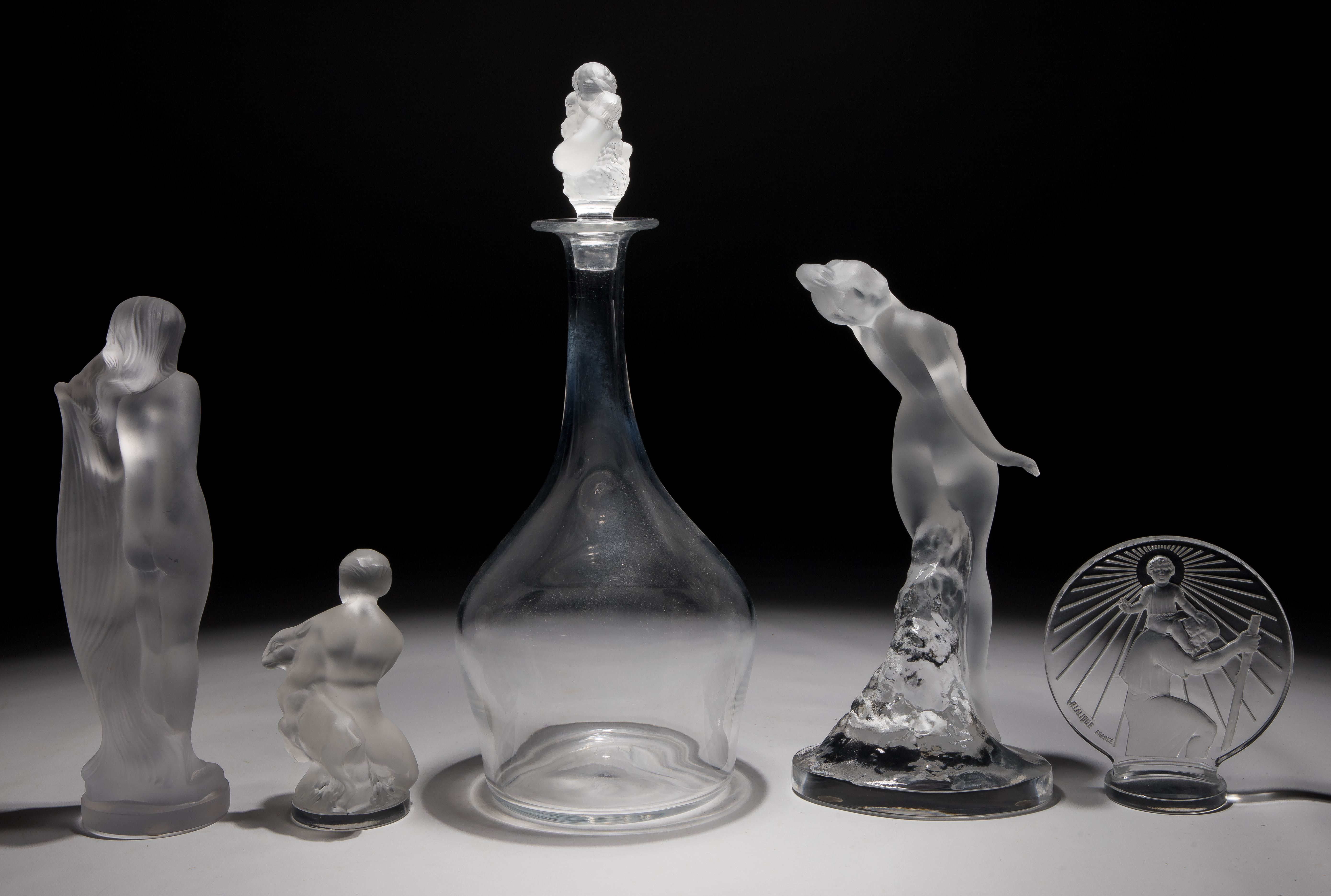 (5) items including a Sainte-Christophe car mascot having a molded ‘R. Lalique France’ mark, a Roxane decanter and stopper, as well as Isis, Danseuse and Diana and Fawn figurines, having engraved marks