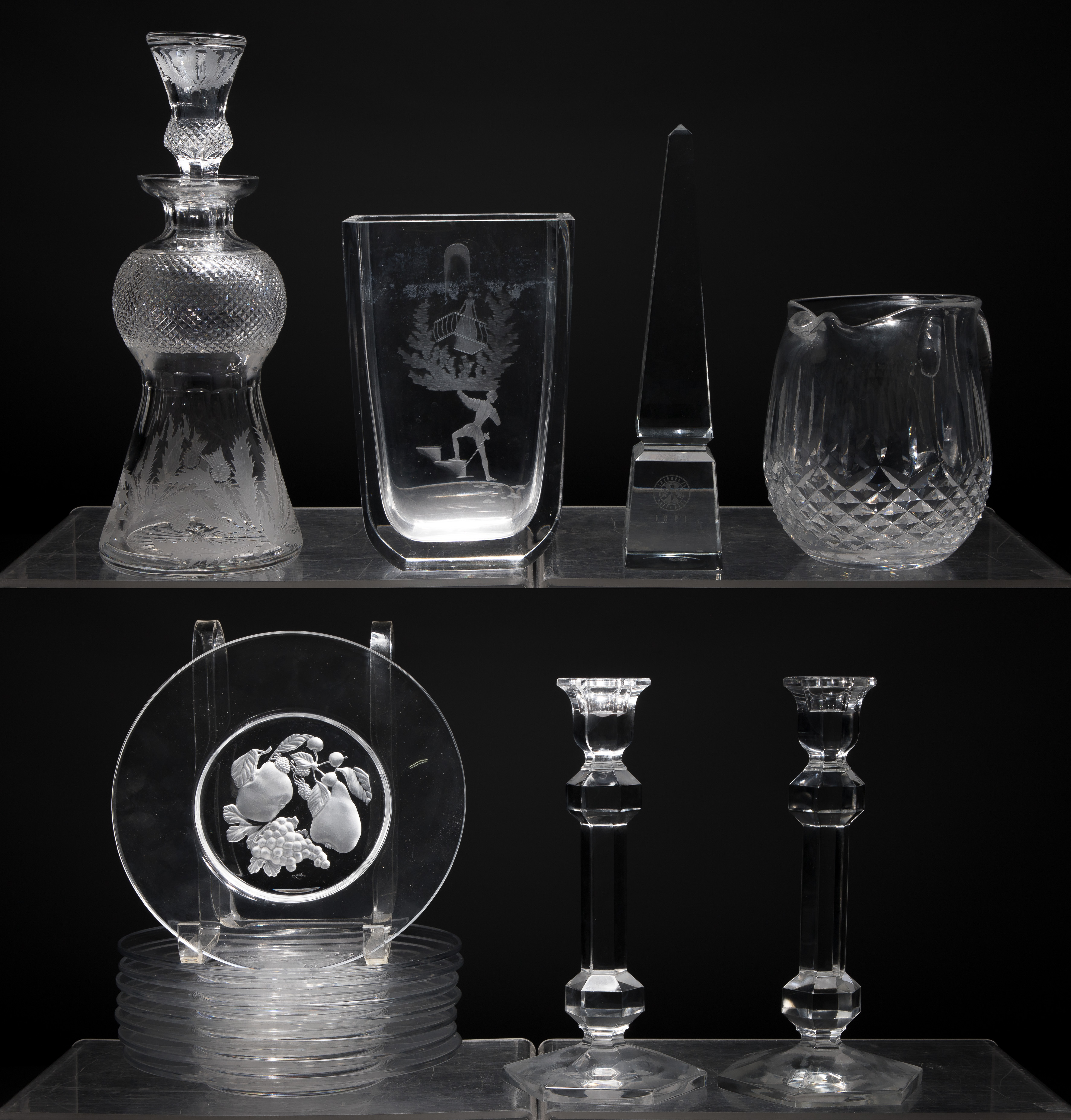 (13) items including an Edinburgh Royal Scot Thistle etched whisky decanter and stopper, an Orrefors Romeo and Juliet etched vase, a Baccarat obelisk having ‘St. Andrews / Boca Raton / 1994’ etched to front of base, a Waterford Lismore pitcher, (8) Brussels frosted intaglio 8-inch plates and a pair of candlesticks by Val St Lambert, most items having appropriate etched or engraved marks