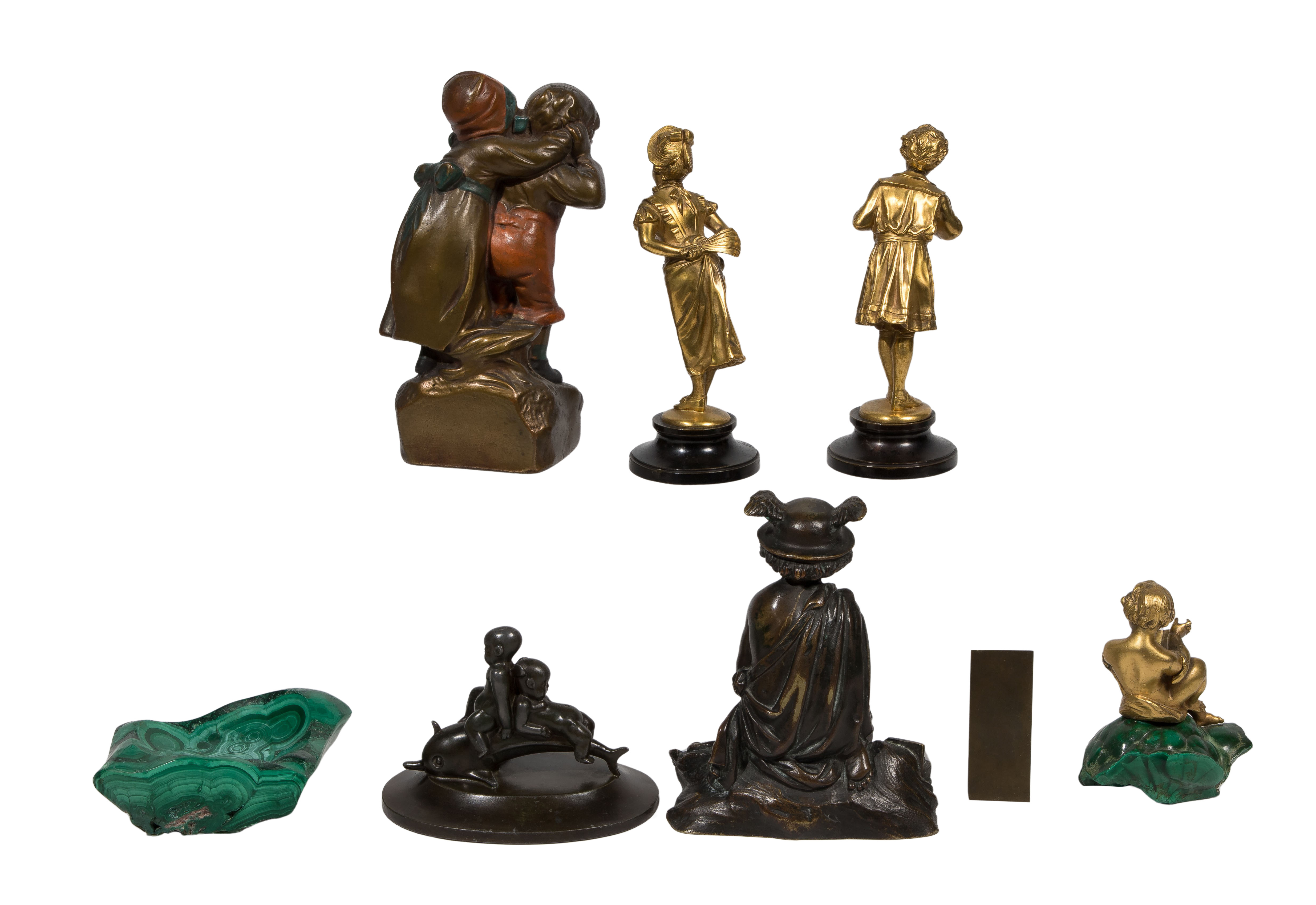 (8) total items including (2) gilt standing children (to be posed as to share a kiss), a gilt child sitting on a malachite base, a cold painted grouping of two children playing, a depiction of a young Mercury adjusting his sandal, a depiction of two putti riding a dolphin; together with a small plaque of a toddler marked ‘D’Apres Bouchardon S.C.’ and a malachite ashtray
