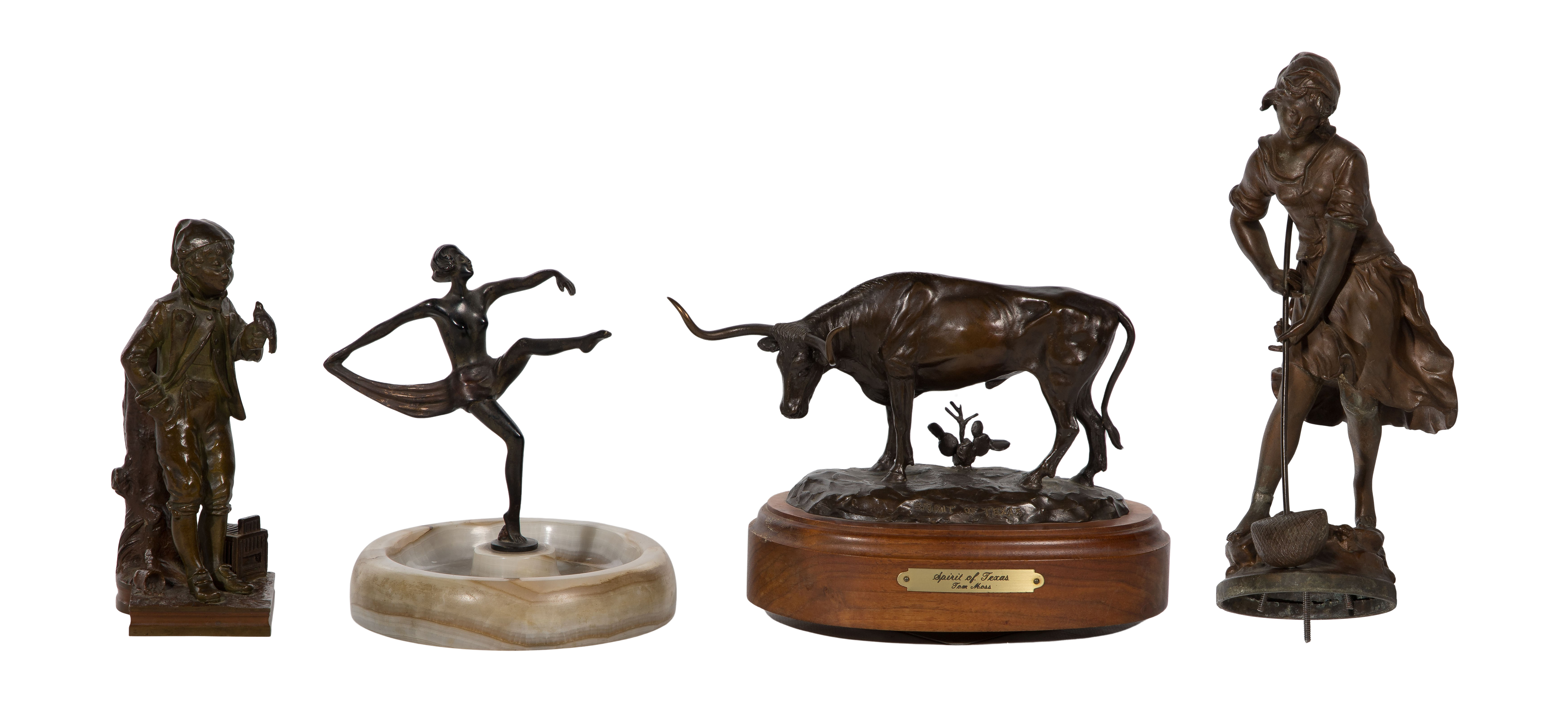 (4) items including a bronze ‘Spirit of Texas’ by Tom Moss, signed on back edge, on rotating wood base, a bronze boy holding a bird, an Art Deco bronze female with onyx ashtray and a cast metal ‘The Fisher’ after August Moreau having signature on back edge