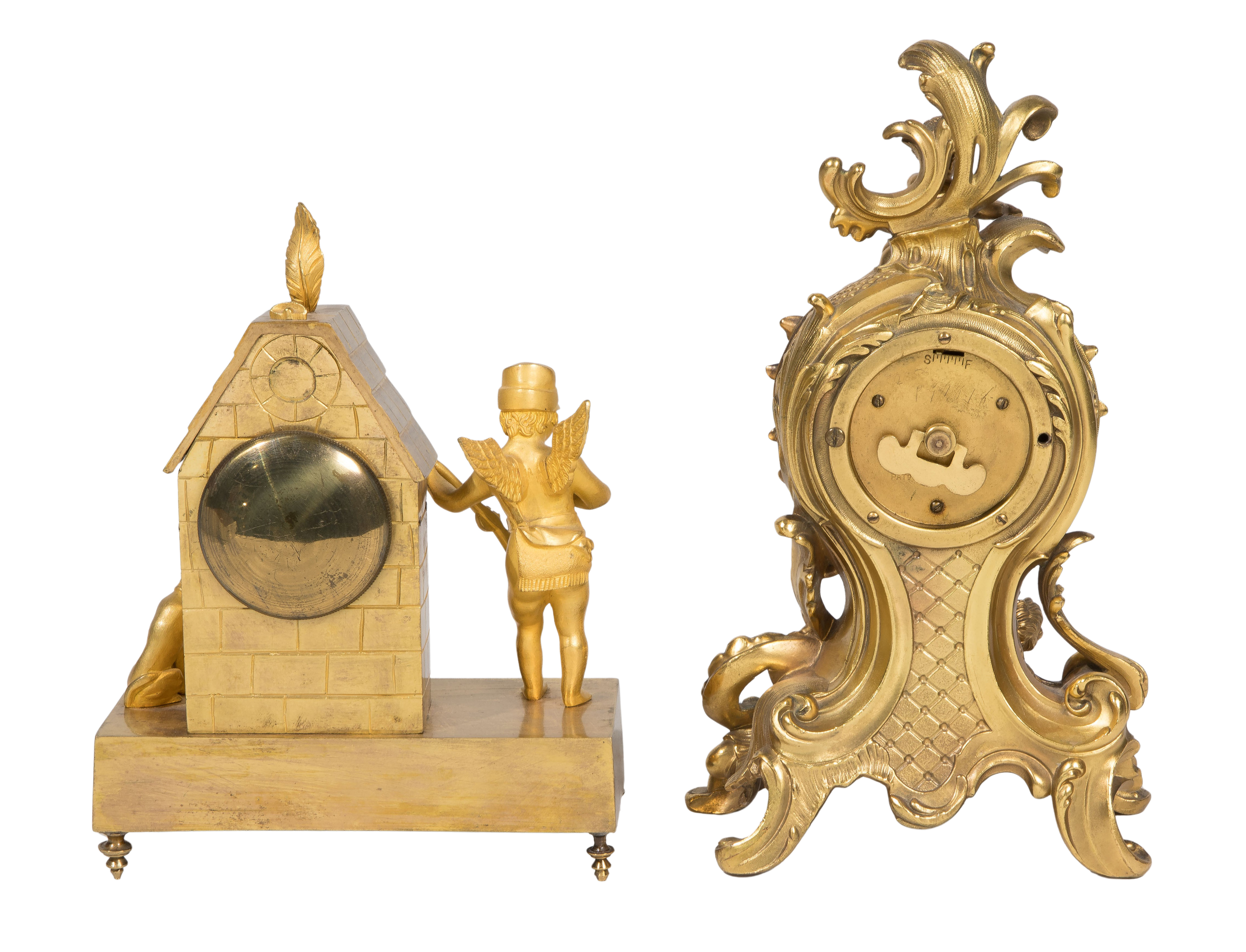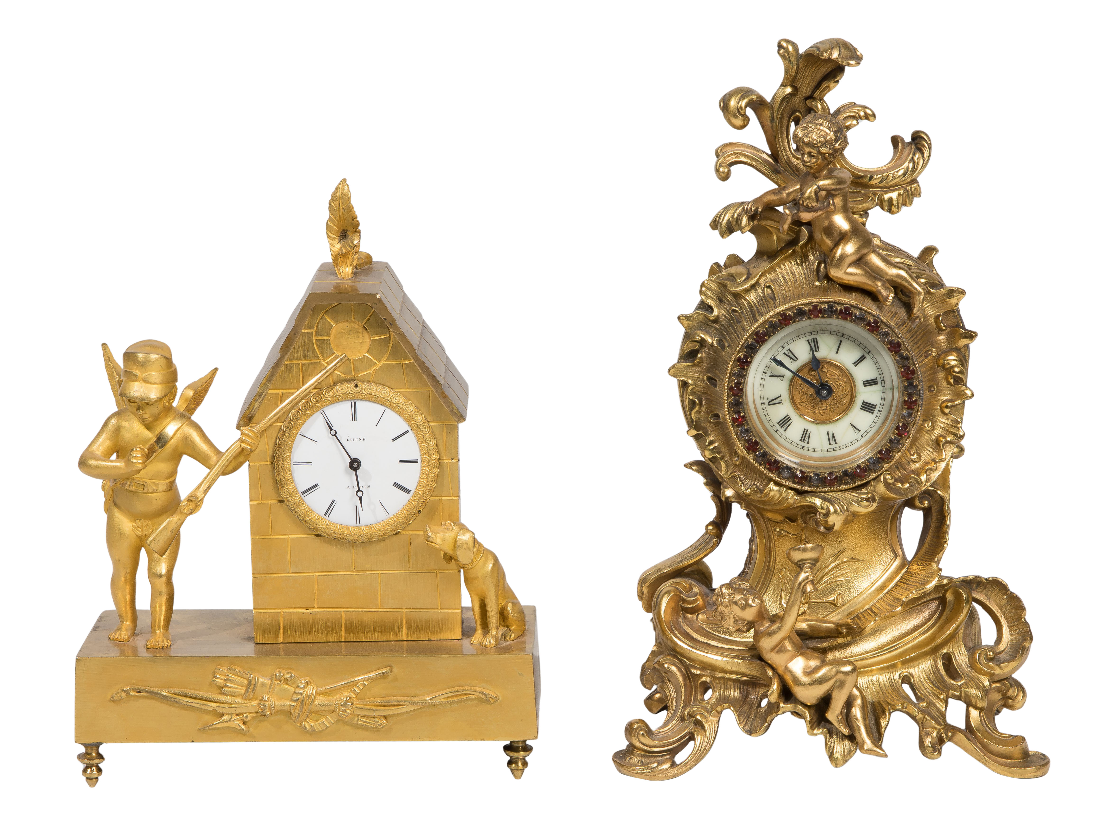 (2) items, both in gold-tone metal cases, the Ansonia having an enamel Roman numeral dial in a Baroque style case having attached putti, marked on back near winding knob, the Lepine marked on the enamel Roman numeral dial in a case depicting a stonework building flanked by a winged putto in military cap, holding a long gun and a dog, an bow and quiver of arrows in relief on the base, brass movement marked ‘J. Marti’, no key