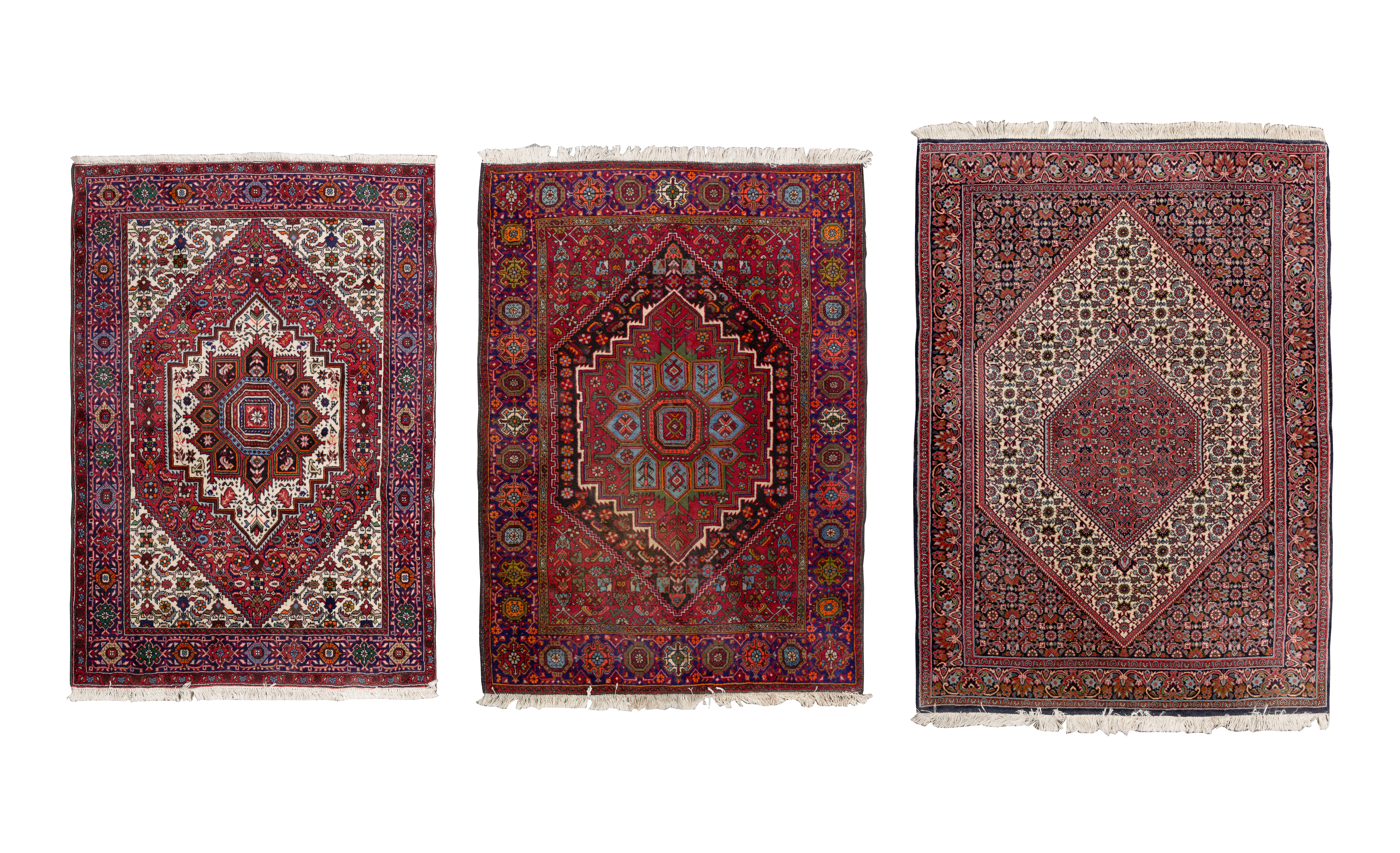 (3) hand woven items including a floral having a center medallion in hues of blue, green, cream and brown on a blue field, a geometric motif having a center medallion in hues of green, blue and orange on a red field (4 ft. 7 in. x 3 ft.5 in.) and a geometric motif having a center medallion in hues of wine, pink and blue on a cream field (4 ft. 5 in. x 3 ft. 5 in.)