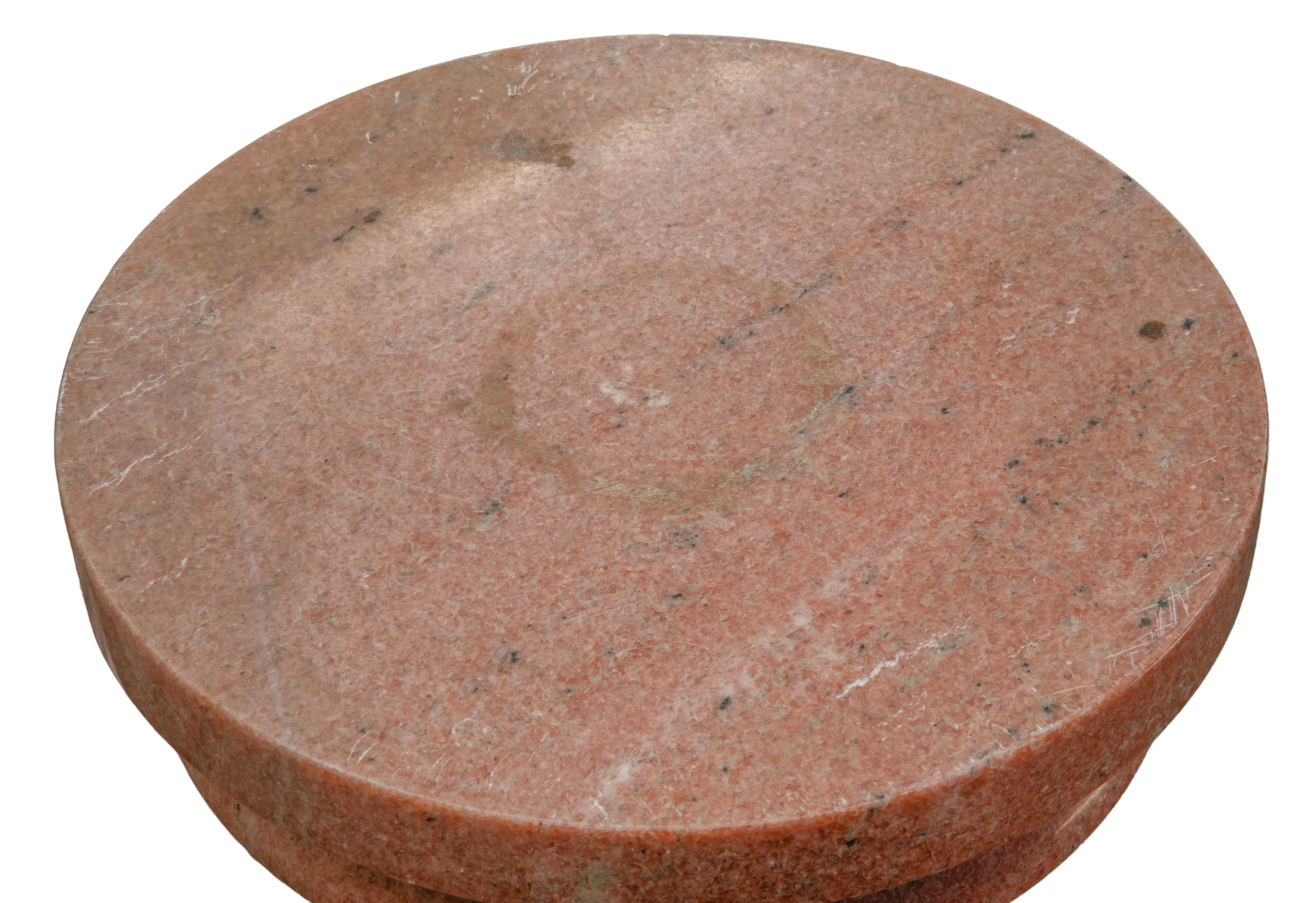 A pair, columnar shaped speckled pink marble, round tops and bases, one having a darker mottled top