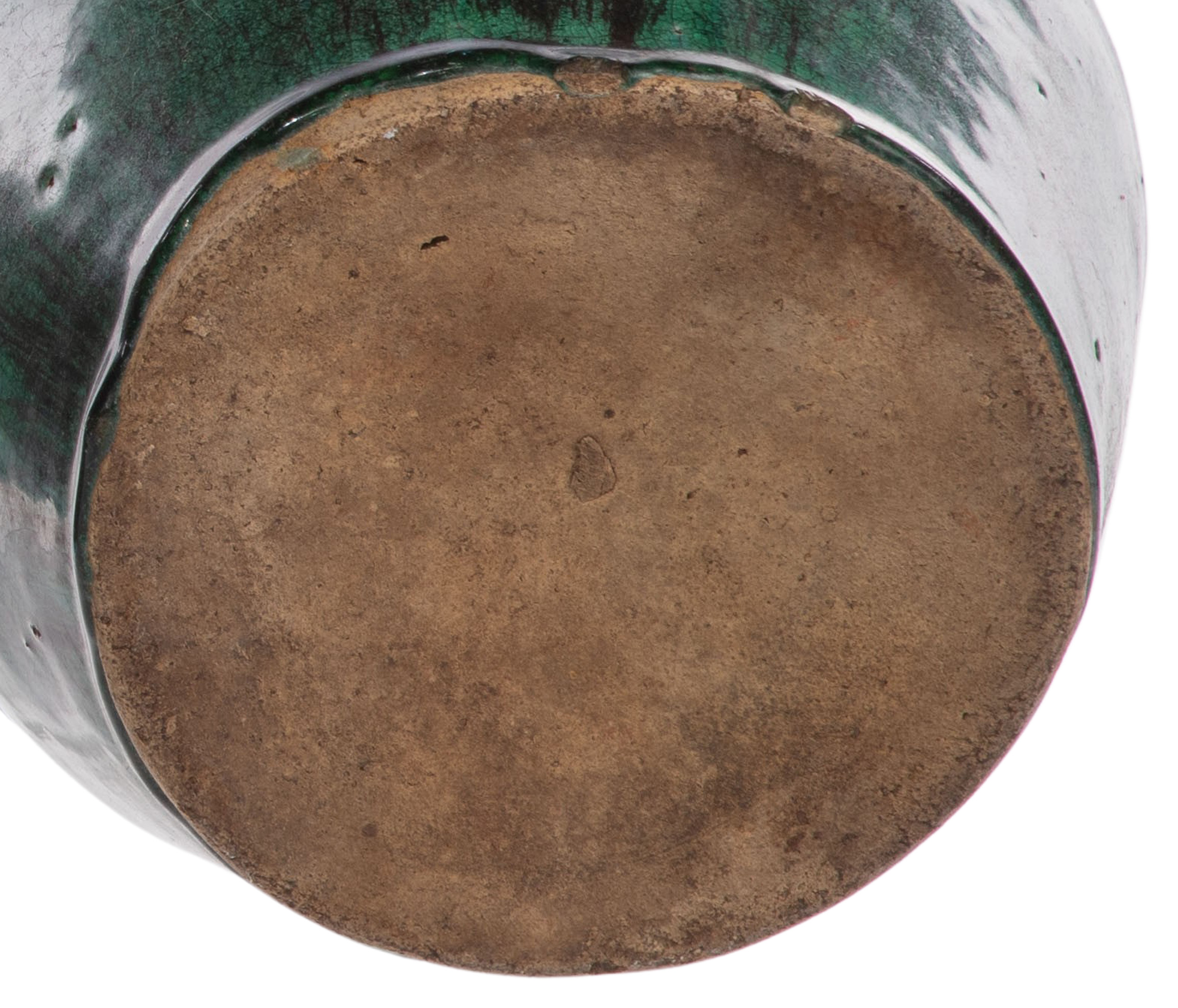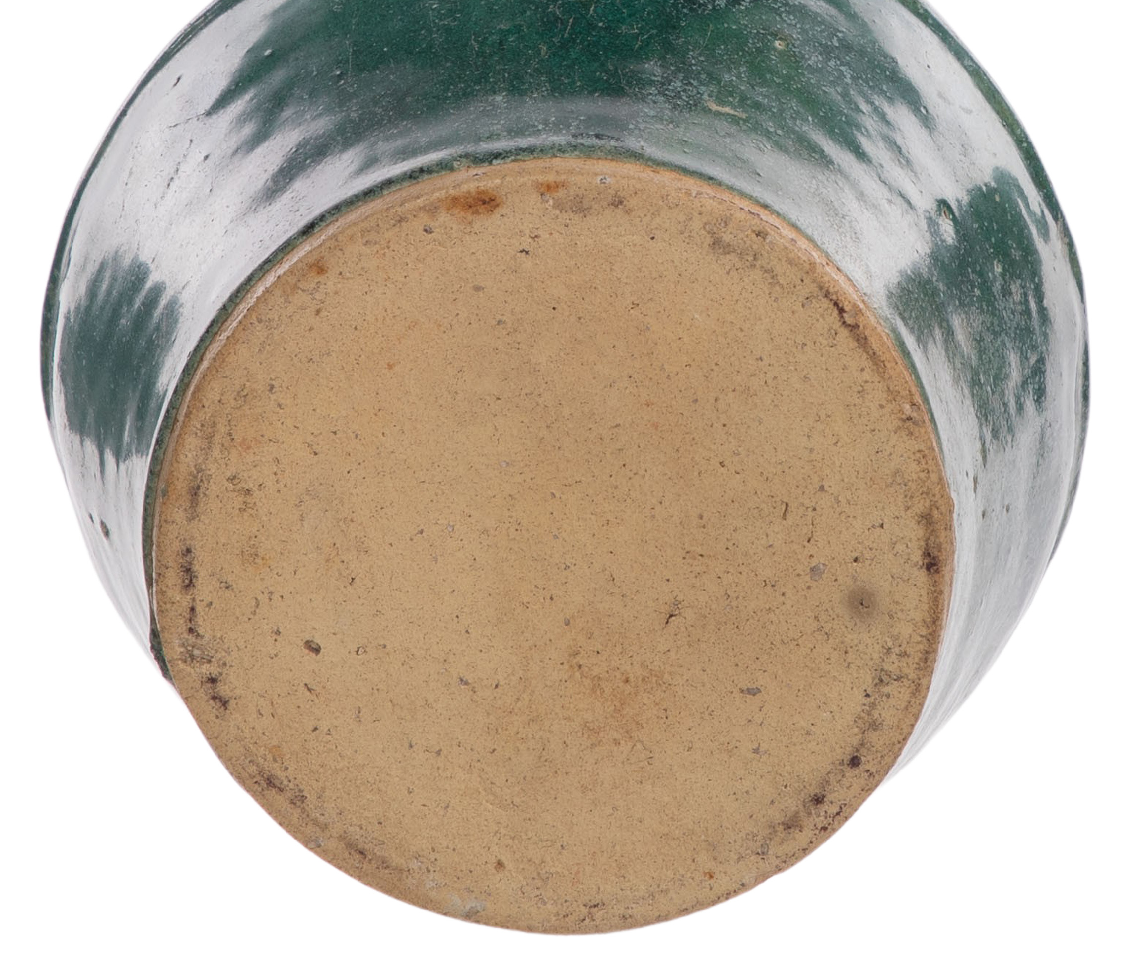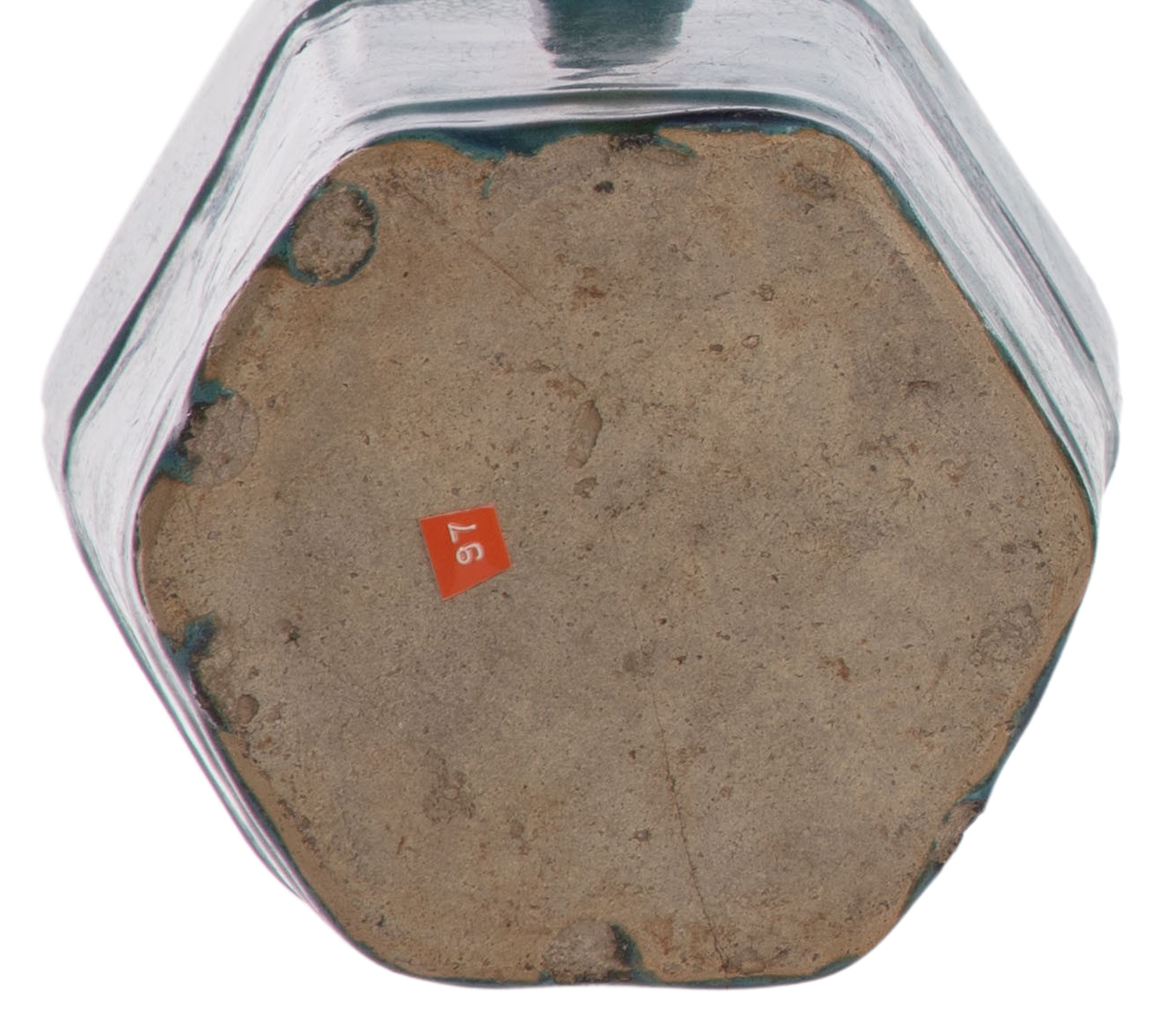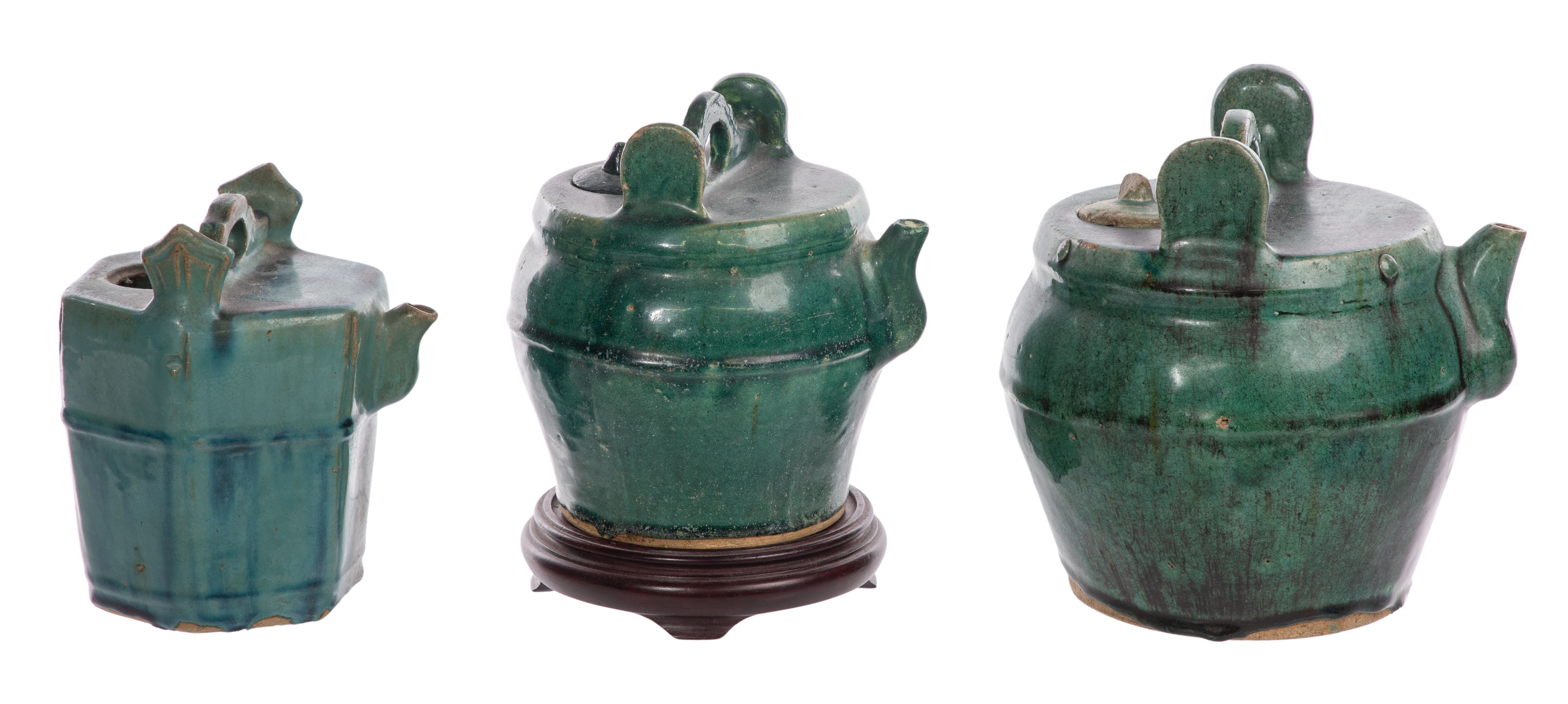 (4) total items including (3) green glazed Shiwan pottery hexagonal and round form teapots with a pouring spout, small lid and carrying handle; together with a wood stand
