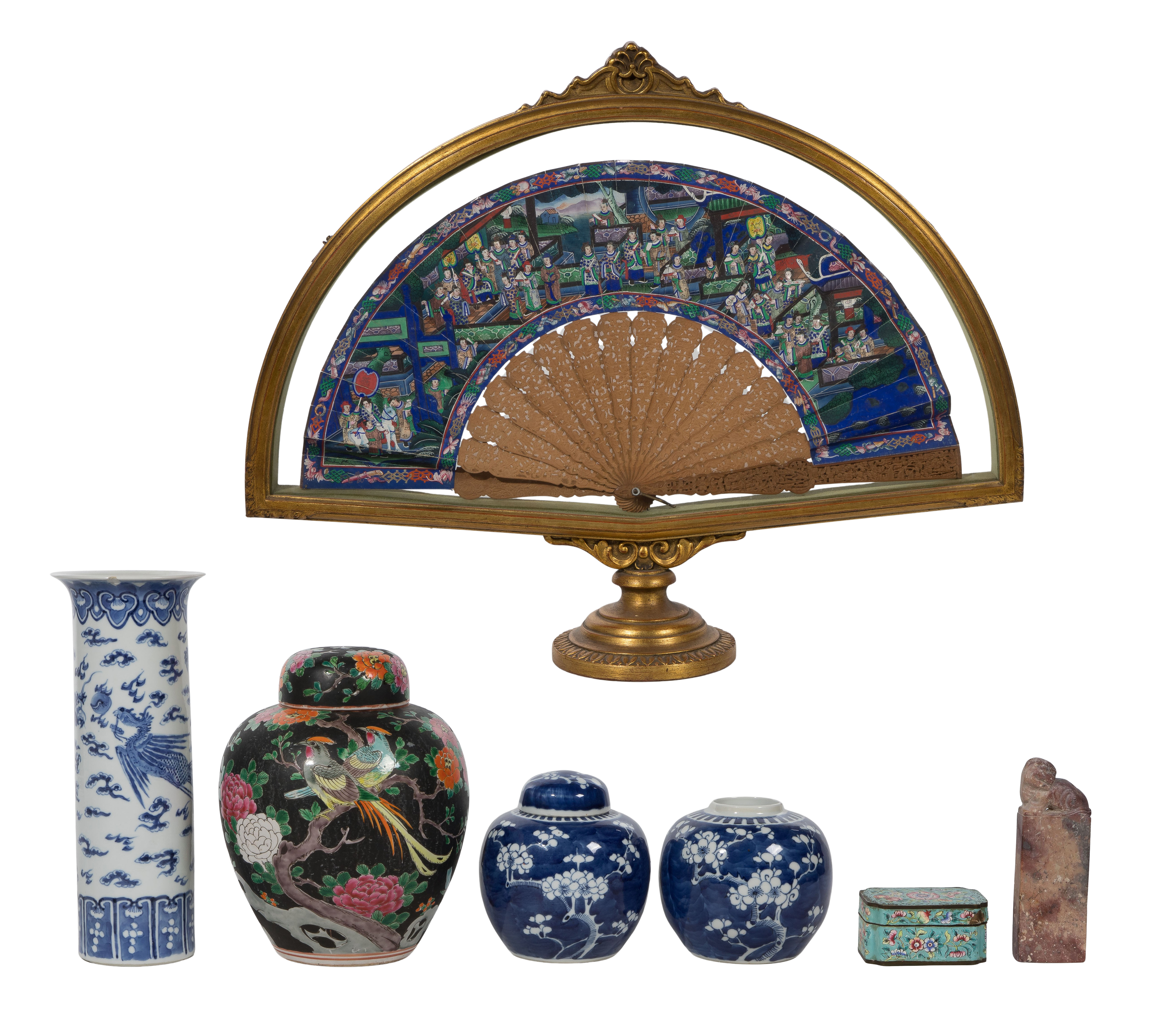 (7) items including a pair of ginger jars, a hand painted fan in framed, a bird and floral themed ginger jar, a carved stone seal, an enameled metal box and a dragon themed vase