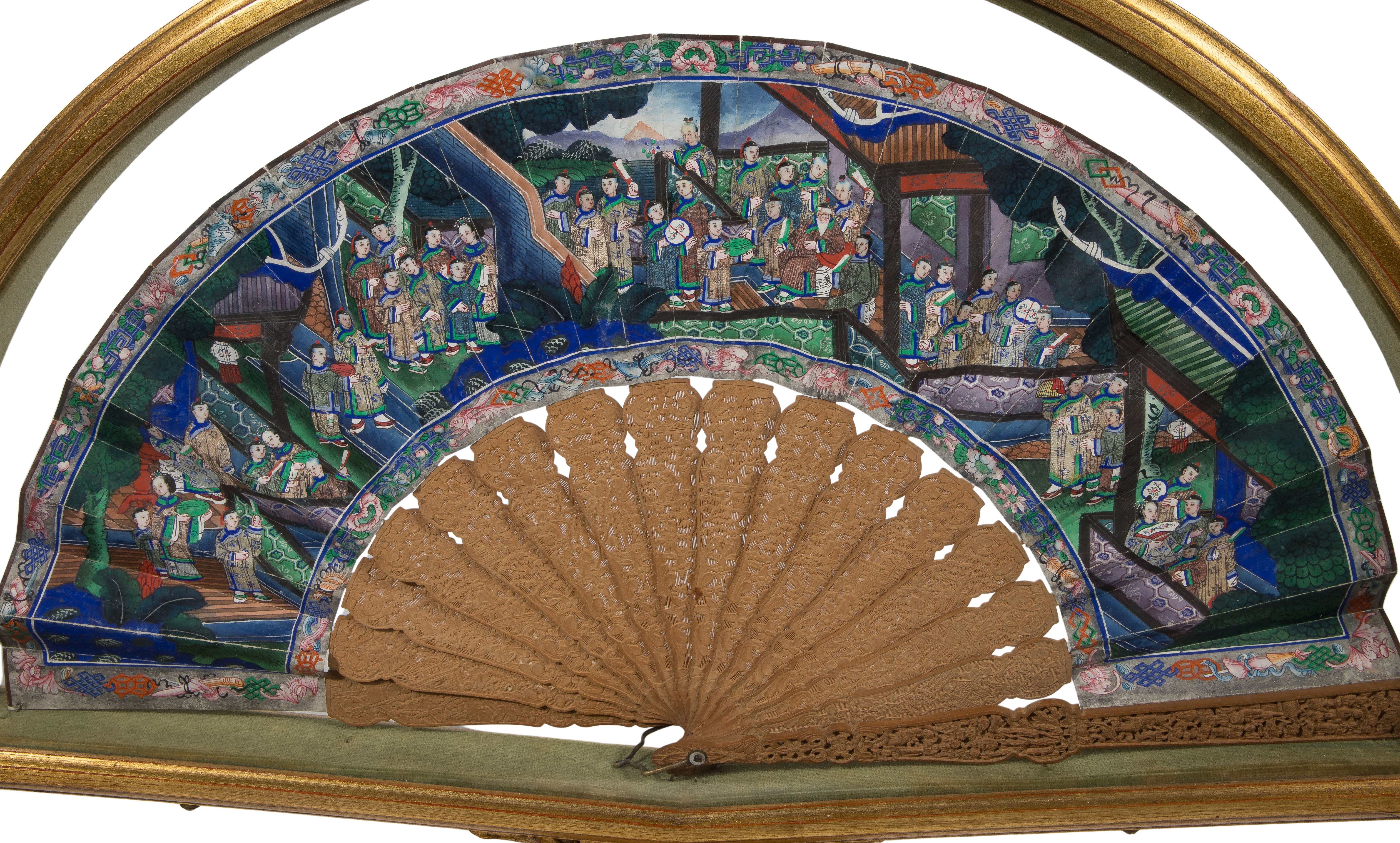 Condition: one jar missing lid, fan having paint loss, creases and chips on frame, rim of dragon vase having chip