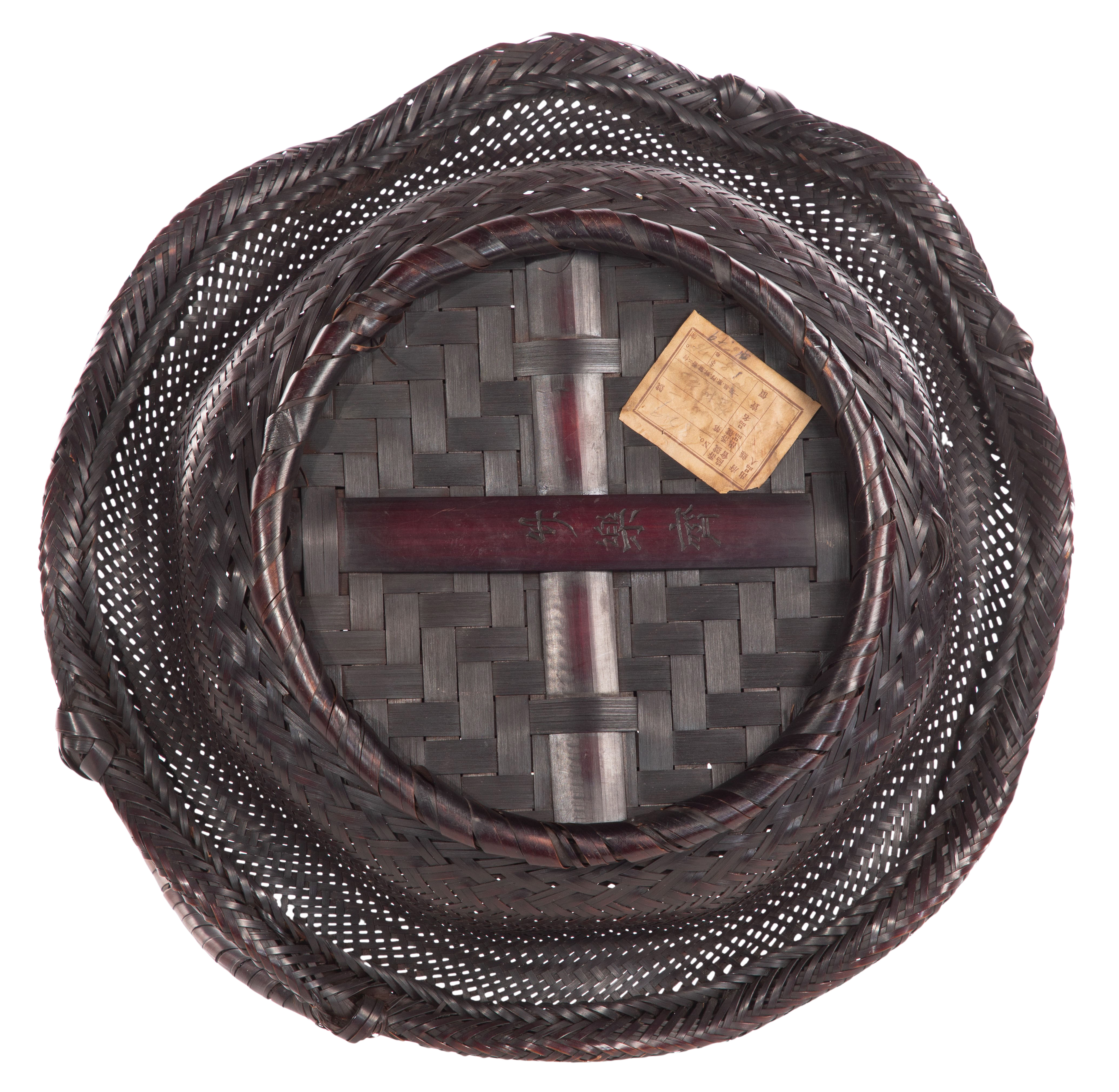 A circular scalloped edged fruit / flower basket of smoked split bamboo having alternating double strips, twining, knotting and wrapping, a handle of bent whole stems wrapped in bamboo, Japanese characters impressed on underside along with tag