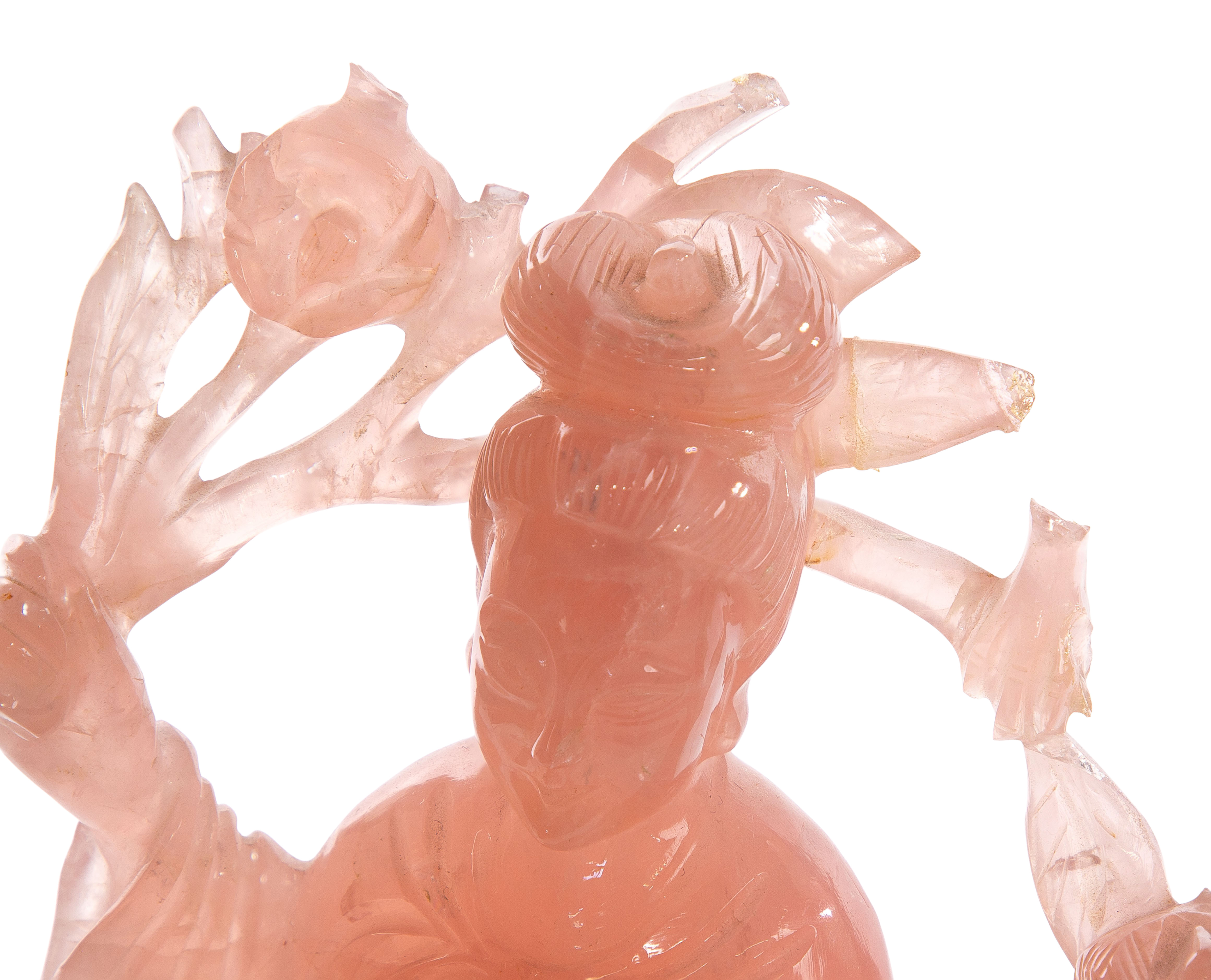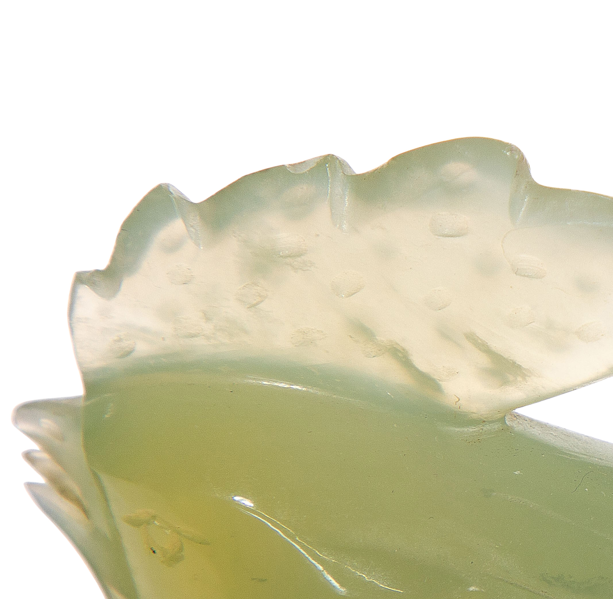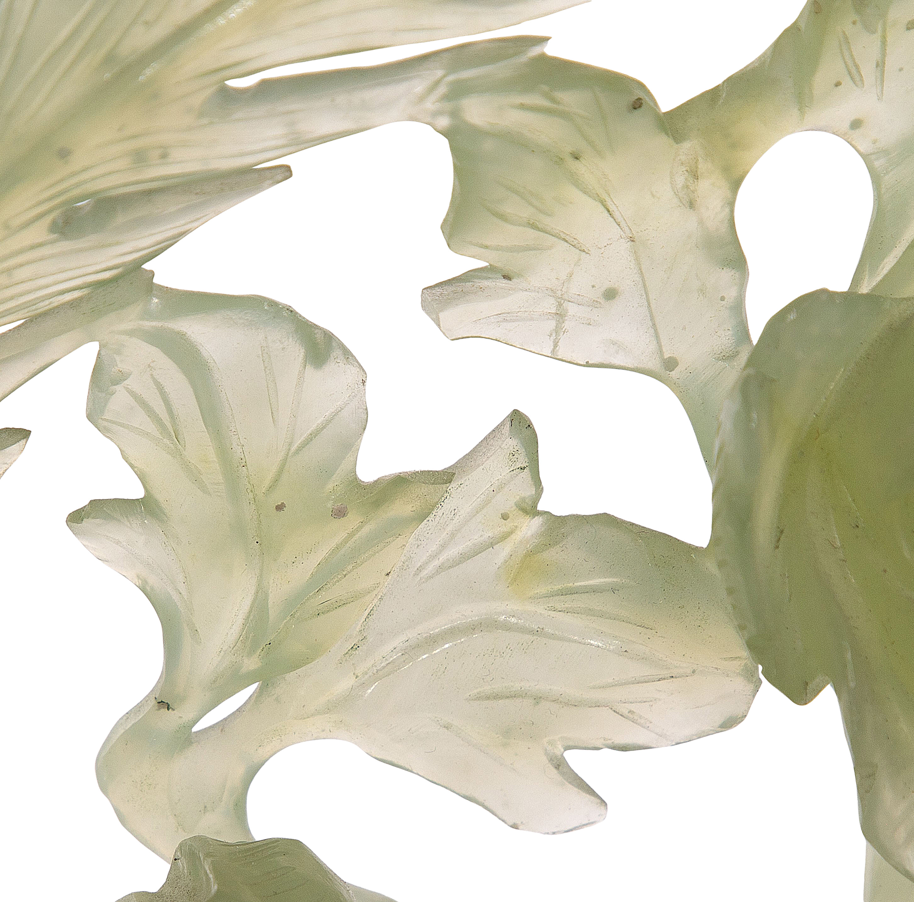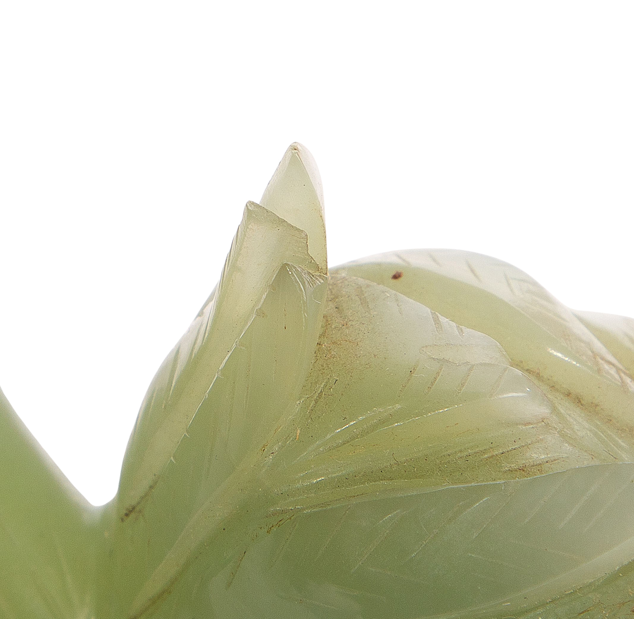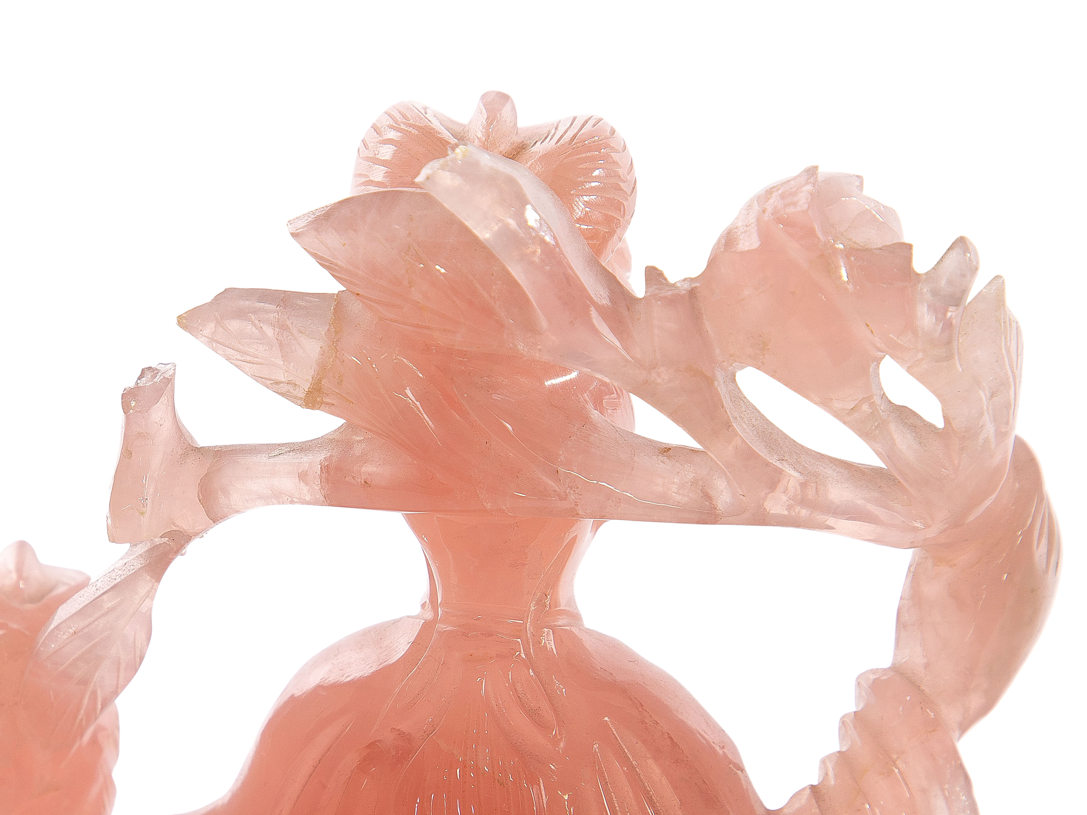 (6) items including a pair of green roosters, a pale green phoenix and foliage on a wood stand, a pink depiction of two female celestials, a pink floral motif lidded urn and a Han style belt hook of tan transitioning to brown mounted as the handle of a mirror having Miao style repousse white metal back