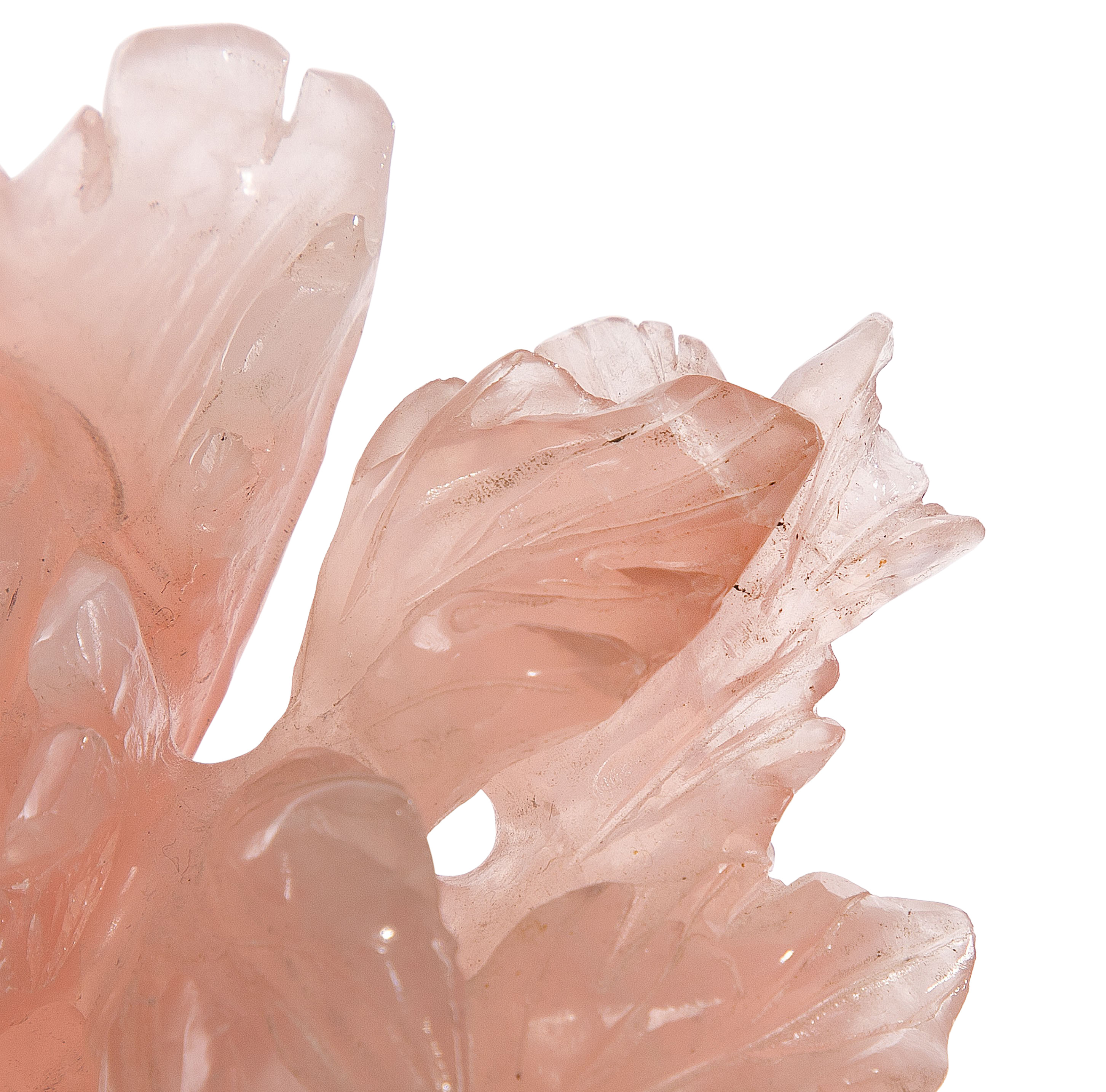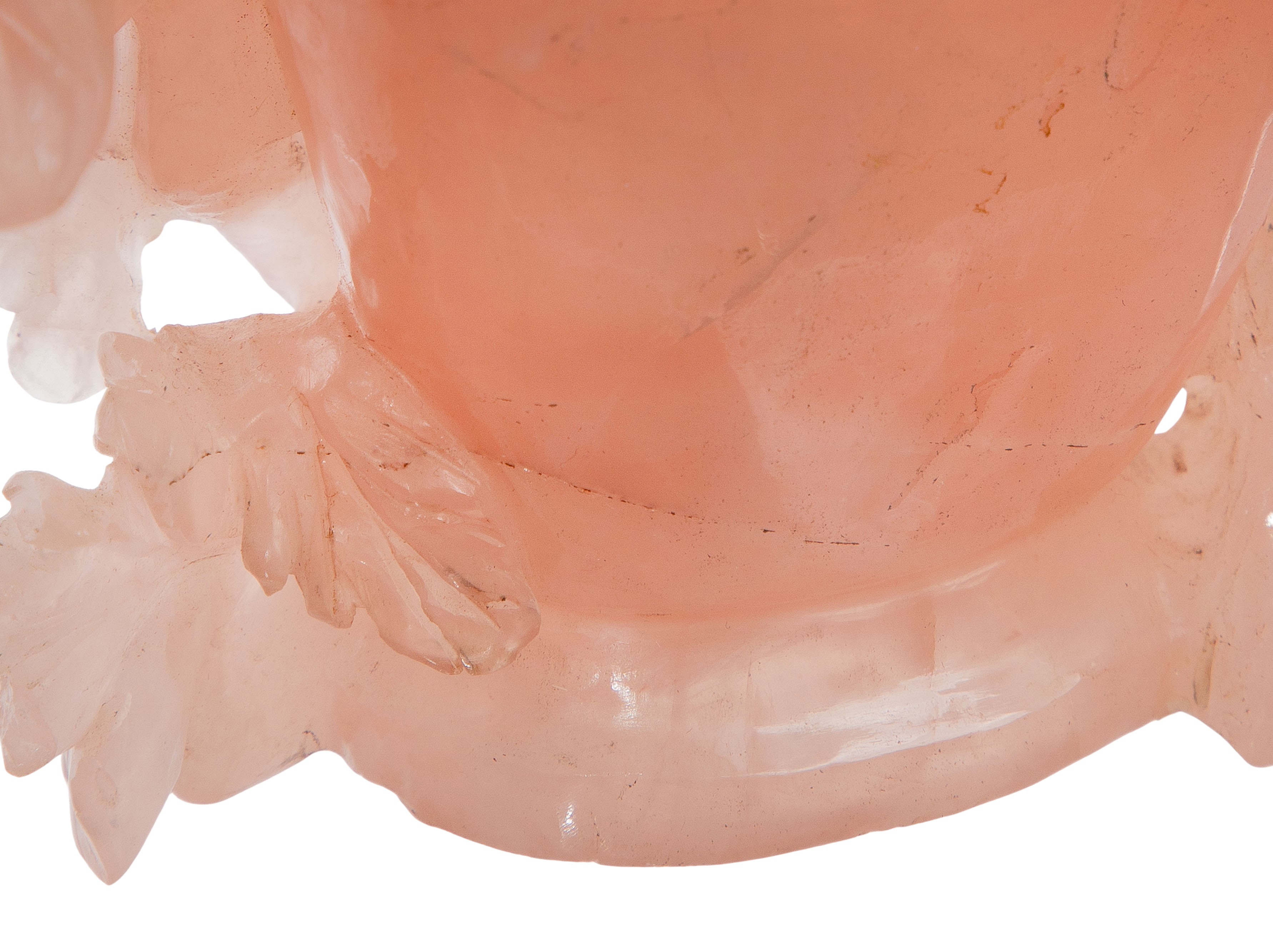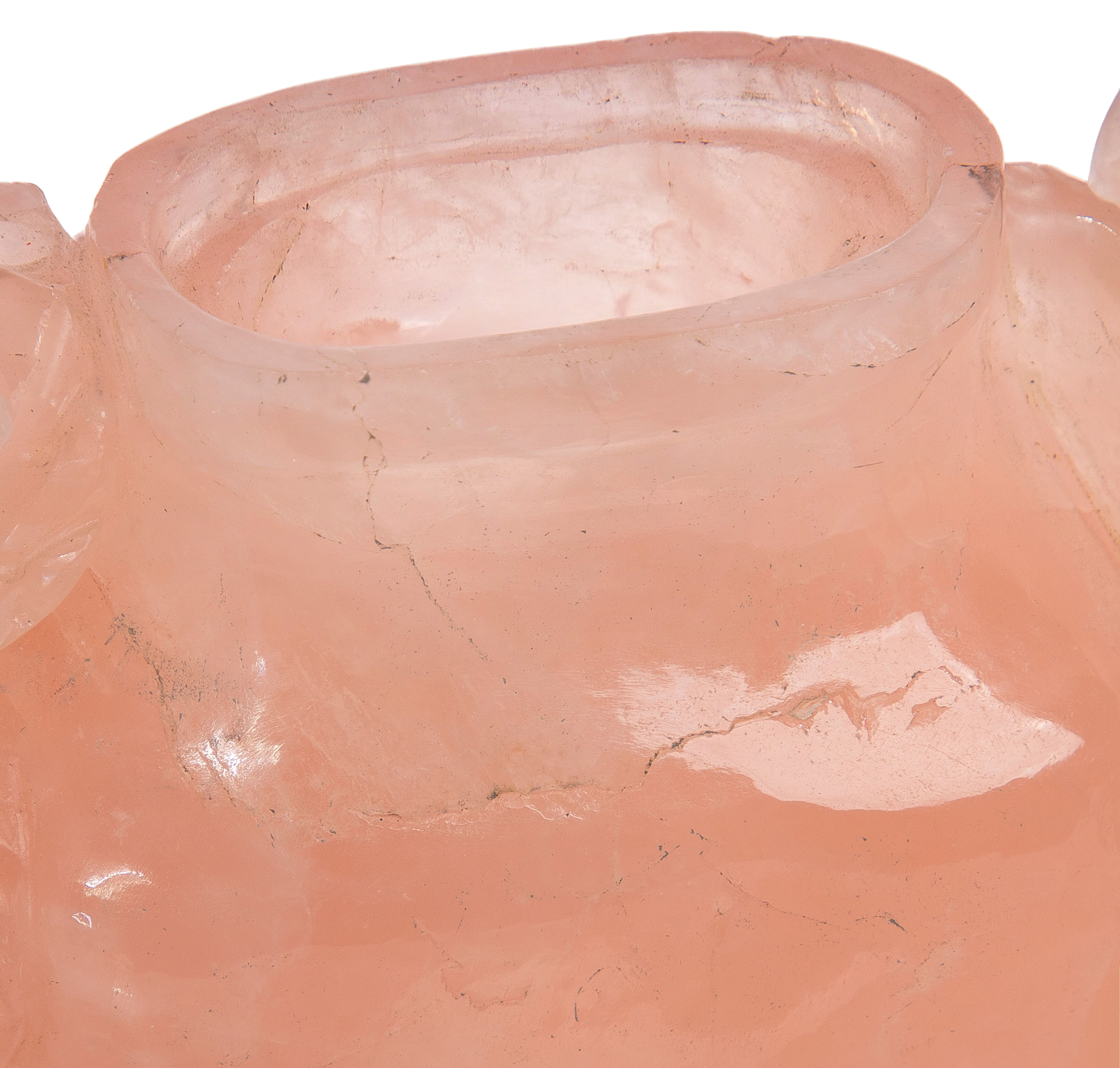 a rooster having a chipped comb, urn having chipped petal, pink females having repaired vine between heads, most having internal flaws, stress cracks