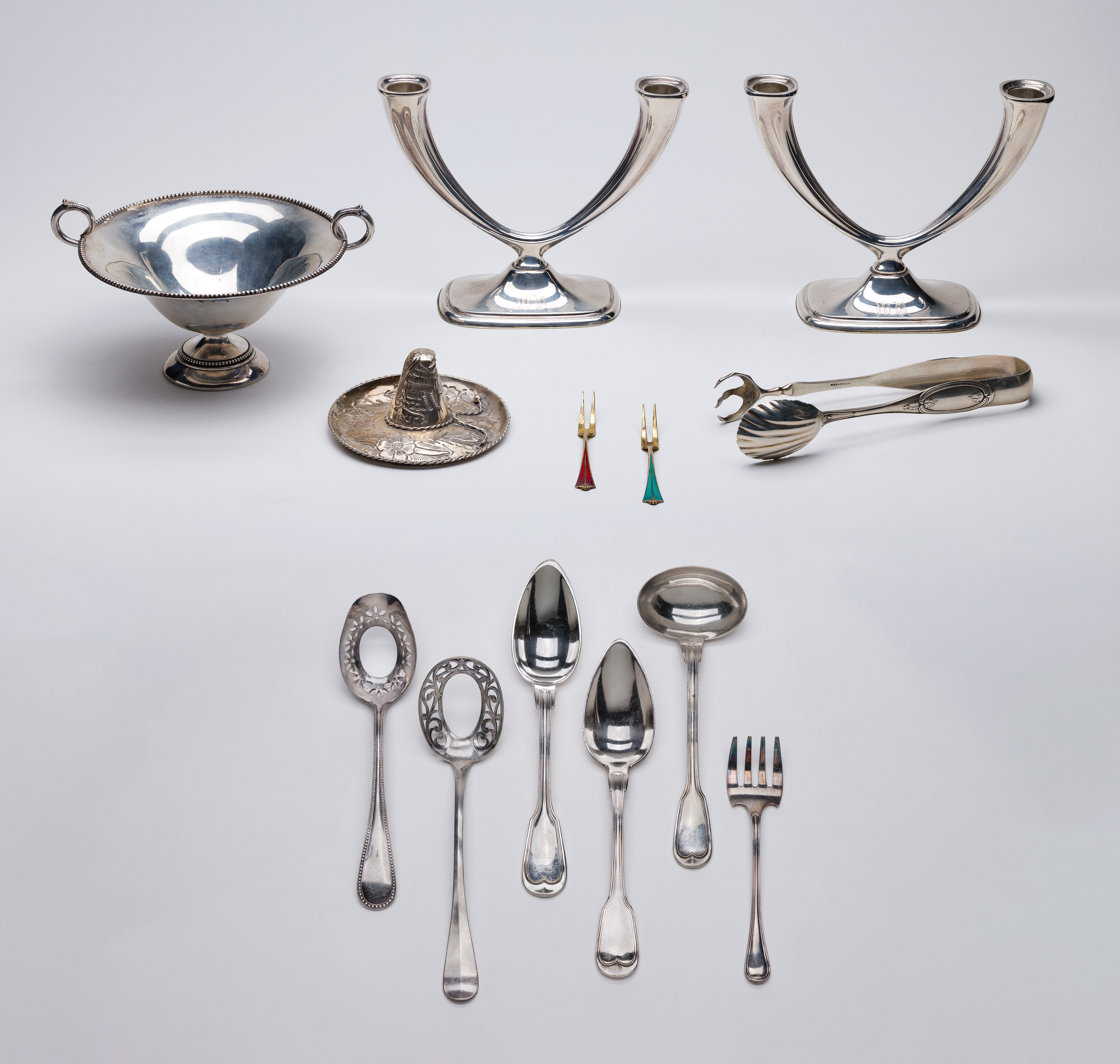(13) total items including an A. Bonebakker & Zoon sterling compote, Tiffany & Co. tongs, Mexican sterling sombrero, Norwegian sterling and enamel forks (marked ‘sterling’ / ‘925’), a pair of Wilkens weighted 0.835 silver candleholders; together with a group of silverplated service items including Christofle