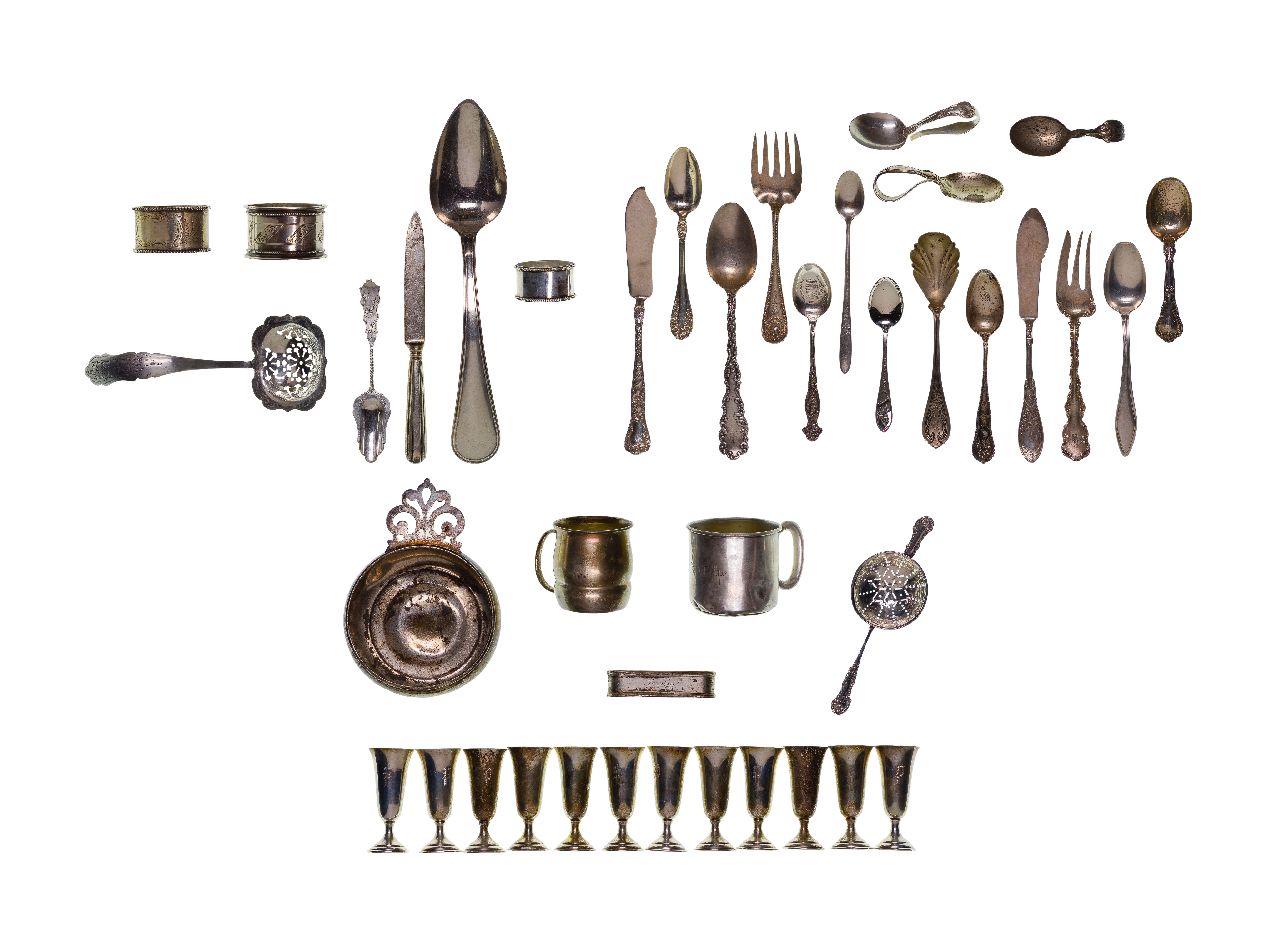 A set of (12) liqueur glasses, (2) mugs, a porridge bowl, tea caddy and various utensils (marked ‘sterling’ / ‘925’); together with various utensils and napkin rings (unmarked 850 and 830 silver)