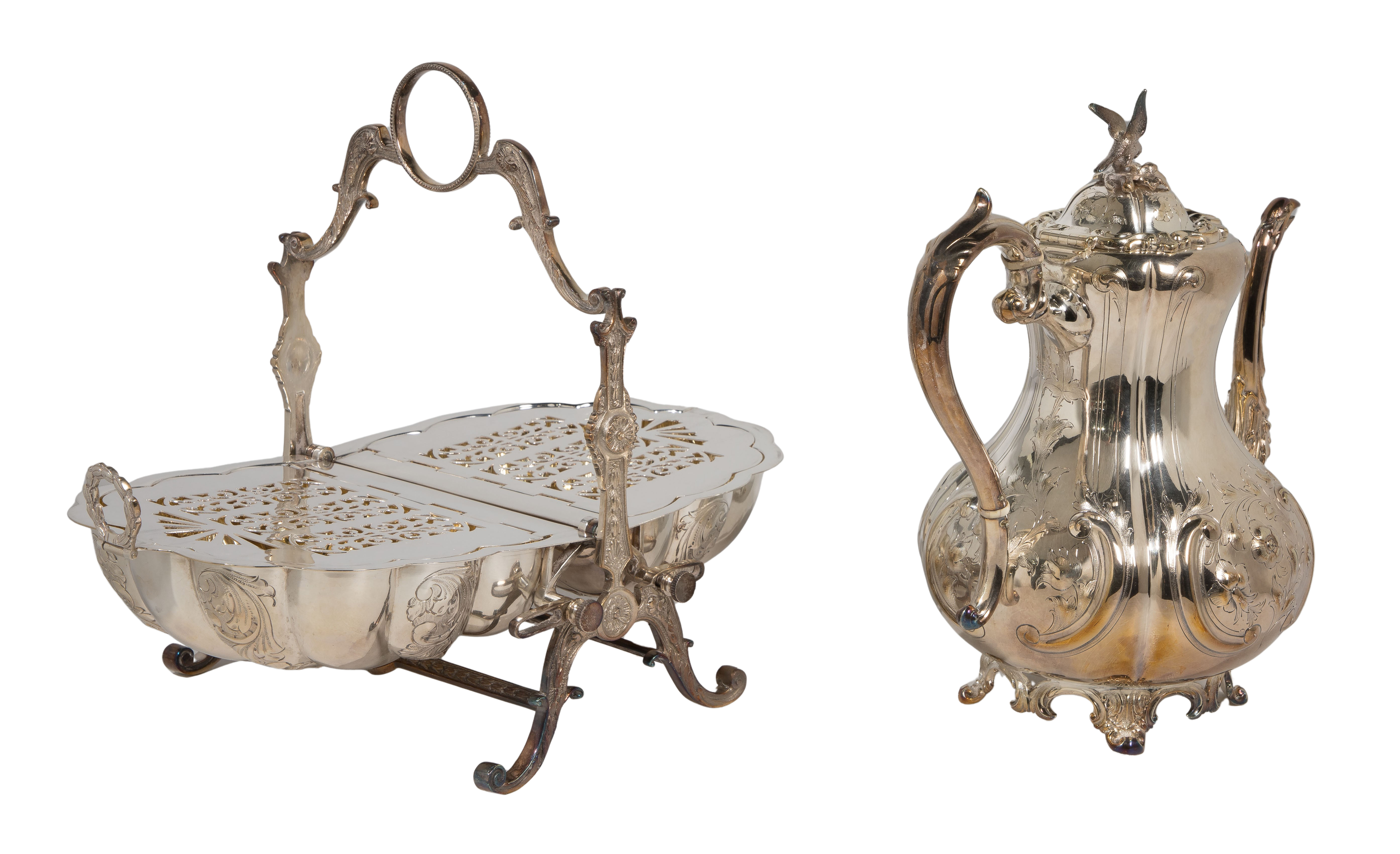 (2) items including a folding clam shell biscuit box having Israel Freeman & Son Ltd. hand and hammer and ‘I.F.S. LTD’ marks stamped on rim of shell and a teapot having a sunburst symbol and trademark for Mappins Brothers underside