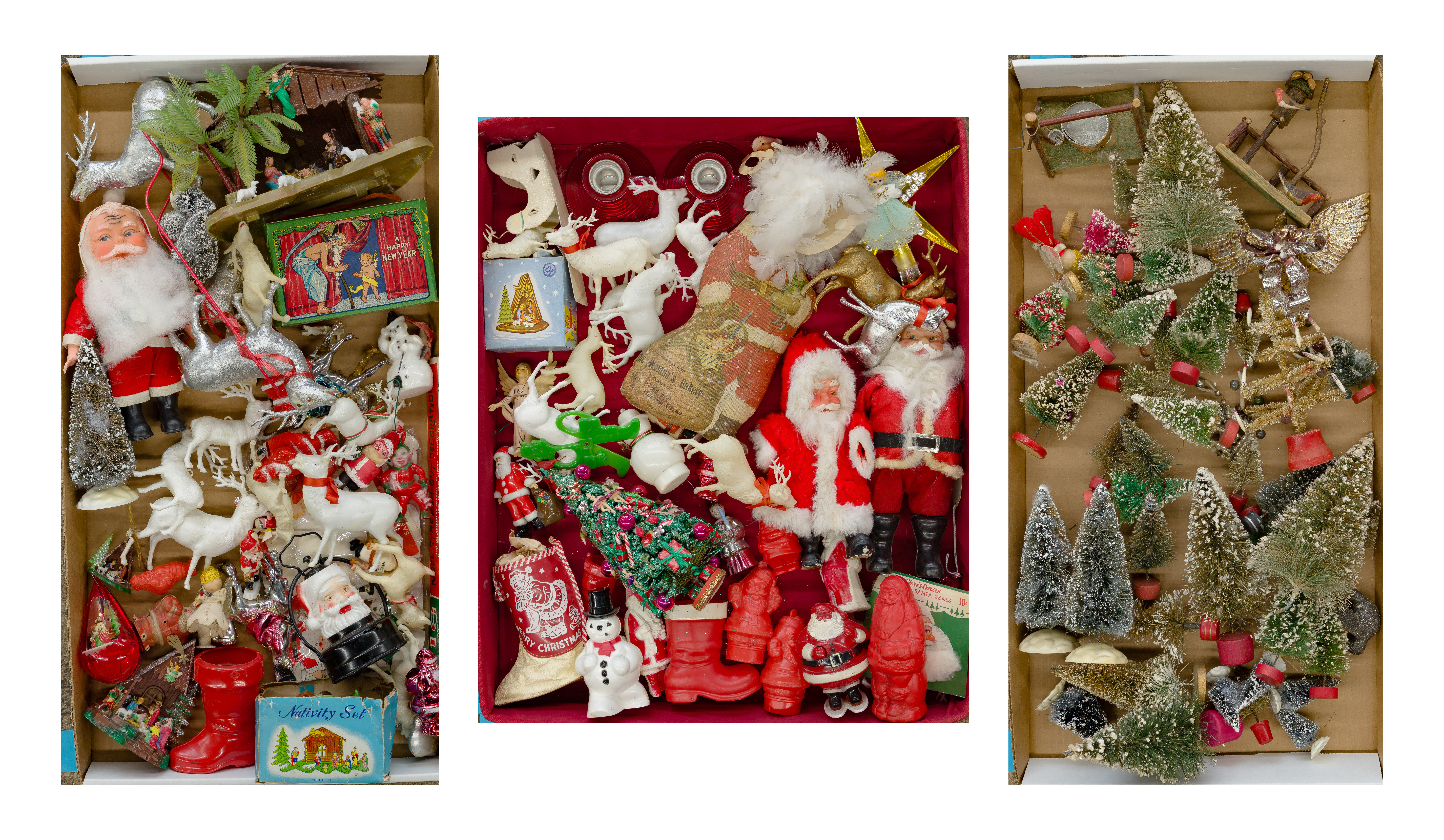 Approximately (60) items including trees, Santa figures, plastic deer and plastic buildings
