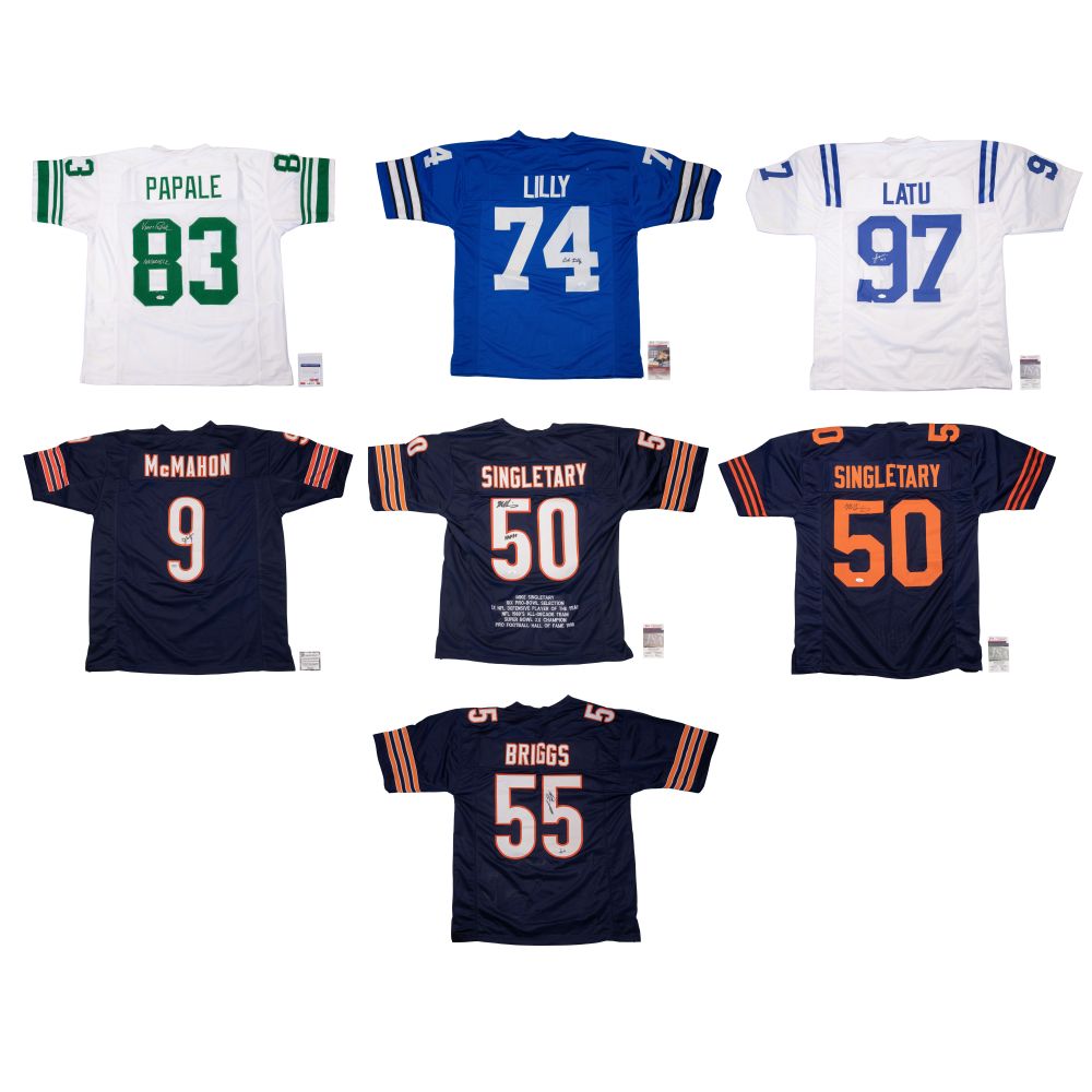 (7) items, most having COAs, including Vince Papale #83 PSA/DNA #8A60777, Bob Lilly #74 JSA #WIT067730, Laiatu Latu #97 JSA #WB567676, Jim McMahon #9 Schwartz Sports unnumbered COA, Mike Singletary #50 JSA #WB169283, Mike Singletary #50 JSA #WB258584 and a Lance Briggs #55 lacking COA