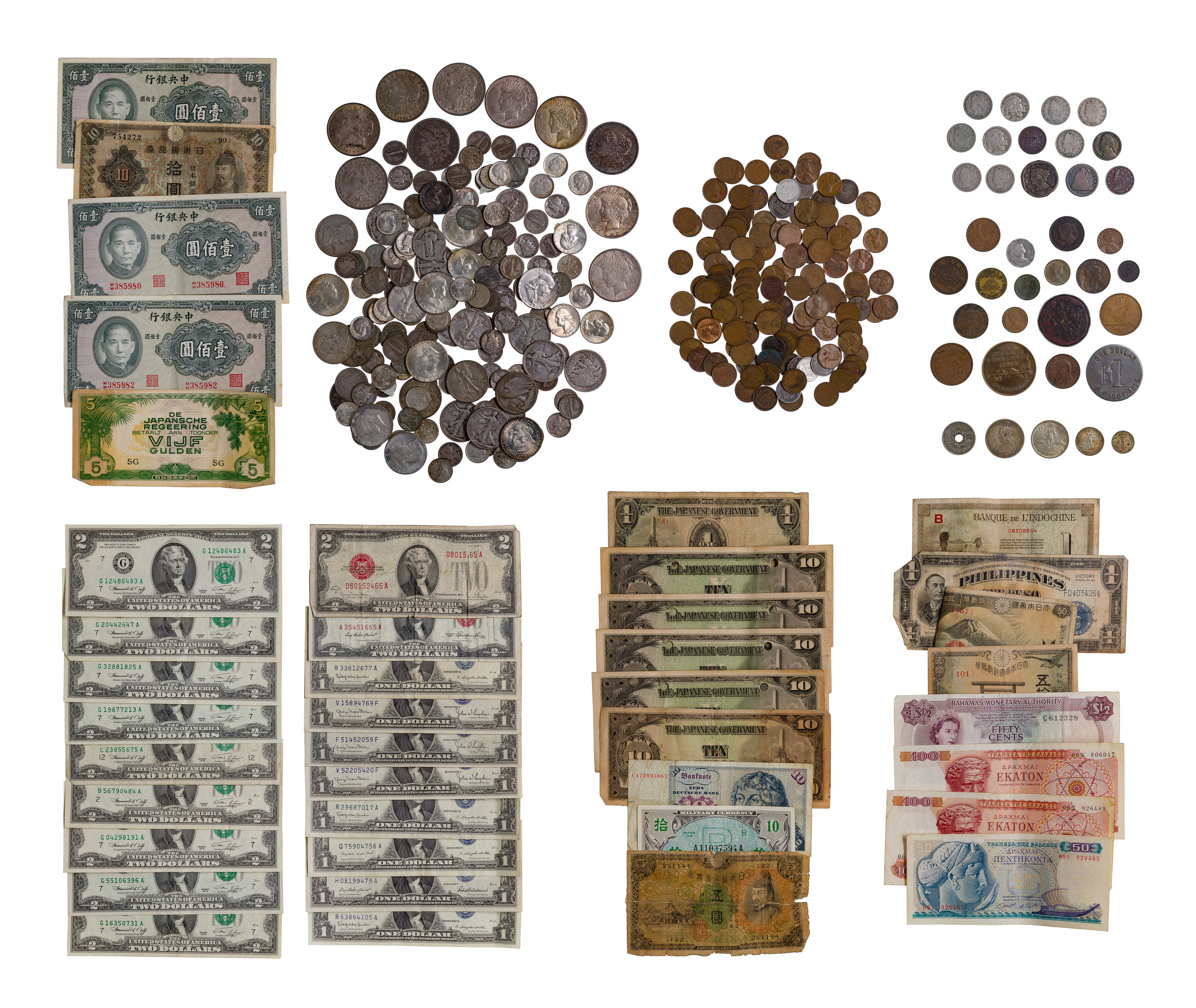 Including $28.00 face value US 90%, (6) Morgan $1, (4) Peace $1, US type coins, Lincoln wheat 1c, silver certificates and red seals, world coins including silver
