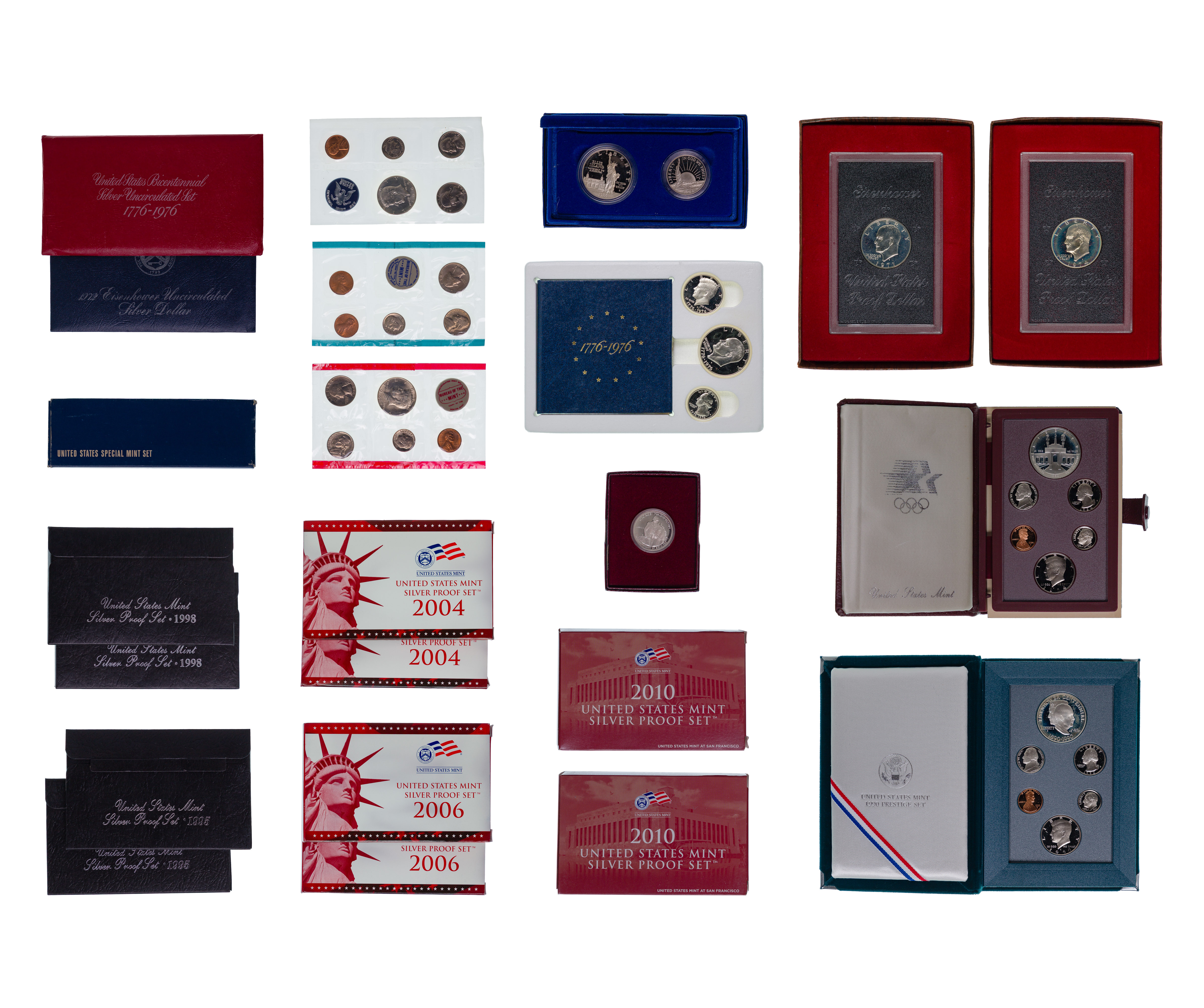 Including (10) silver proof sets, (2) special mint sets, 1969 mint set, (2) Eisenhower $1 brown boxes, Eisenhower $1 blue pack, Bicentennial proof and uncirculated set, Prestige set and (2) silver commemoratives
