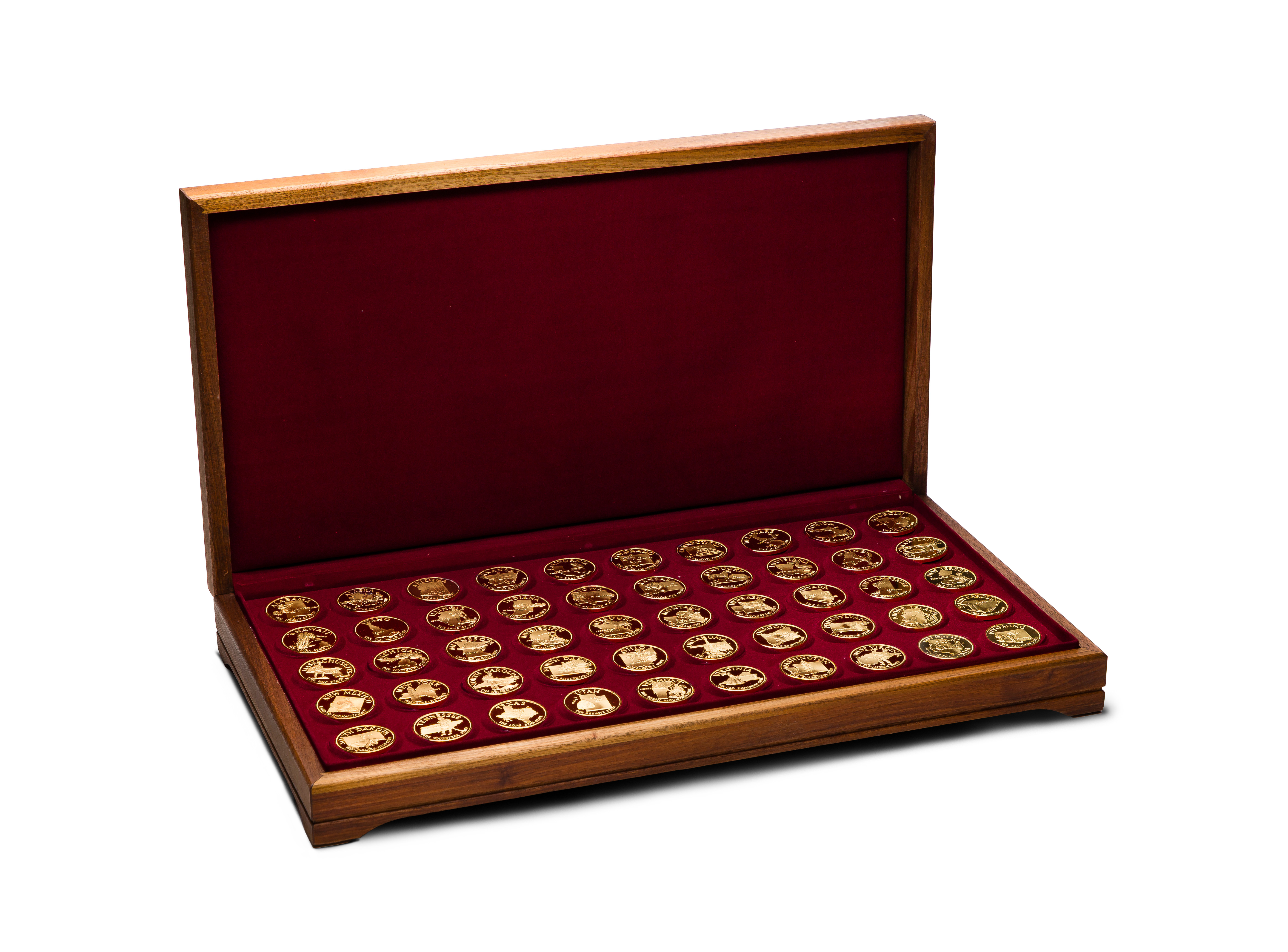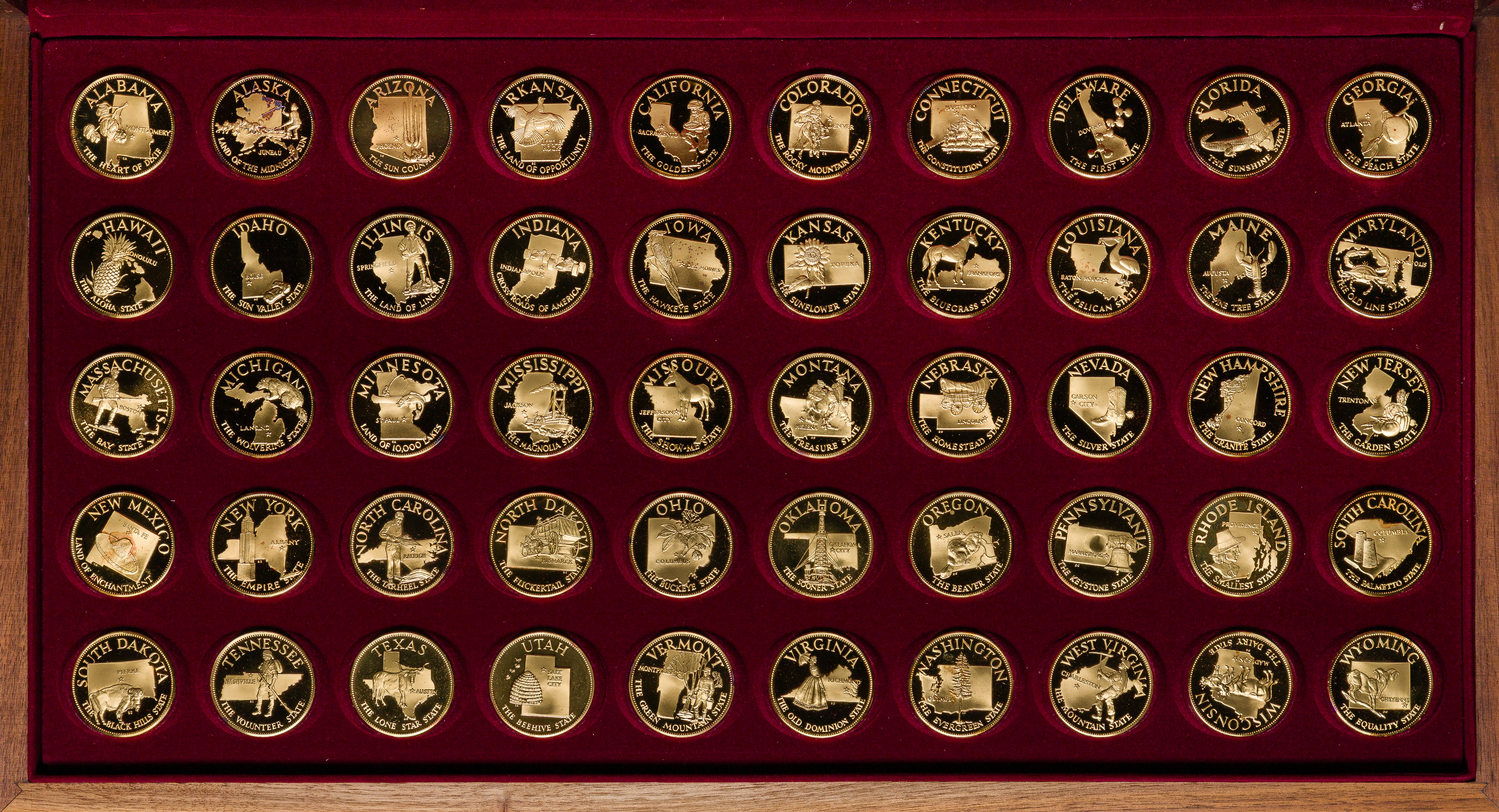 (50) gold plated sterling silver medals, each weighing 500 grains, in wood presentation box
