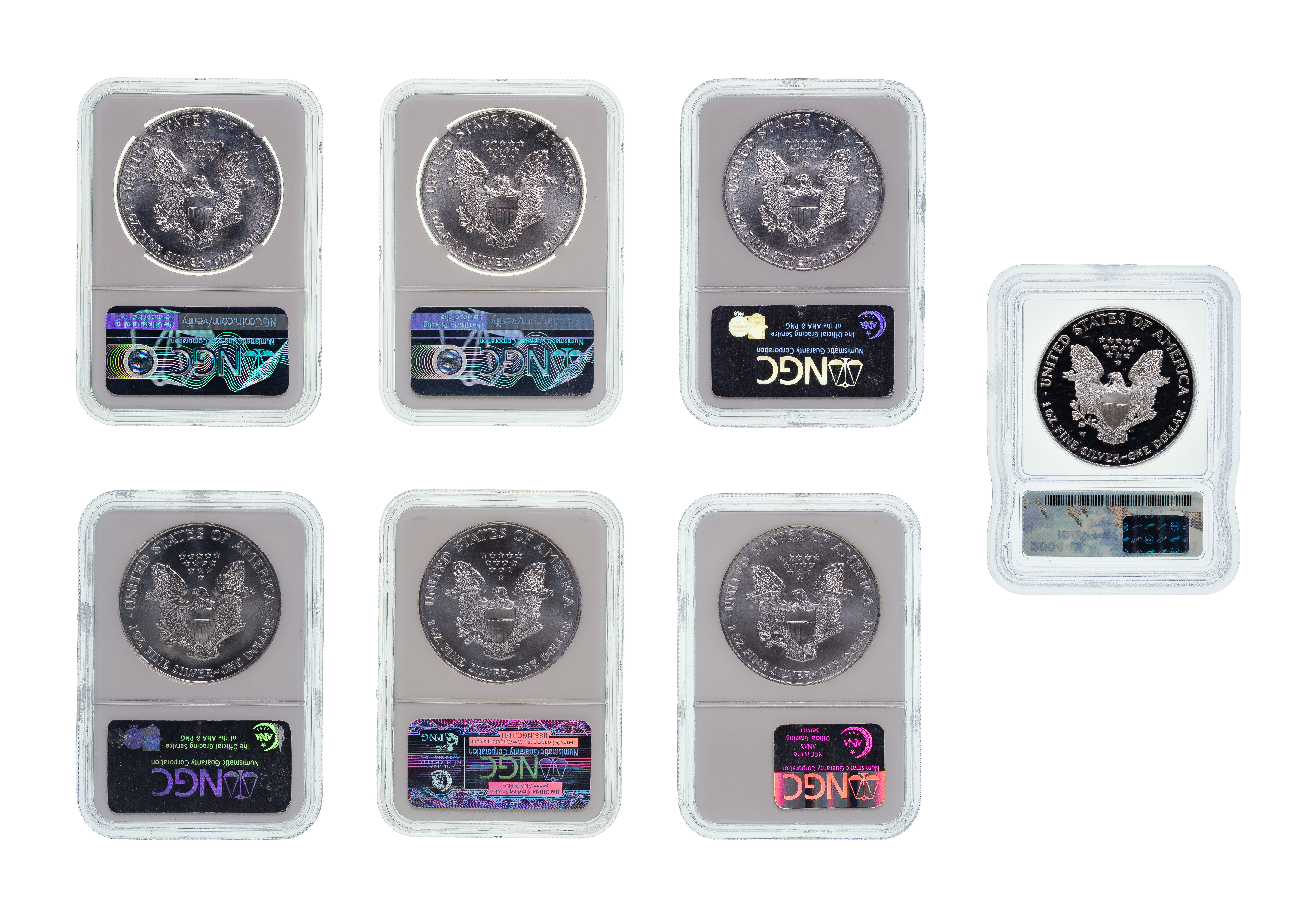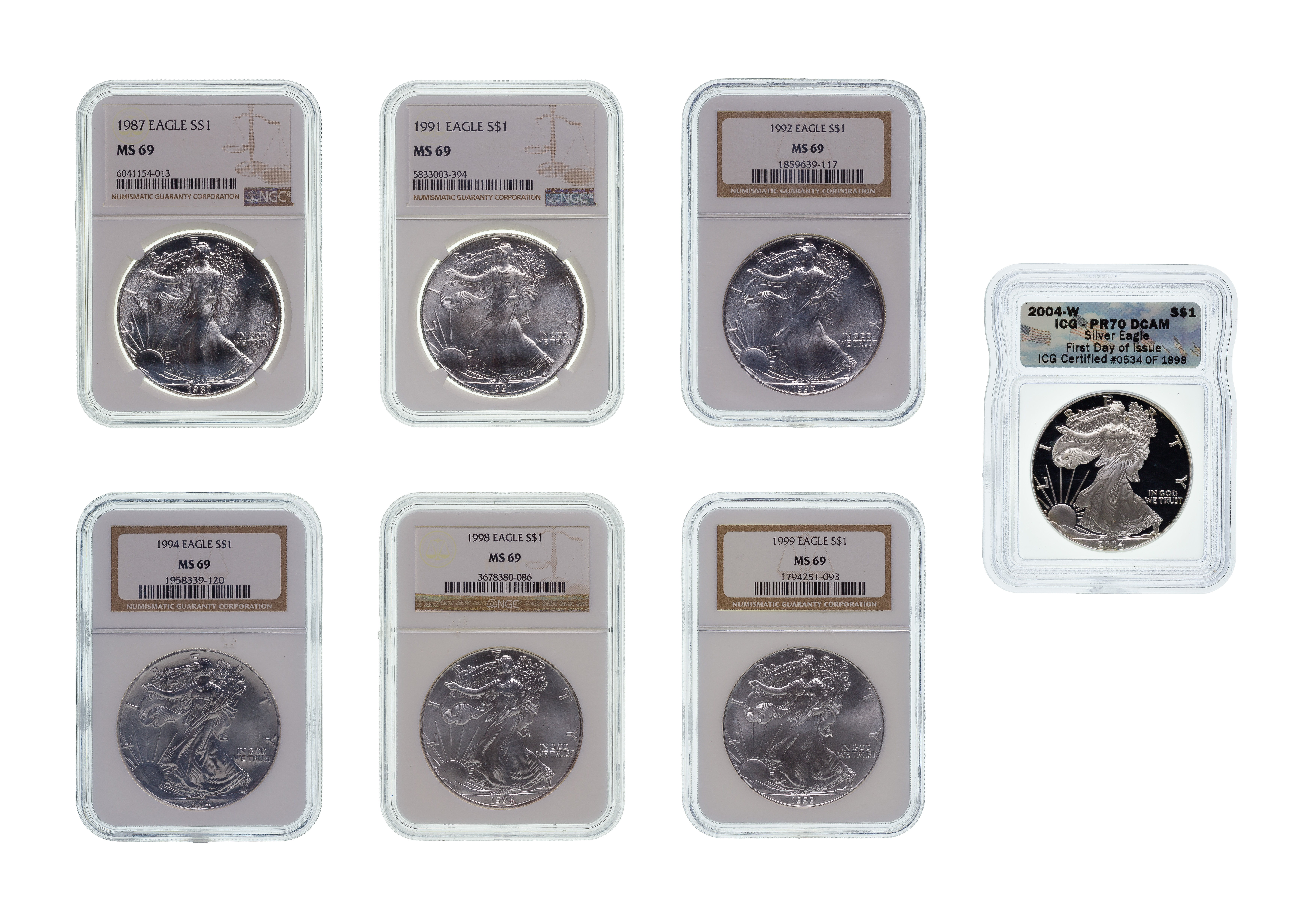 (7) coins including 1987 MS-69 NGC, 1991 MS-69 NGC, 1992 MS-69 NGC, 1994 MS-69 NGC, 1998 MS-69 NGC, 1999 MS-69 NGC and 2004-W PR-70 DCAM ICG
