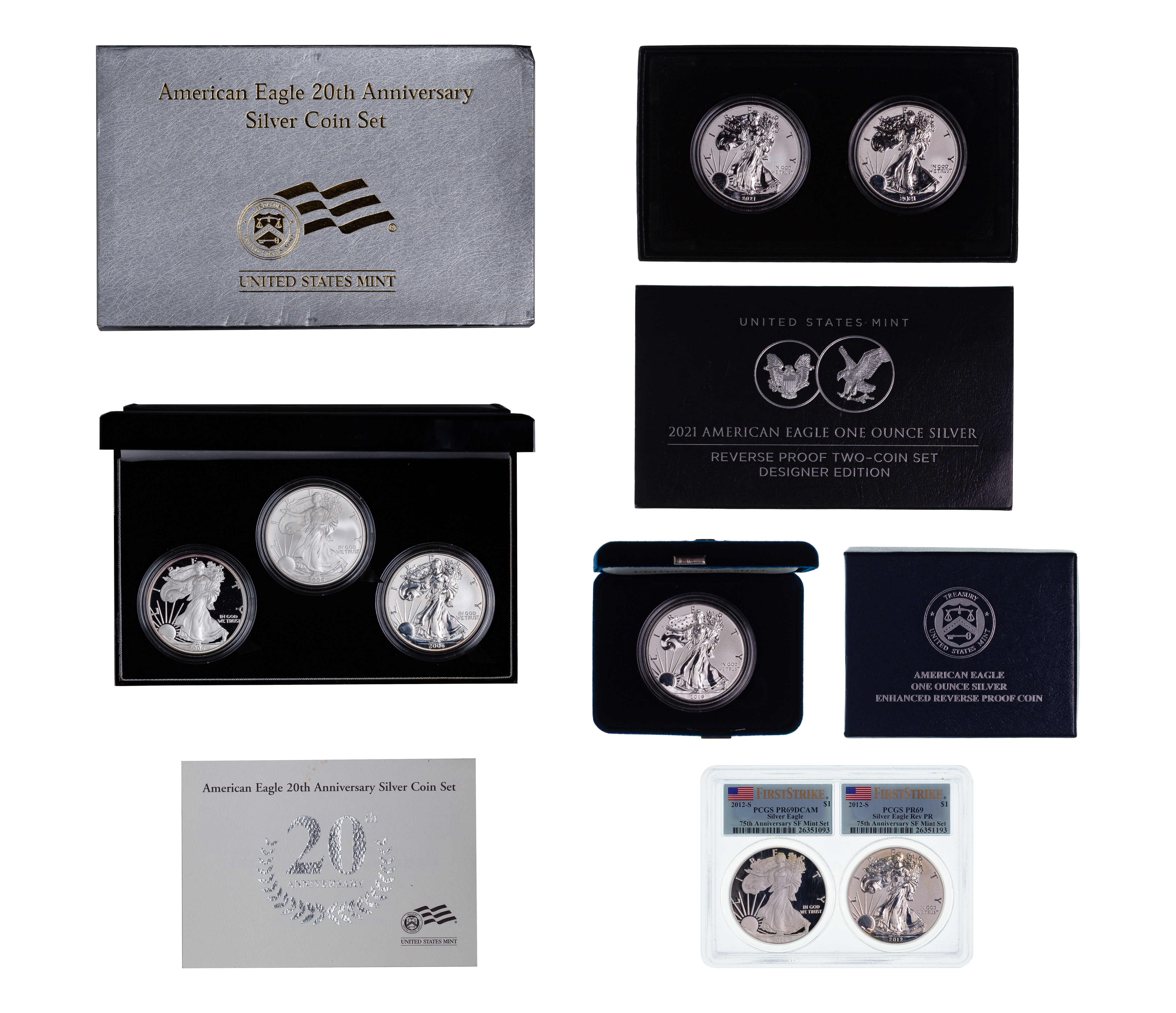 Including 2006 20th Anniversary set, 2012-S 75th Anniversary Mint Set PF-69 PCGS, 2019 Enhanced Reverse proof and 2021 Reverse Proof two-coin set