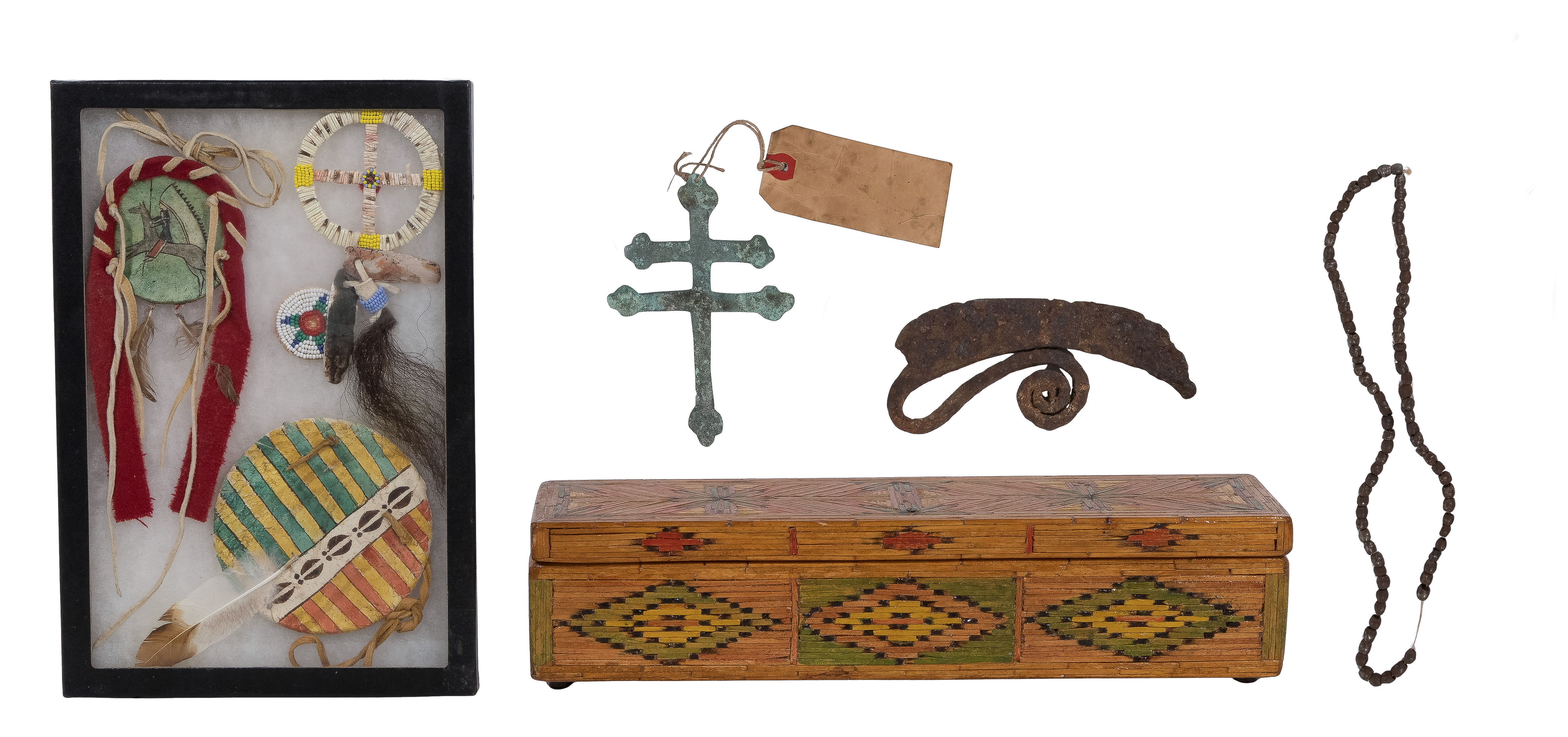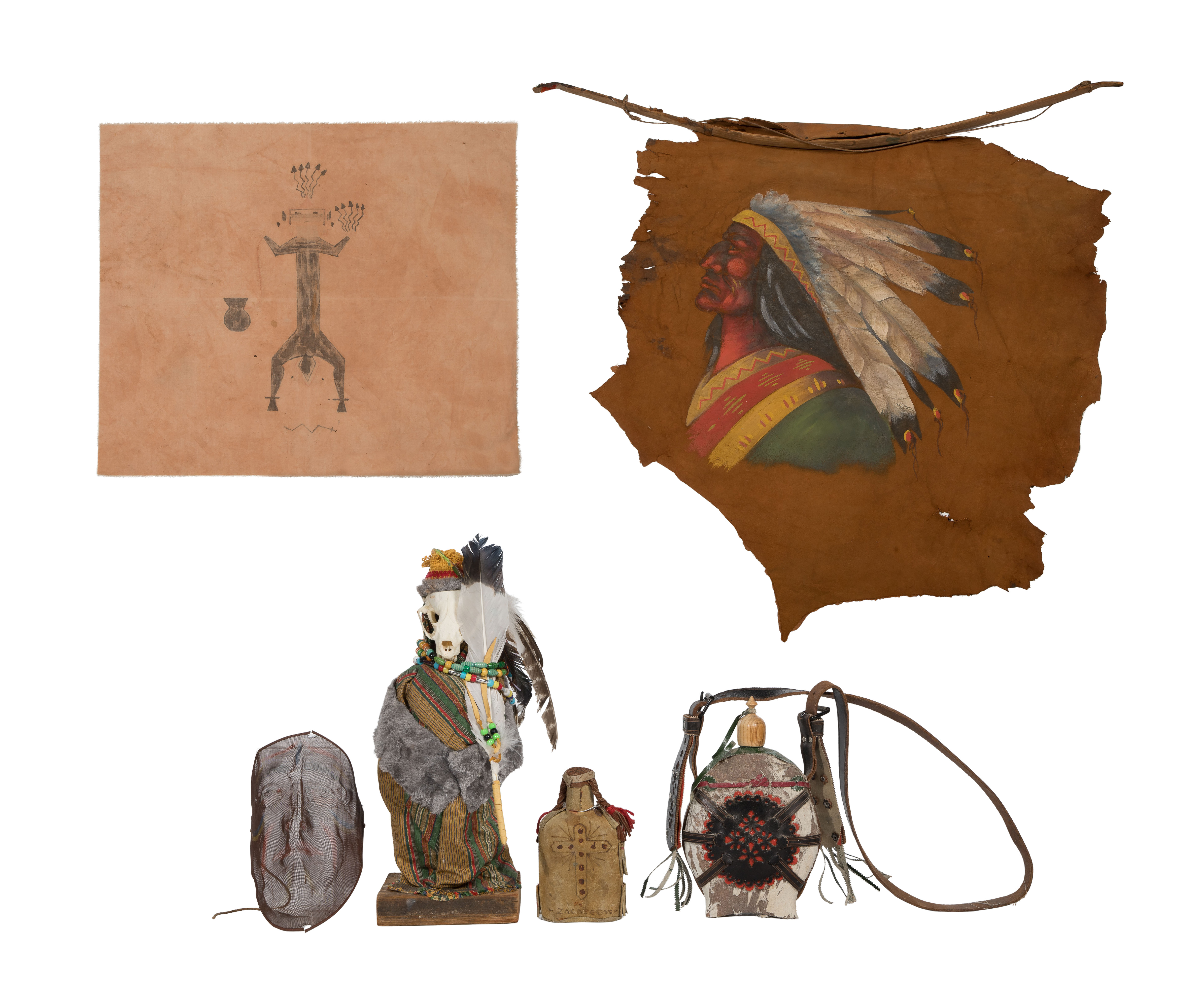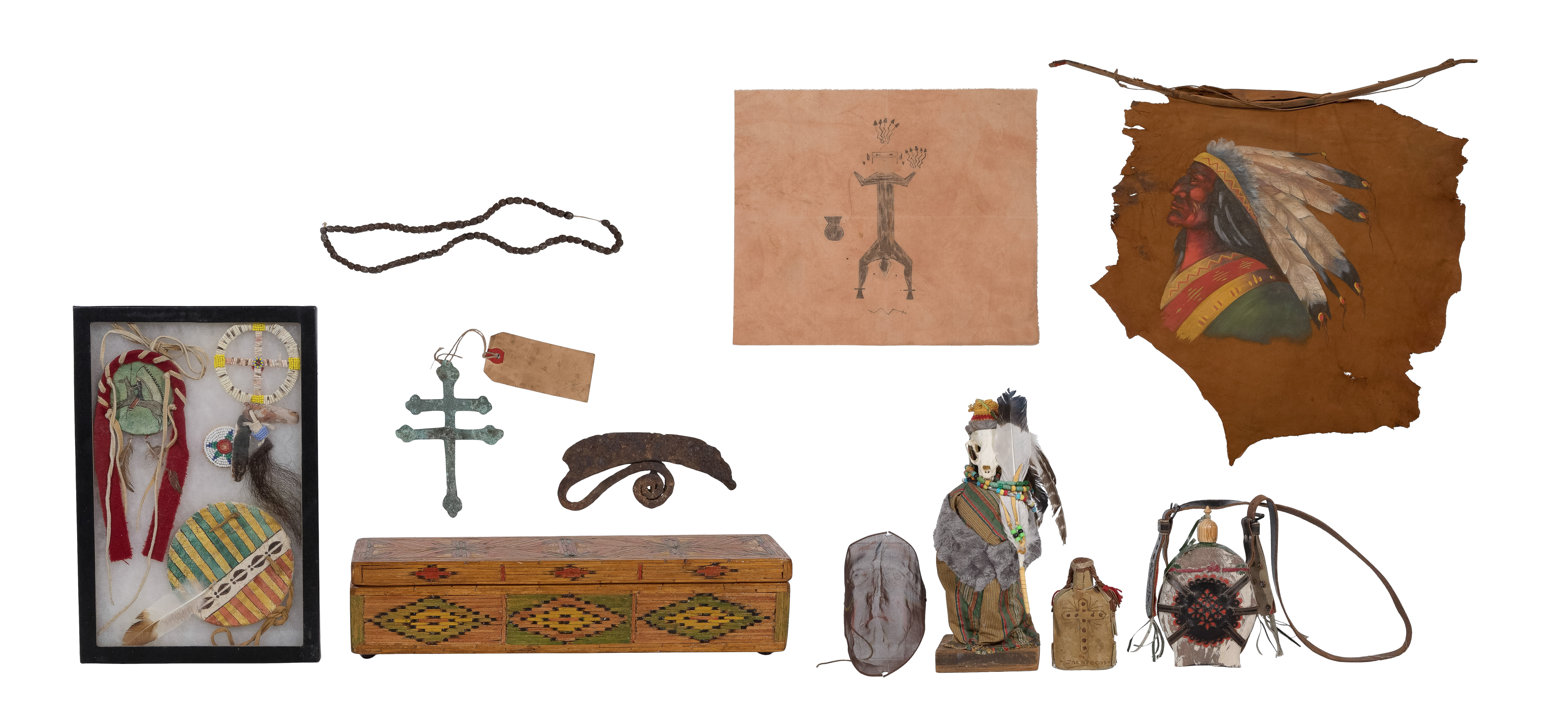 (11) total items including metal trade beads, an Ulu knife, Lakota copper trade cross, a matchstick box, a display case having various accessories, a Zapotec bottle doll, a painted screen style mask, a painted hide wall hanging, an abstract skull sculpture and a piece of painted cloth; together with a Hungarian style canteen