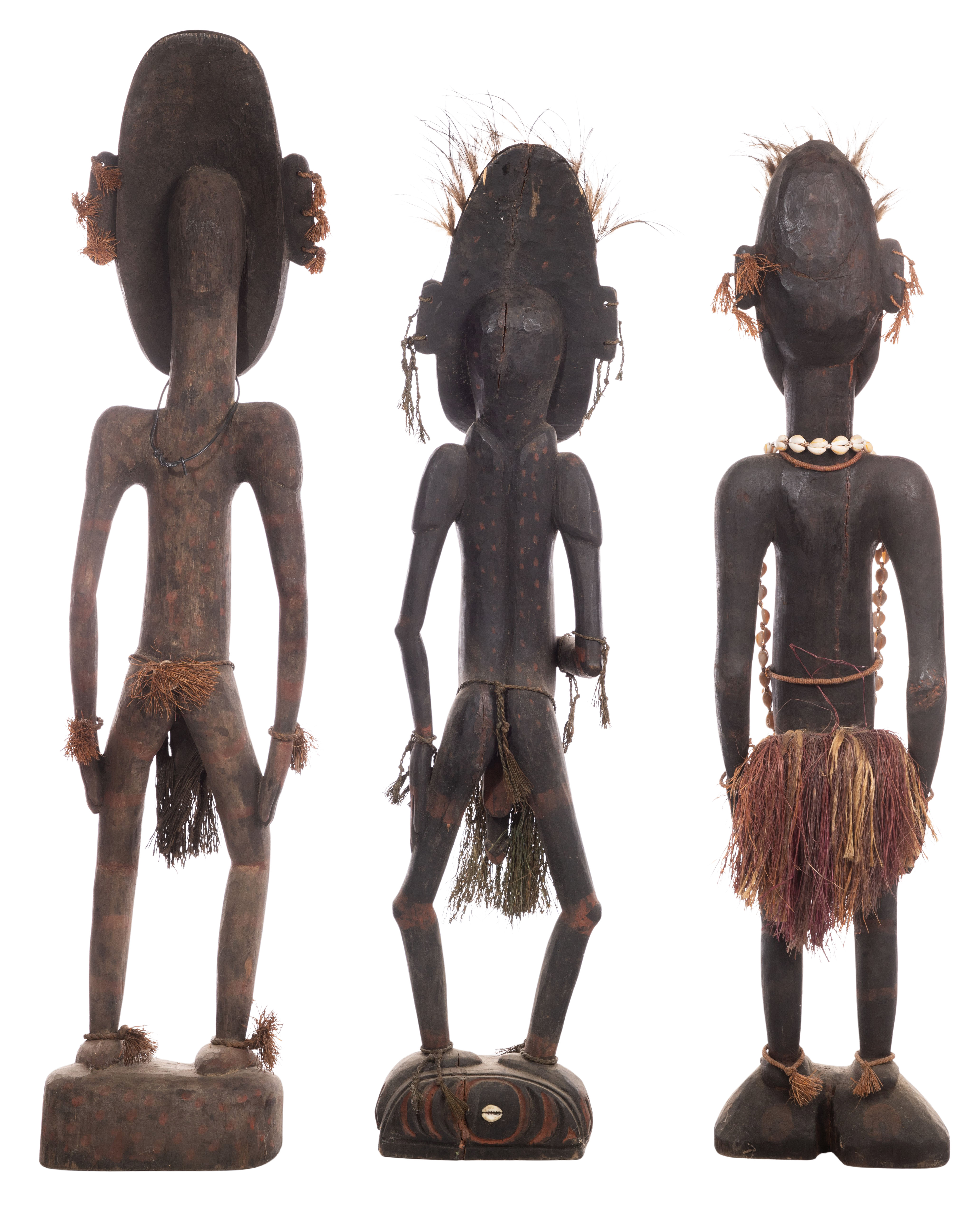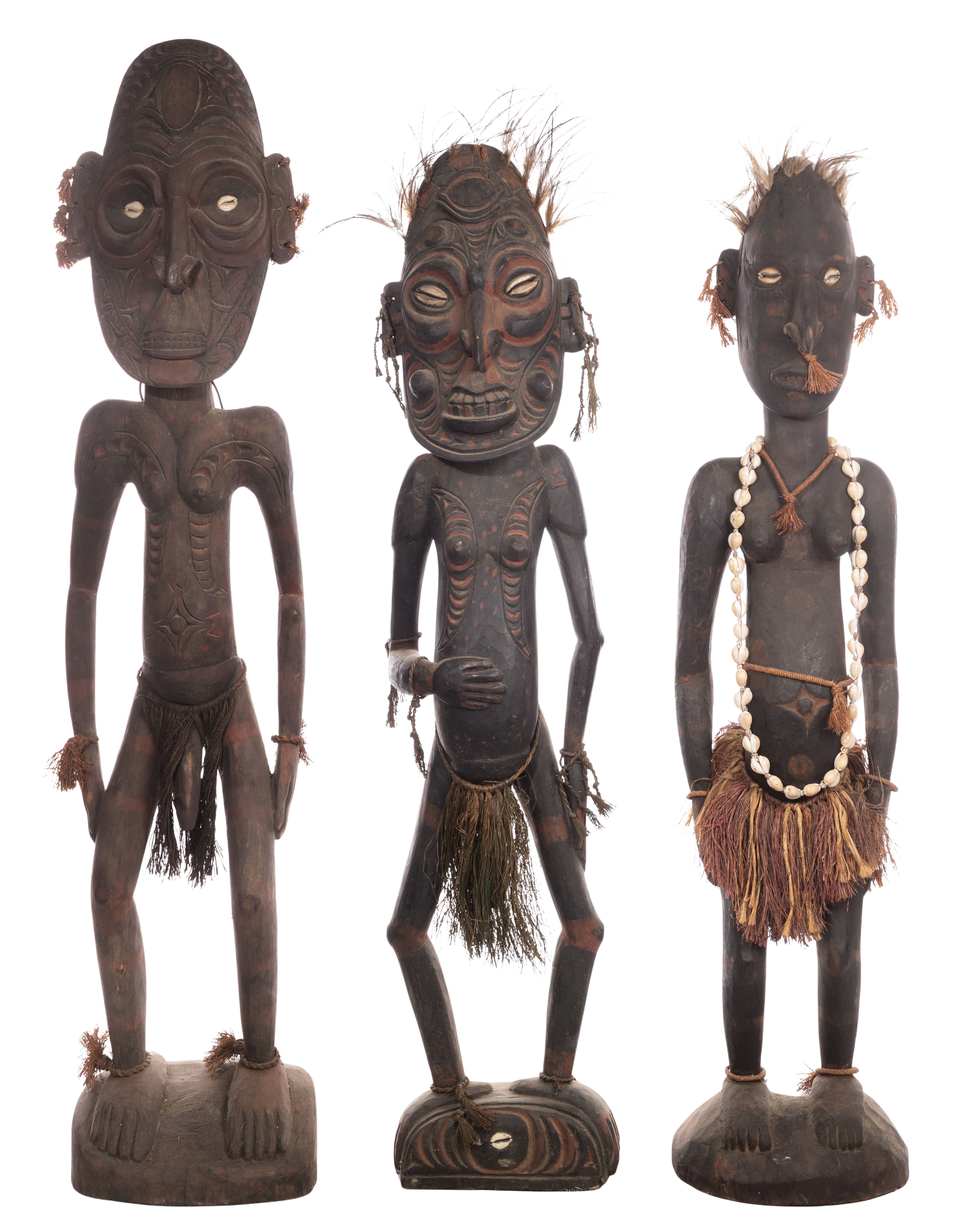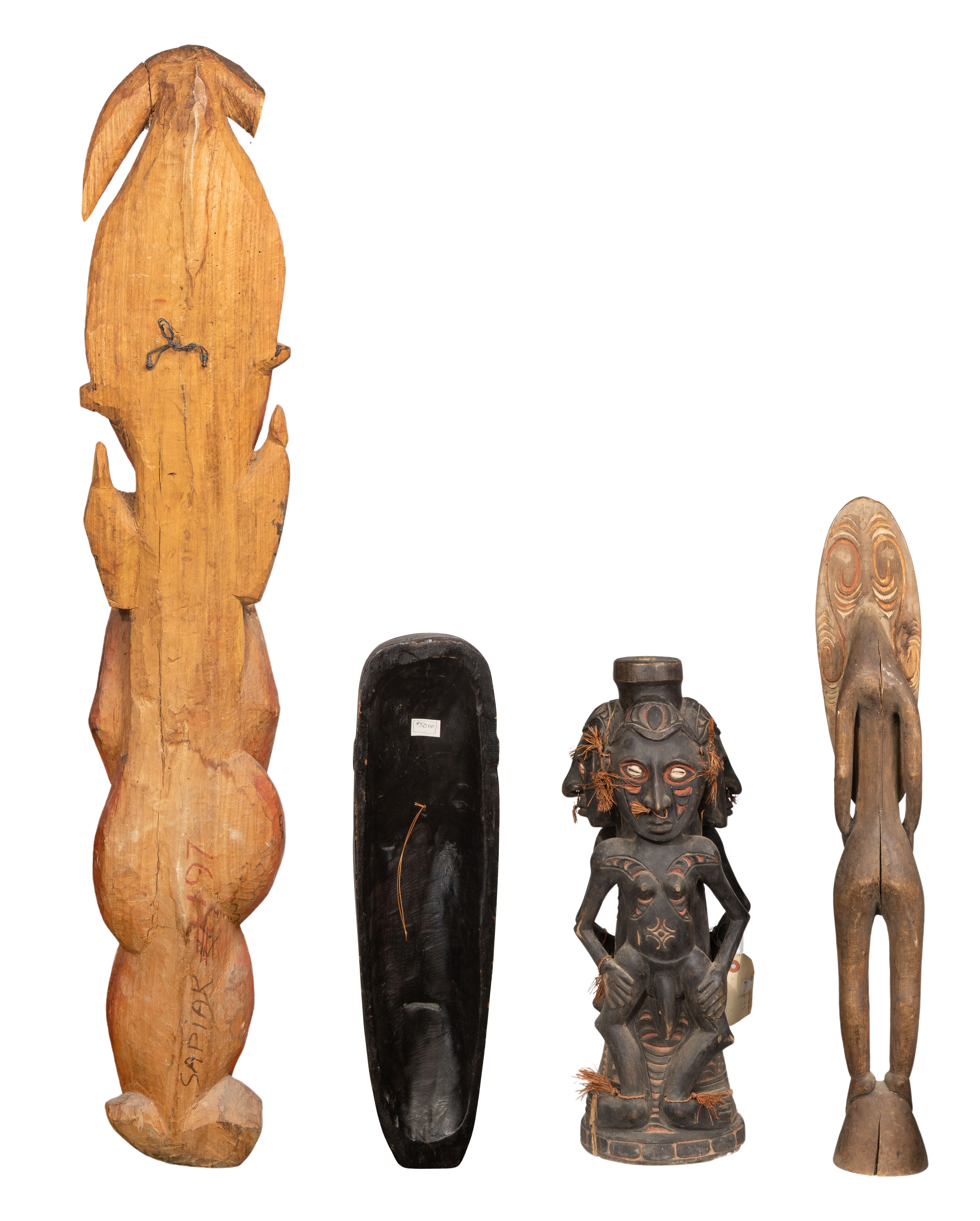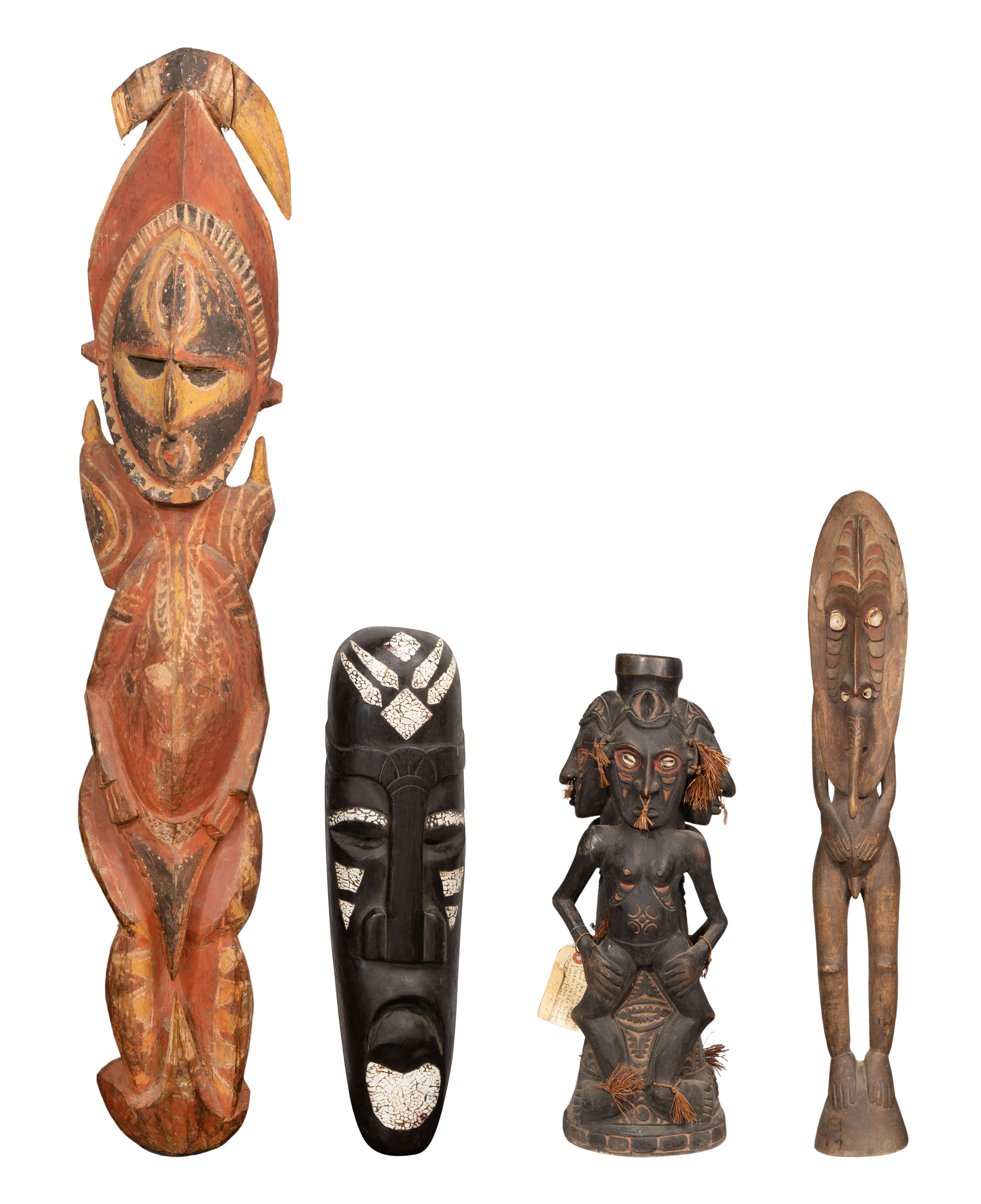 (7) items including Papua New Guinea Wood Sculpture Sepik River style having cowrie shell and fiber attachments, including a male and (2) females having feathered headdresses as well as (2) carved fertility figures, a painted wall hanging and a mask