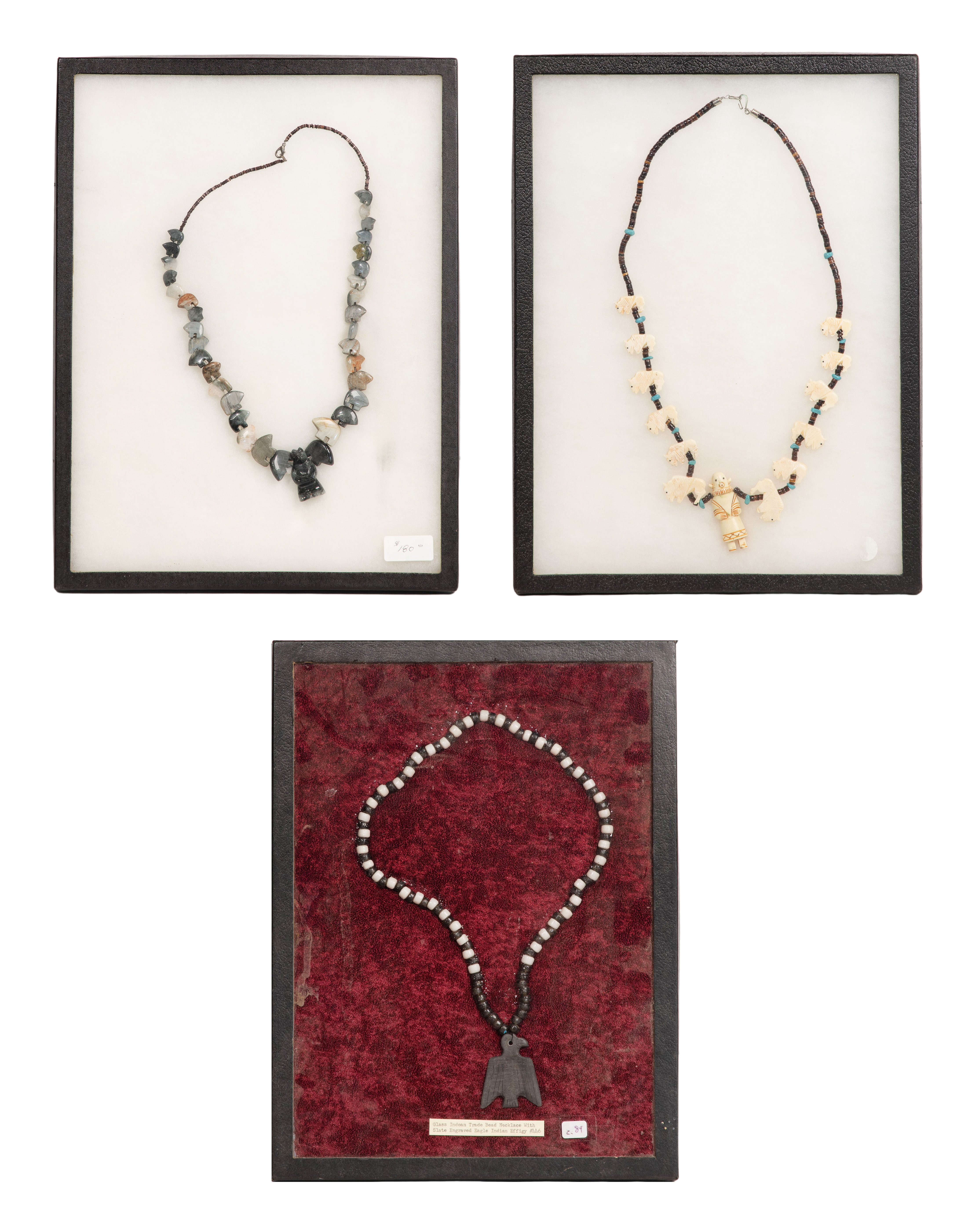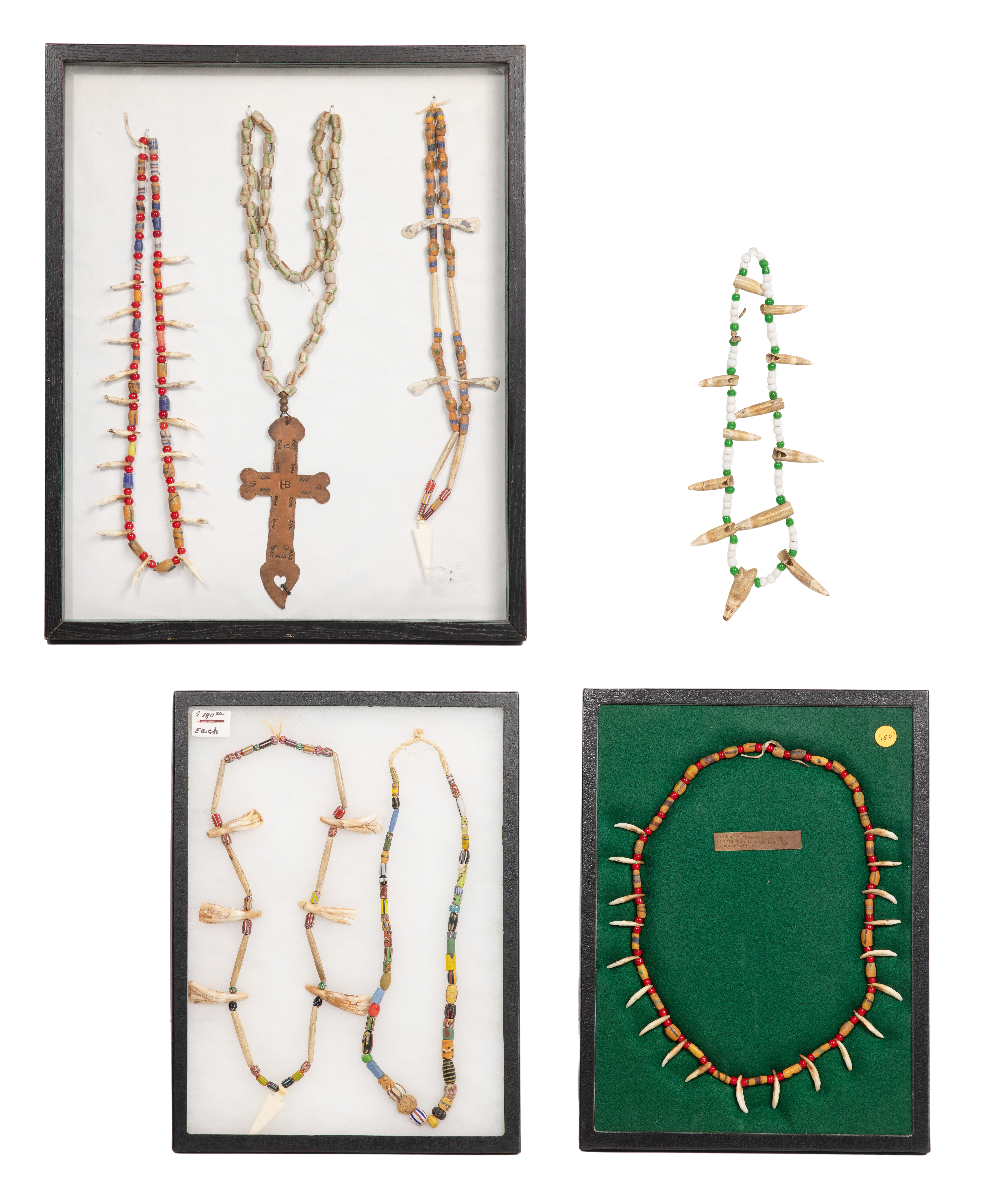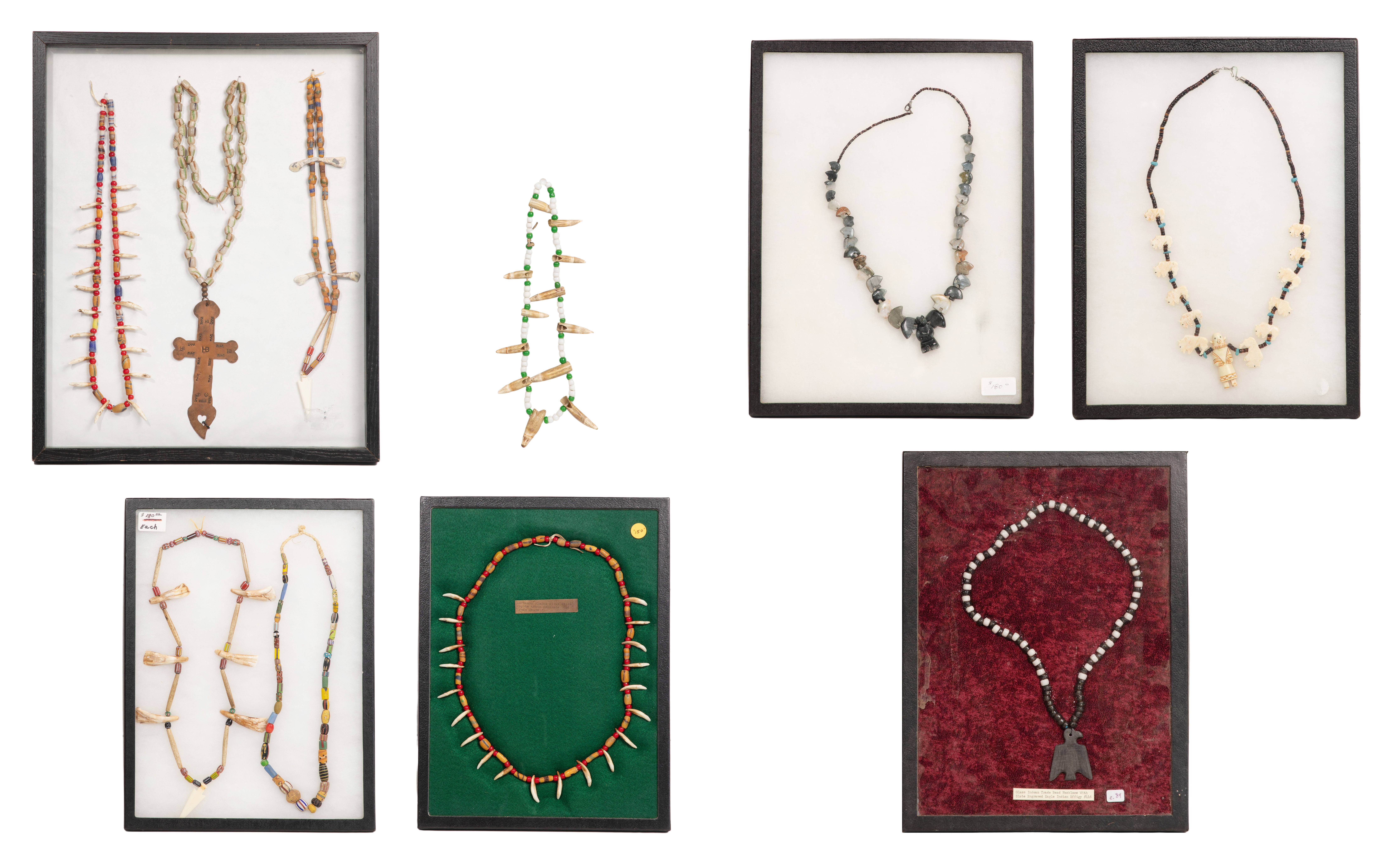 (10) items having trade beads and ornaments, (5) having animal tooth beads including a Northwest Coast style (bagged) having whale teeth, (2) Plains style having bison teeth, tube beads and arrowhead-shaped bone pendants and (2) having coyote teeth as well as a Hudson Bay copper crucifix (stamped ‘HB’ and ‘Quebec’) on a string of trade beads, a string of trade beads, a Zuni style bone bison fetish and kachina pendant necklace, a carved stone bear fetish necklace and a string of trade beads having a carved and engraved slate eagle pendant, including frames / cases