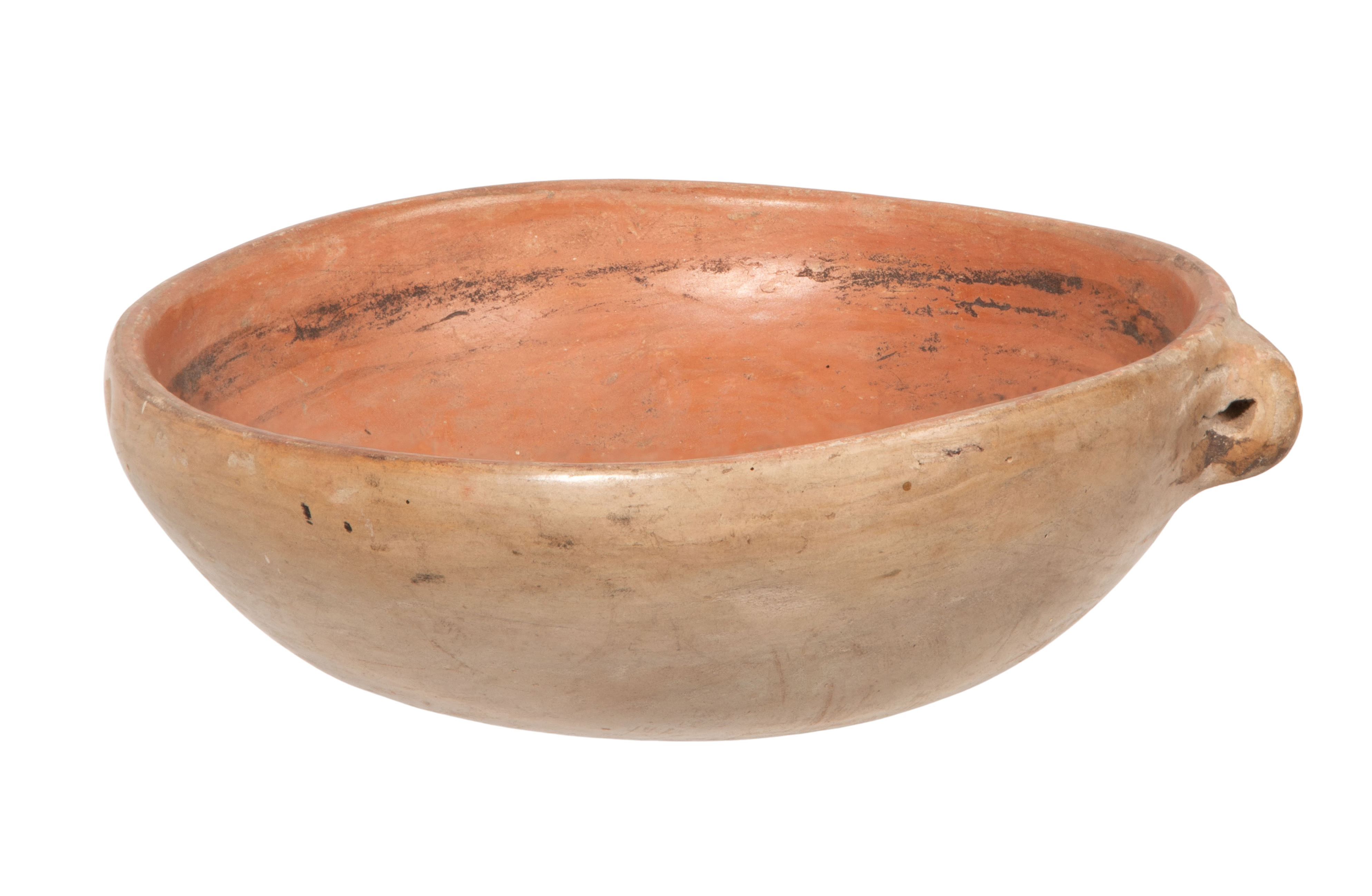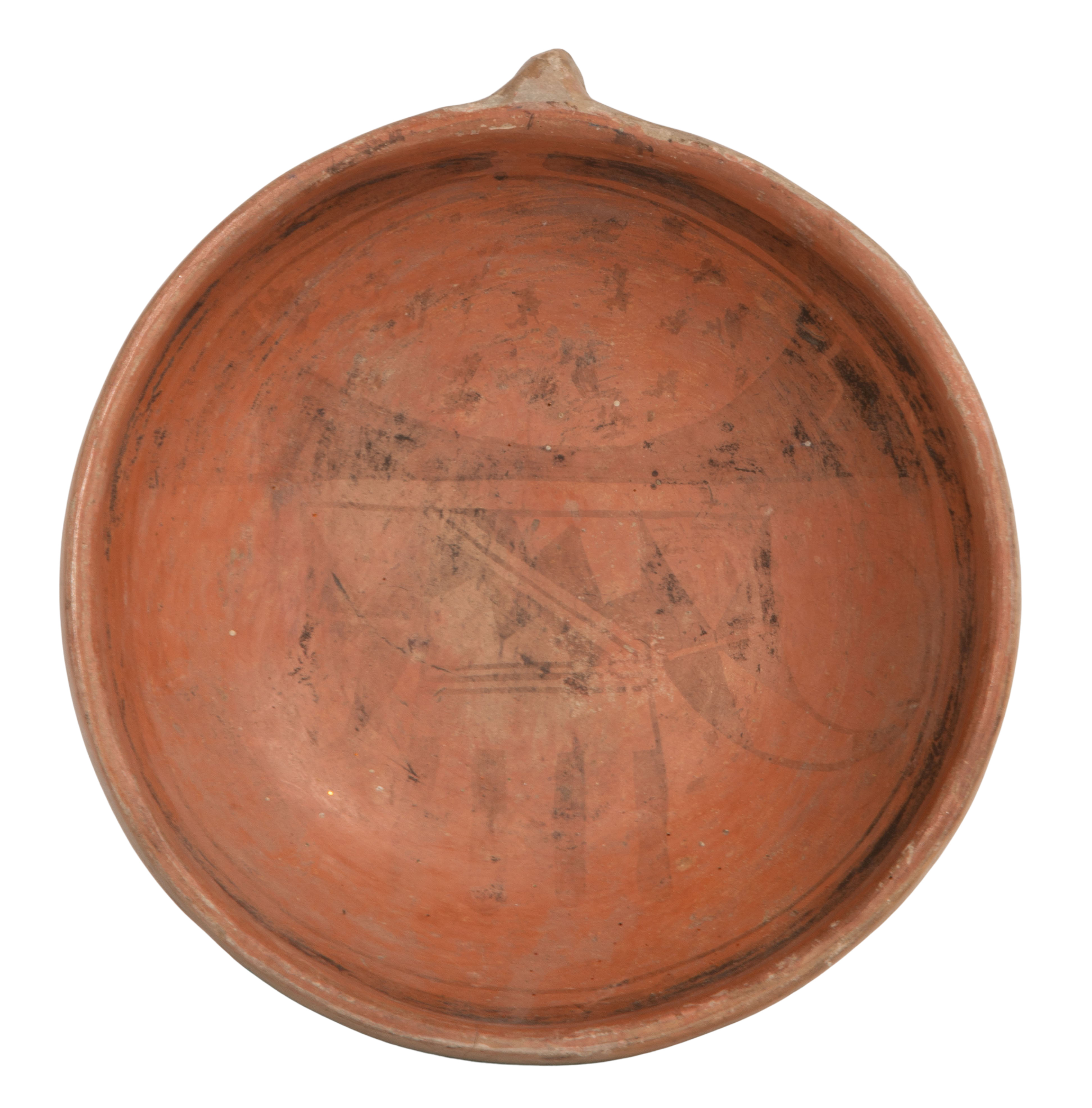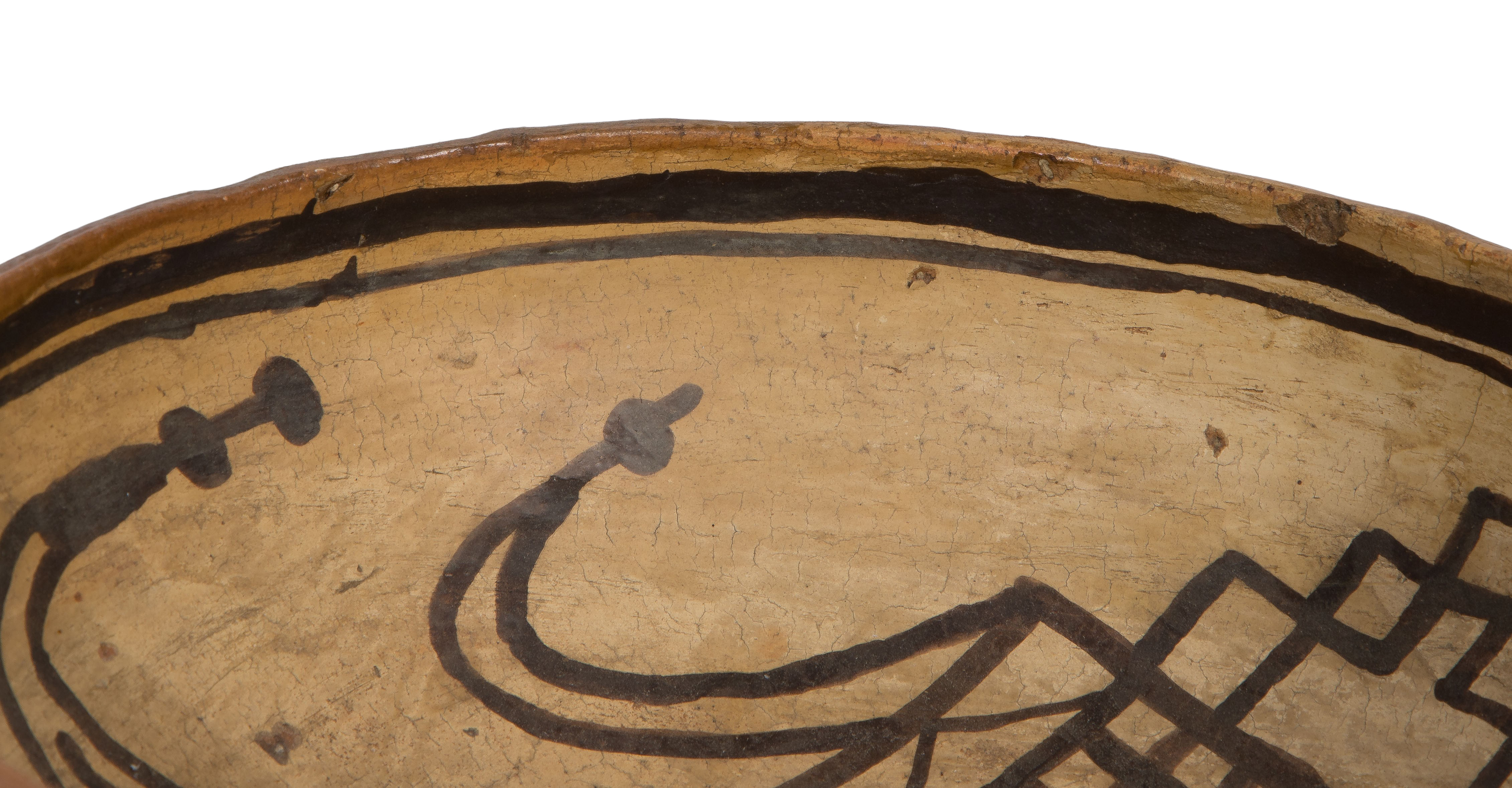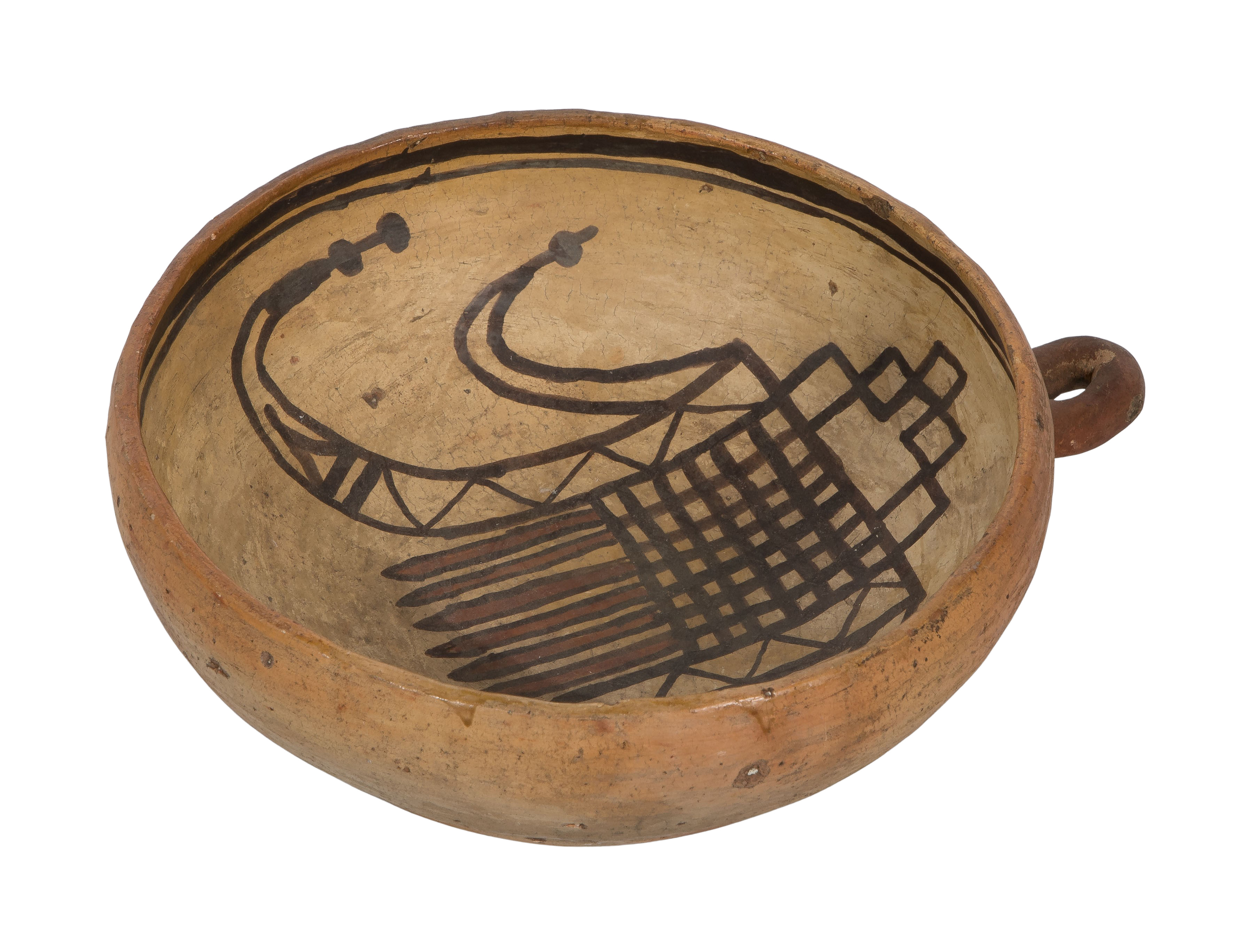 Nampeyo bowl having light chips to bowl interior lip and exterior overall, interior having a 1.5-inch hairline crack running from the rim downward (not visible from exterior), staining to interior rim and exterior, pottery bowl overall light to moderate wear consistent with normal use, a hairline crack at rim, paint faded and worn, handle lightly scuffed