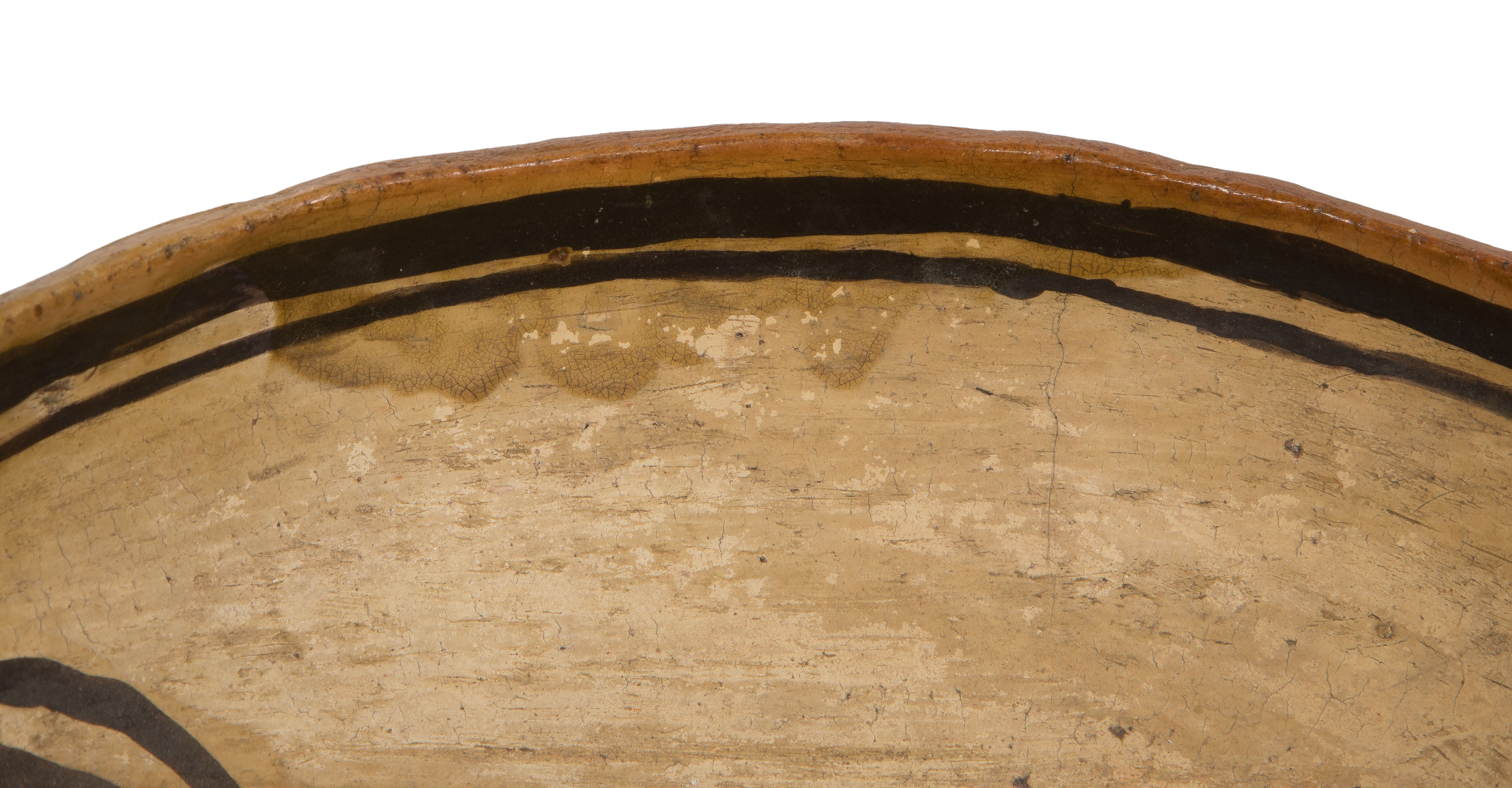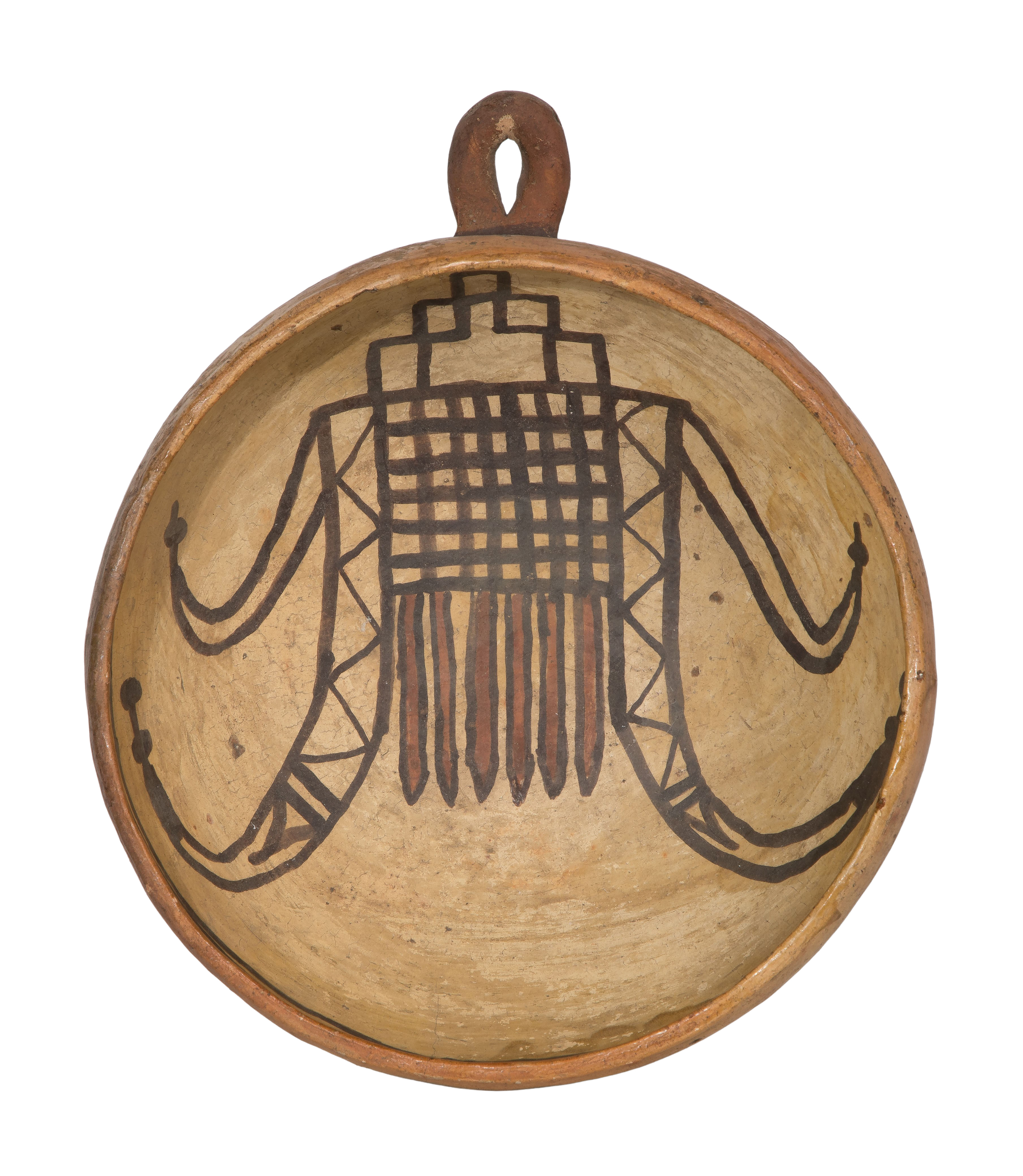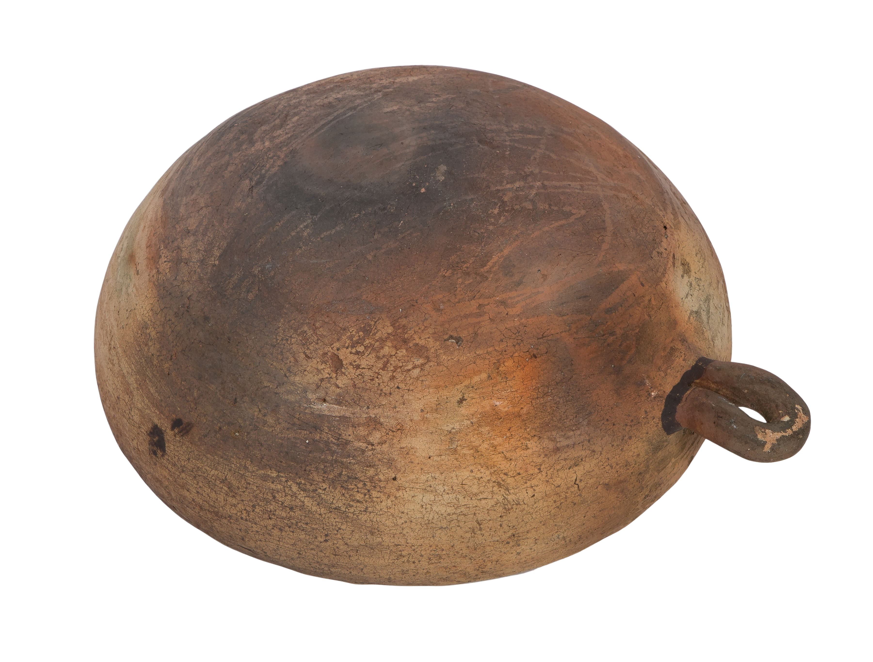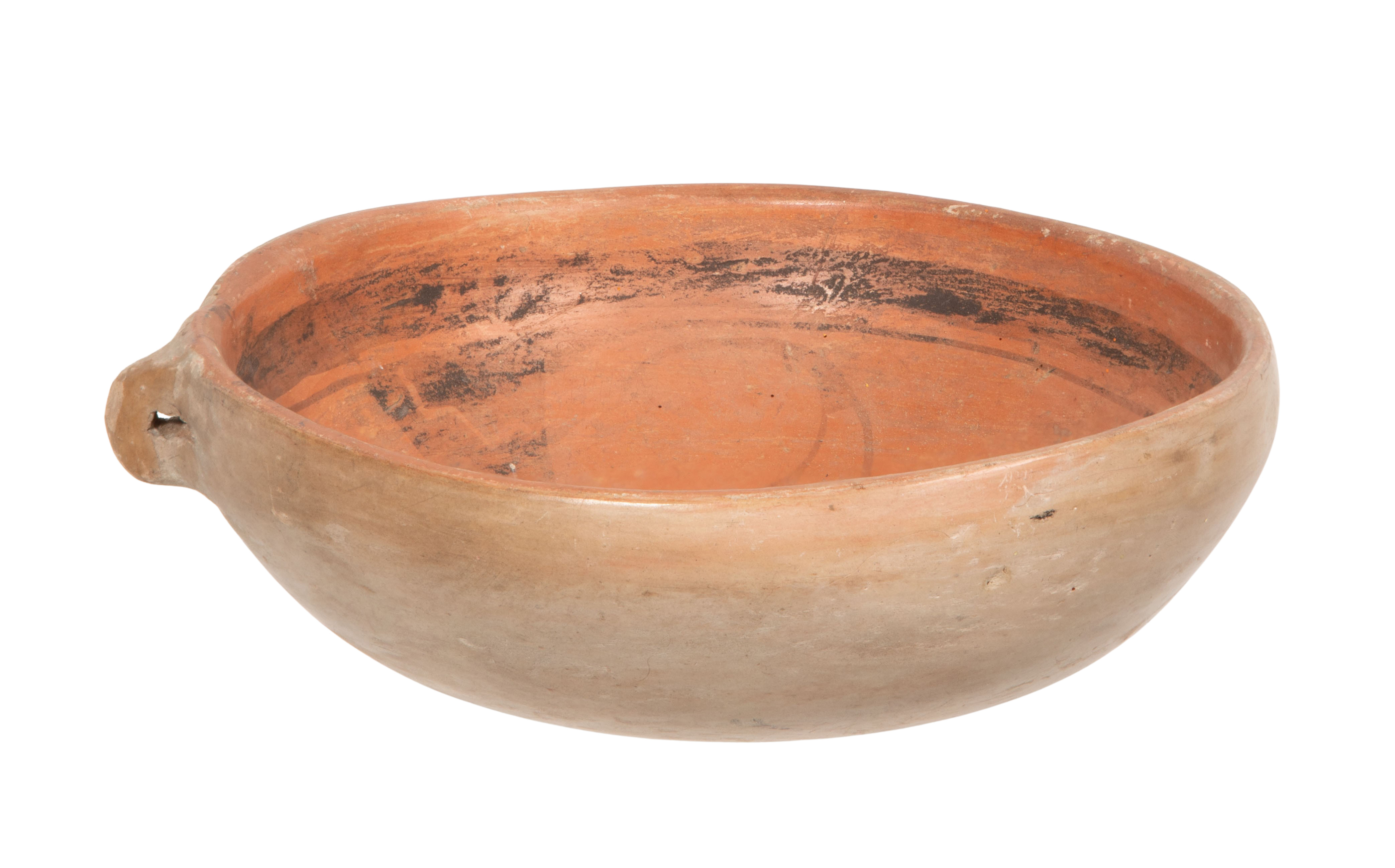 Nampeyo bowl having light chips to bowl interior lip and exterior overall, interior having a 1.5-inch hairline crack running from the rim downward (not visible from exterior), staining to interior rim and exterior, pottery bowl overall light to moderate wear consistent with normal use, a hairline crack at rim, paint faded and worn, handle lightly scuffed
