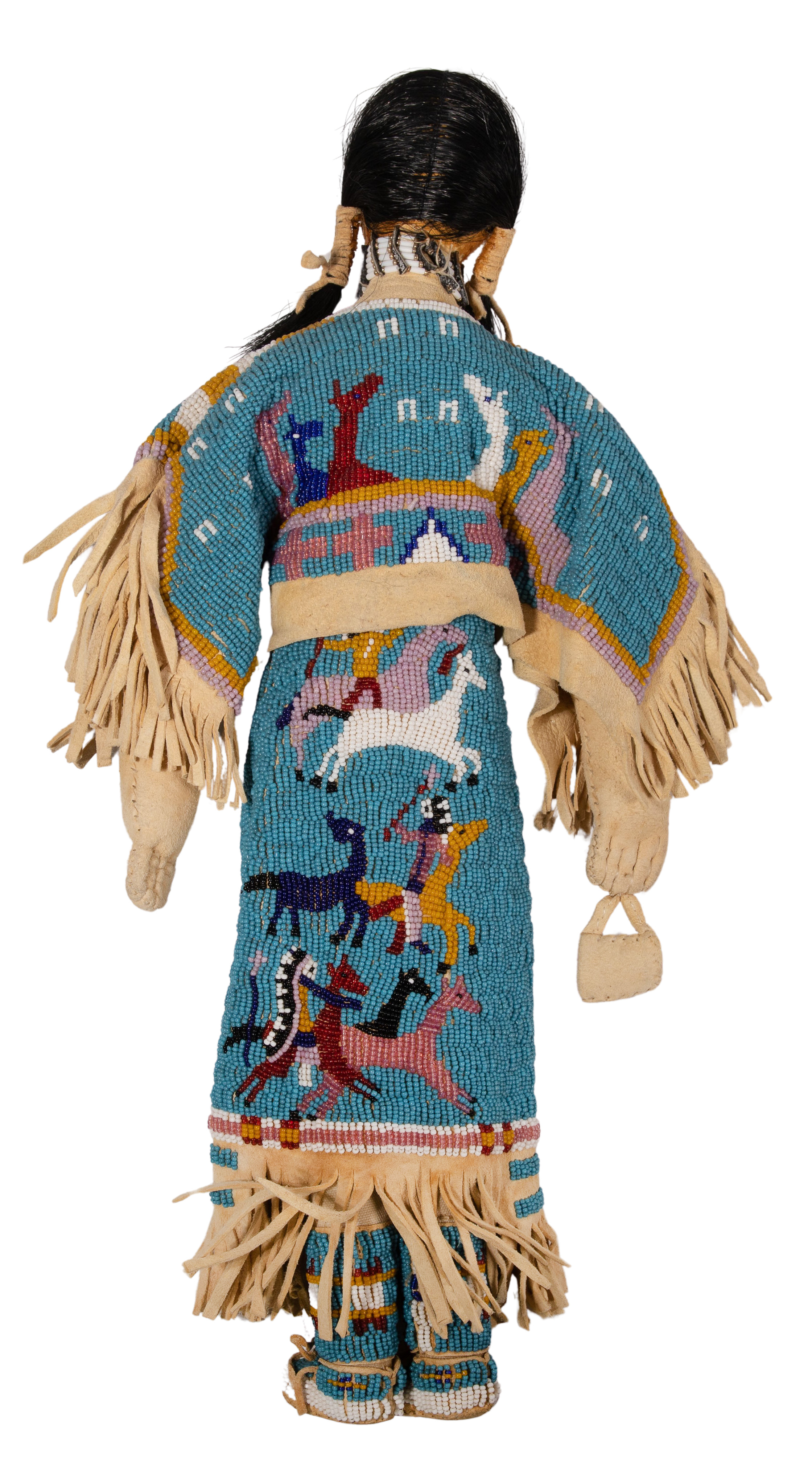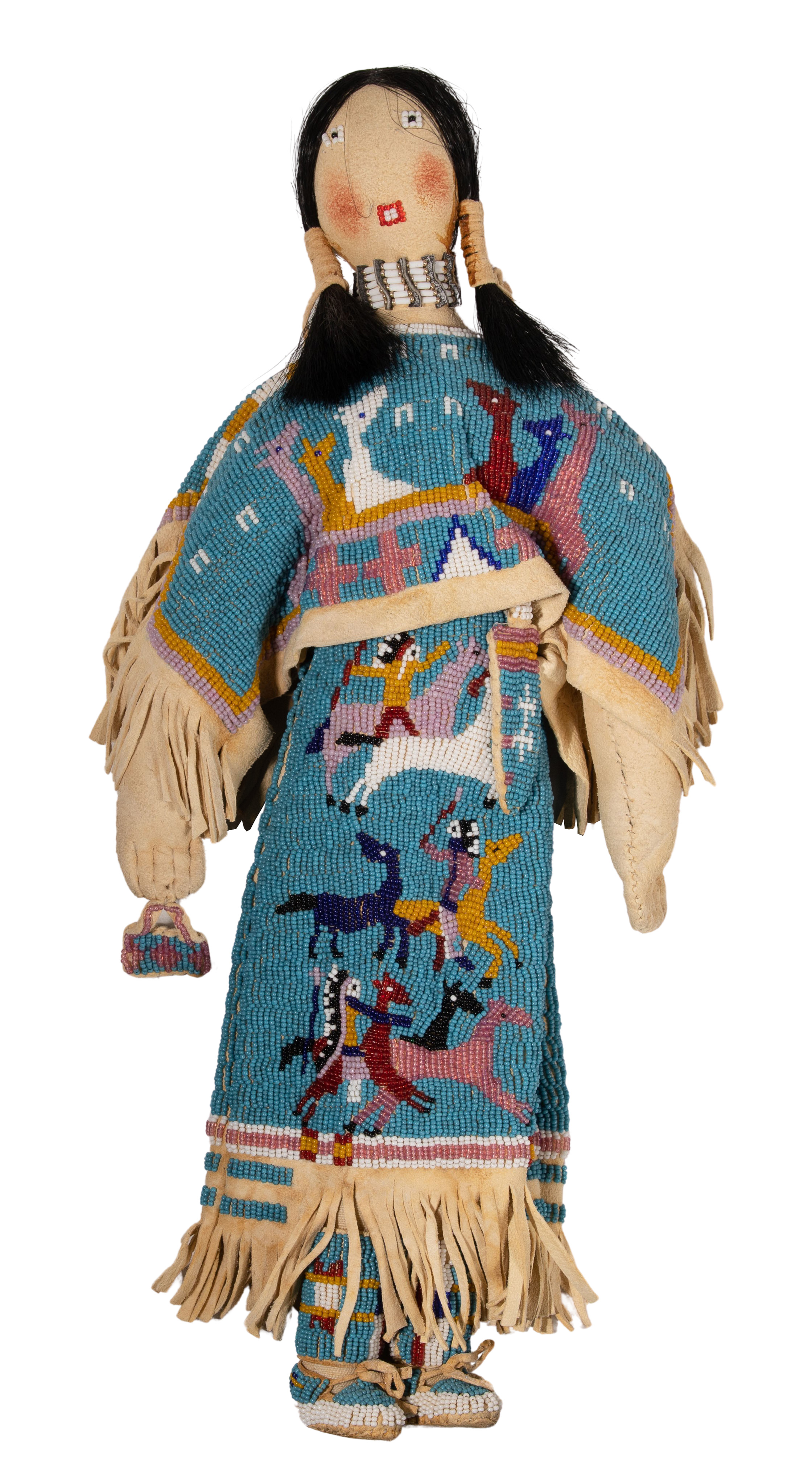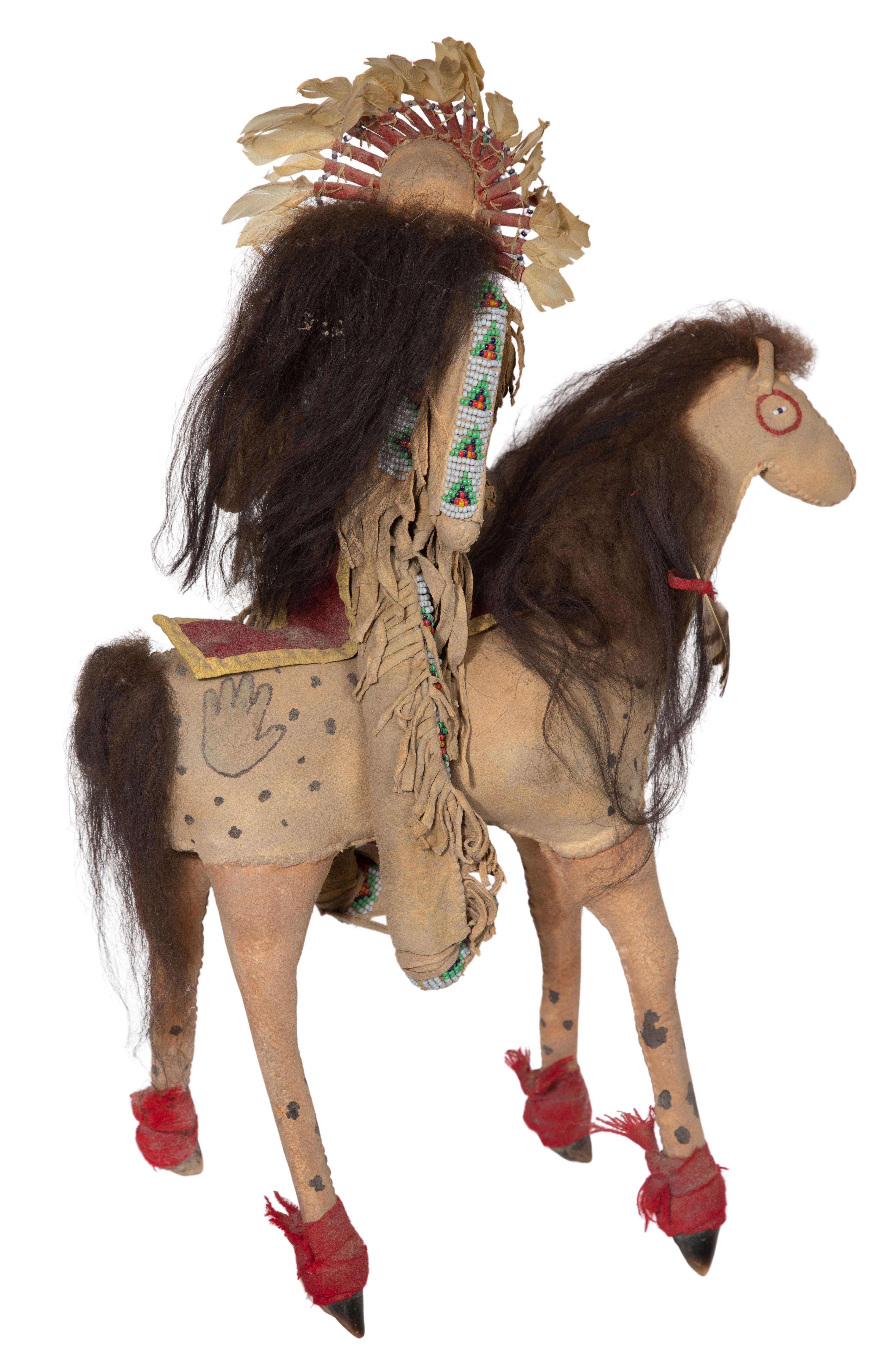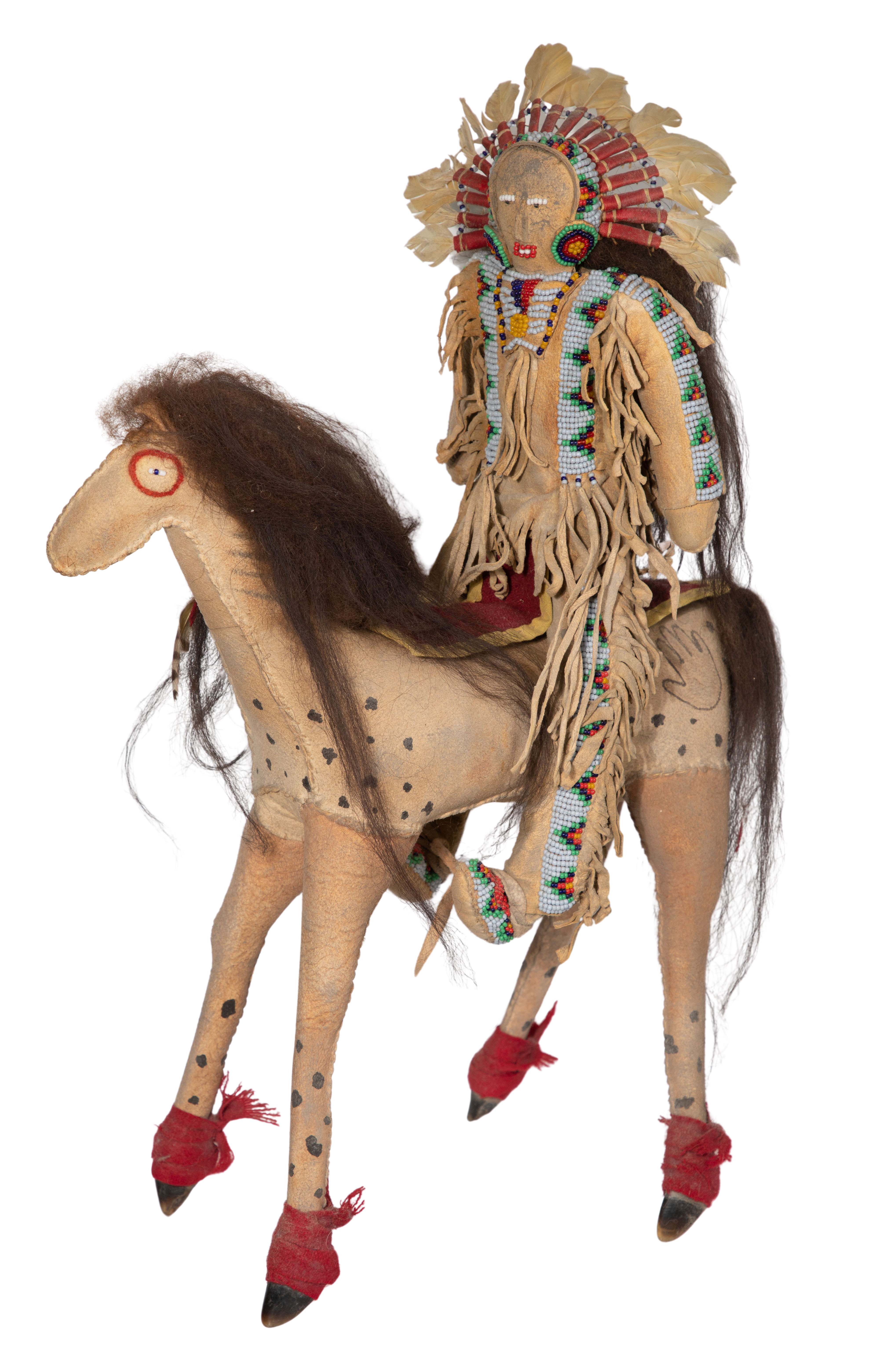 (2) items including a doll constructed of fabric and hide with applied hair, painted and beaded facial features, depicting a woman clad in a beaded dress (depicting horses and mounted warriors), high-top moccasins, holding a beaded bag in one hand and a beaded knife sheath suspended from the belt as well as a horse and rider, beaded and painted hide having feather, horse hair and fabric attachments, the rider loosely seated on the horse supported on hide wrapped sticks carved to form hooves