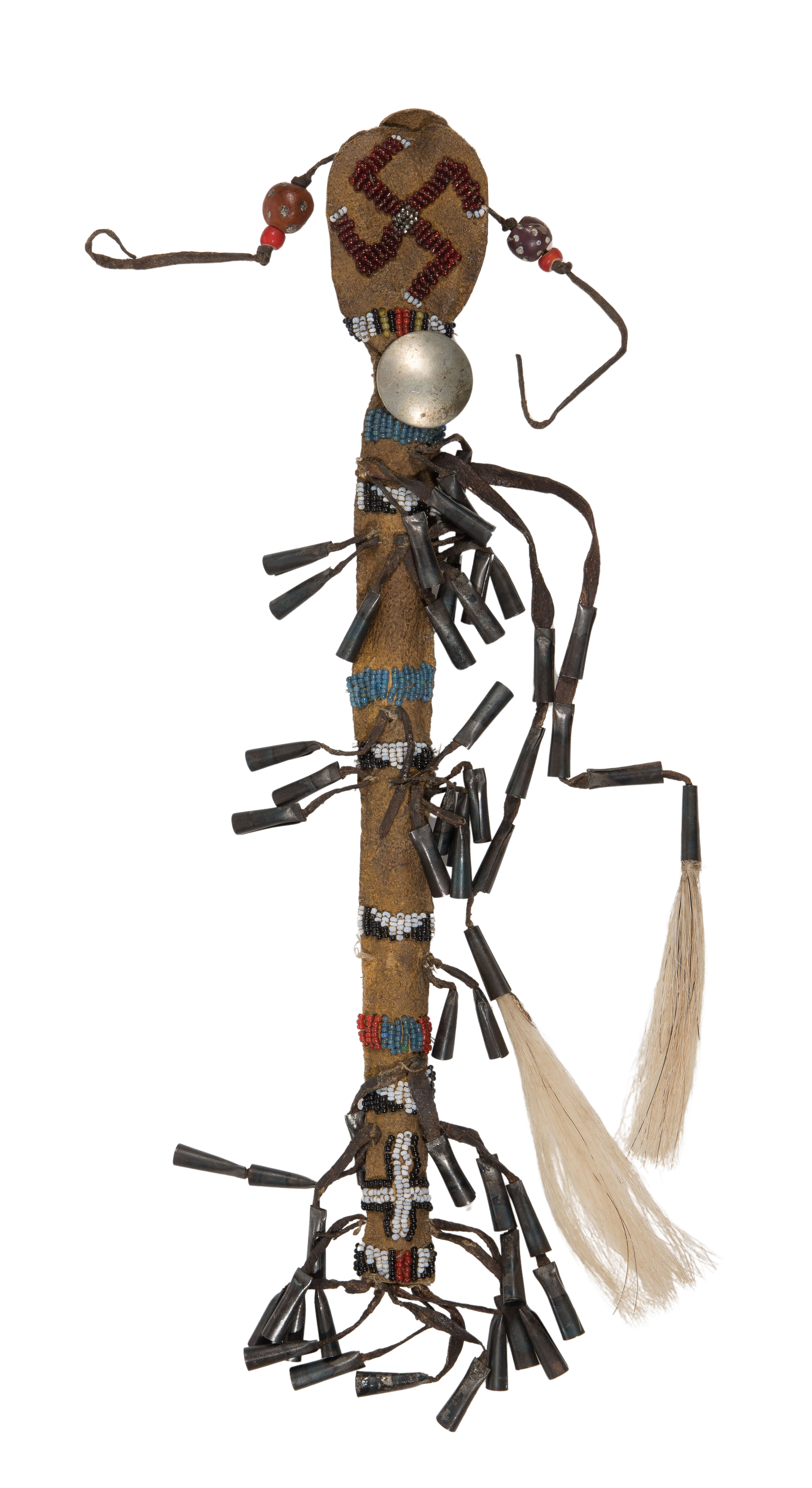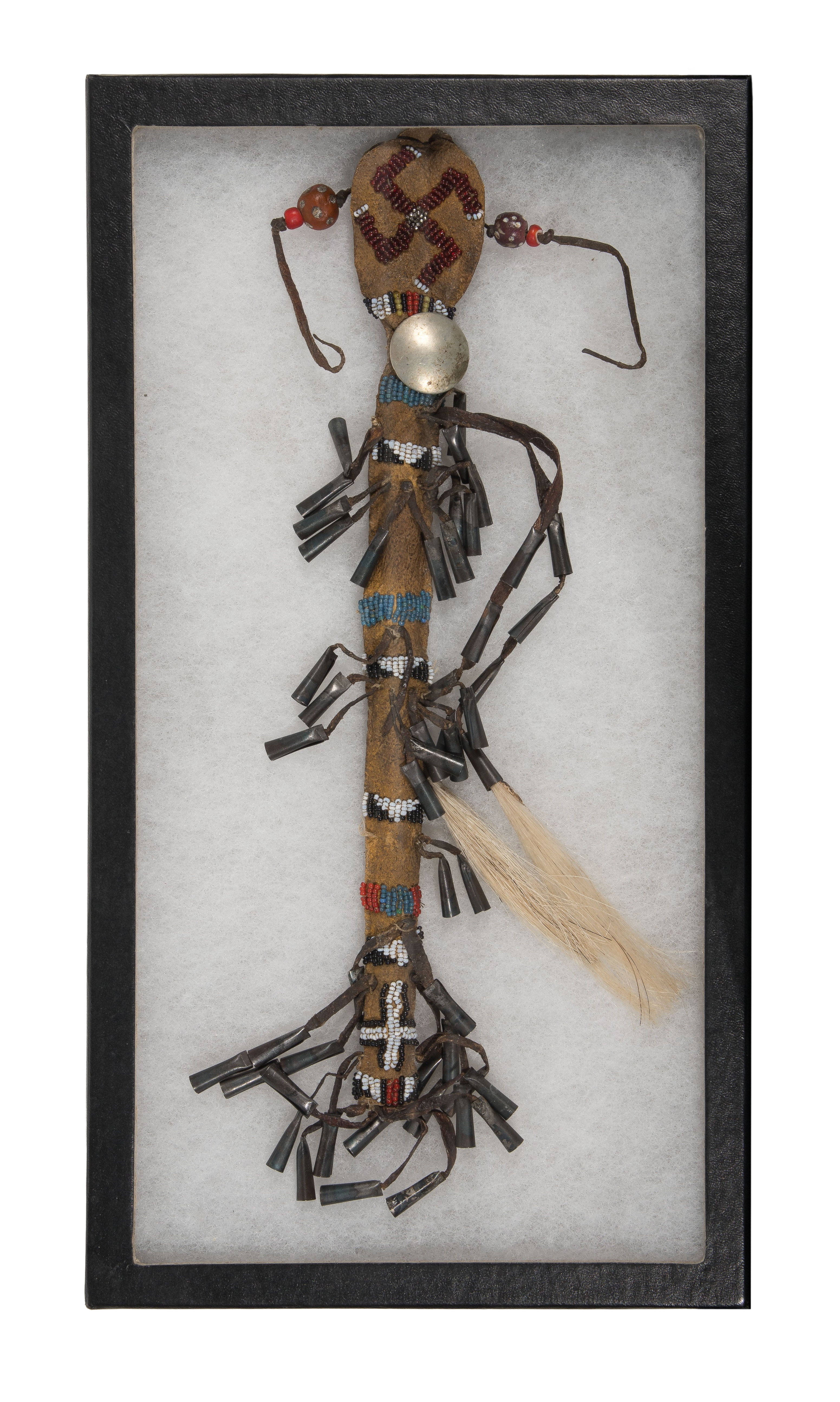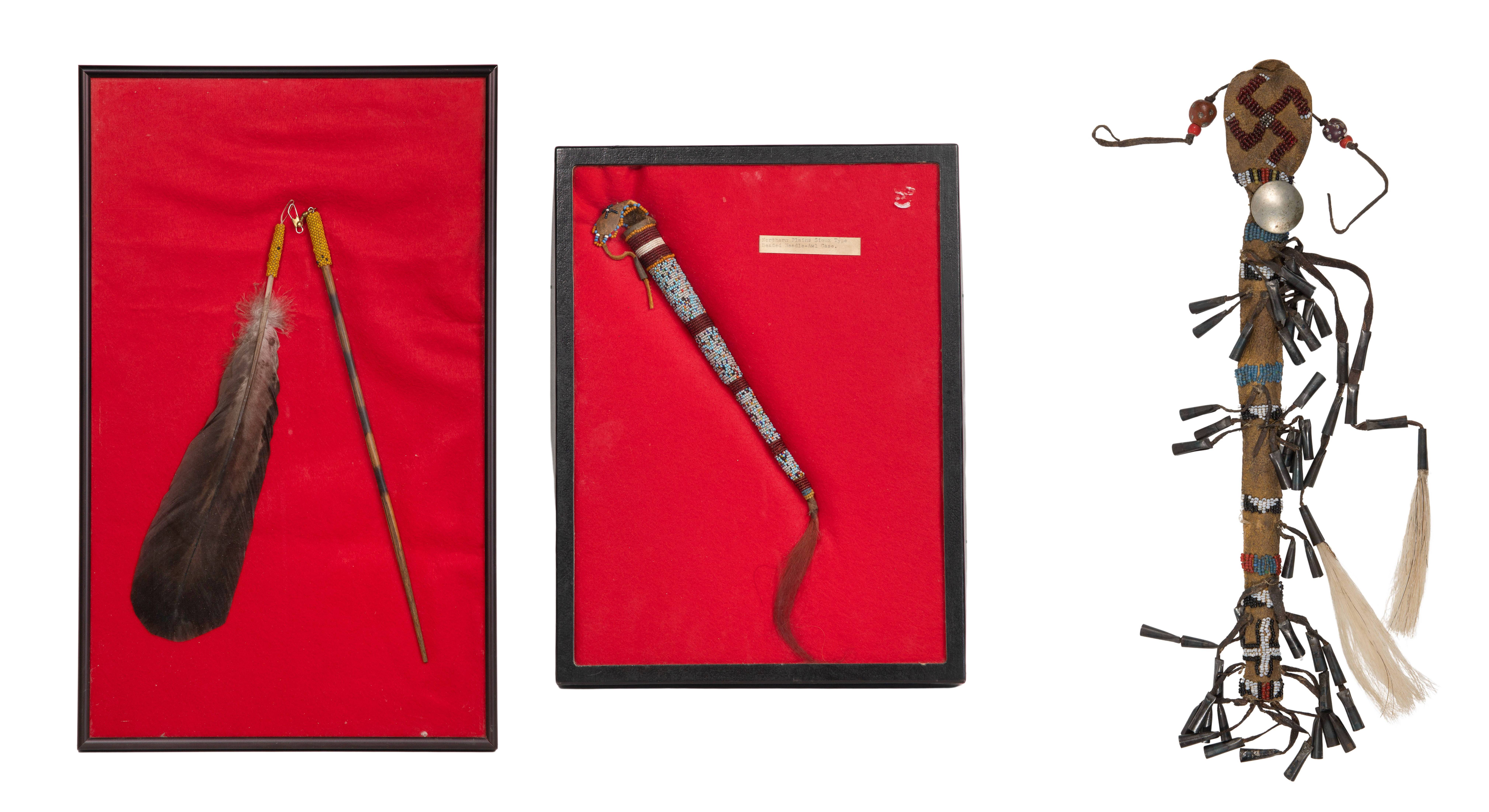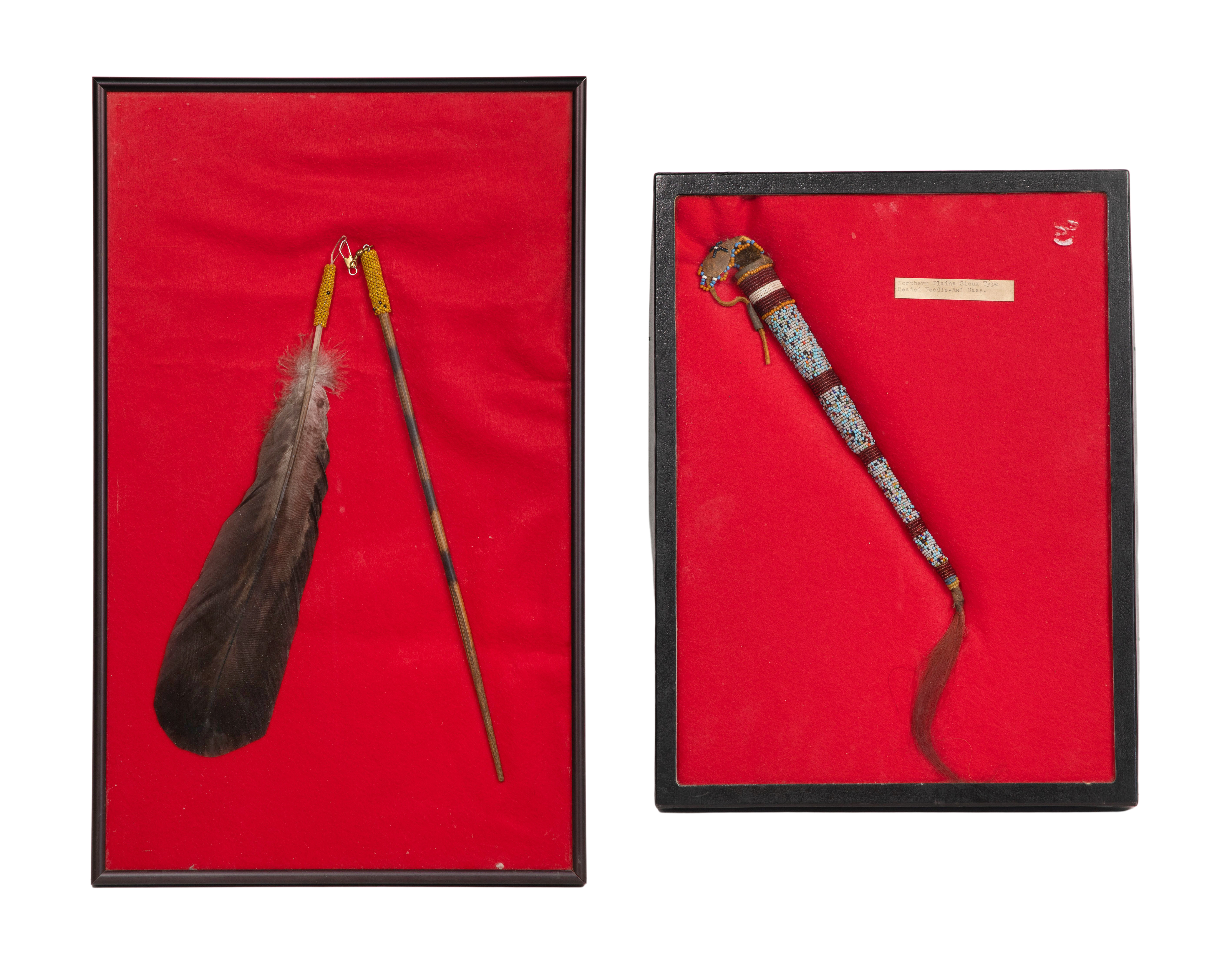 (3) items including a labeled Northern Plains awl case, a Southwestern / Mexican Huichol muwieri feathered wand and an Native American Apache awl case, beaded hide case adorned with horse hair and metal tinklers, holding a carved wood stick, including lined display frame / cases
