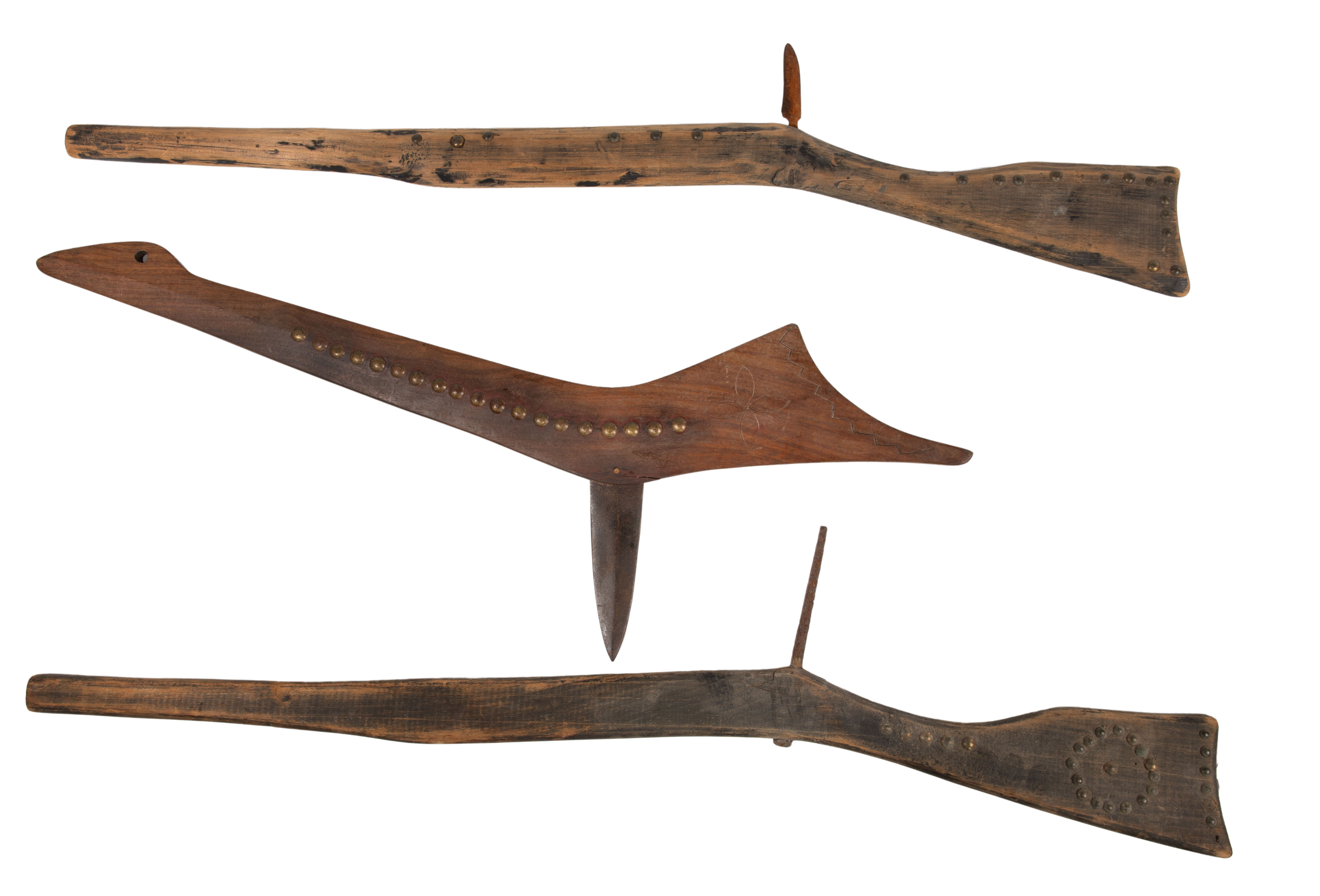 (3) items of carved wood having brass tack decoration, (2) having spontoon heads and another having a simple iron spike