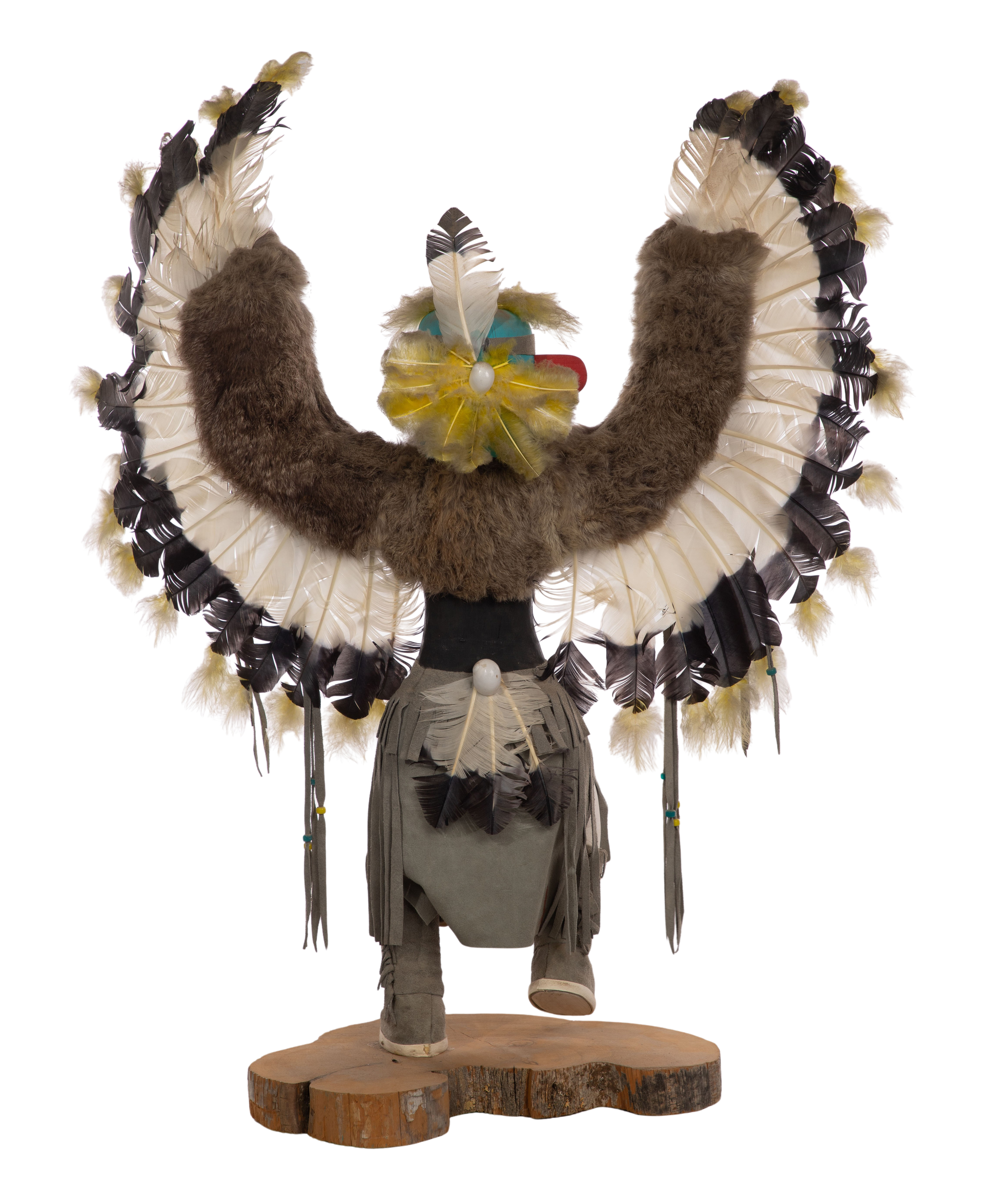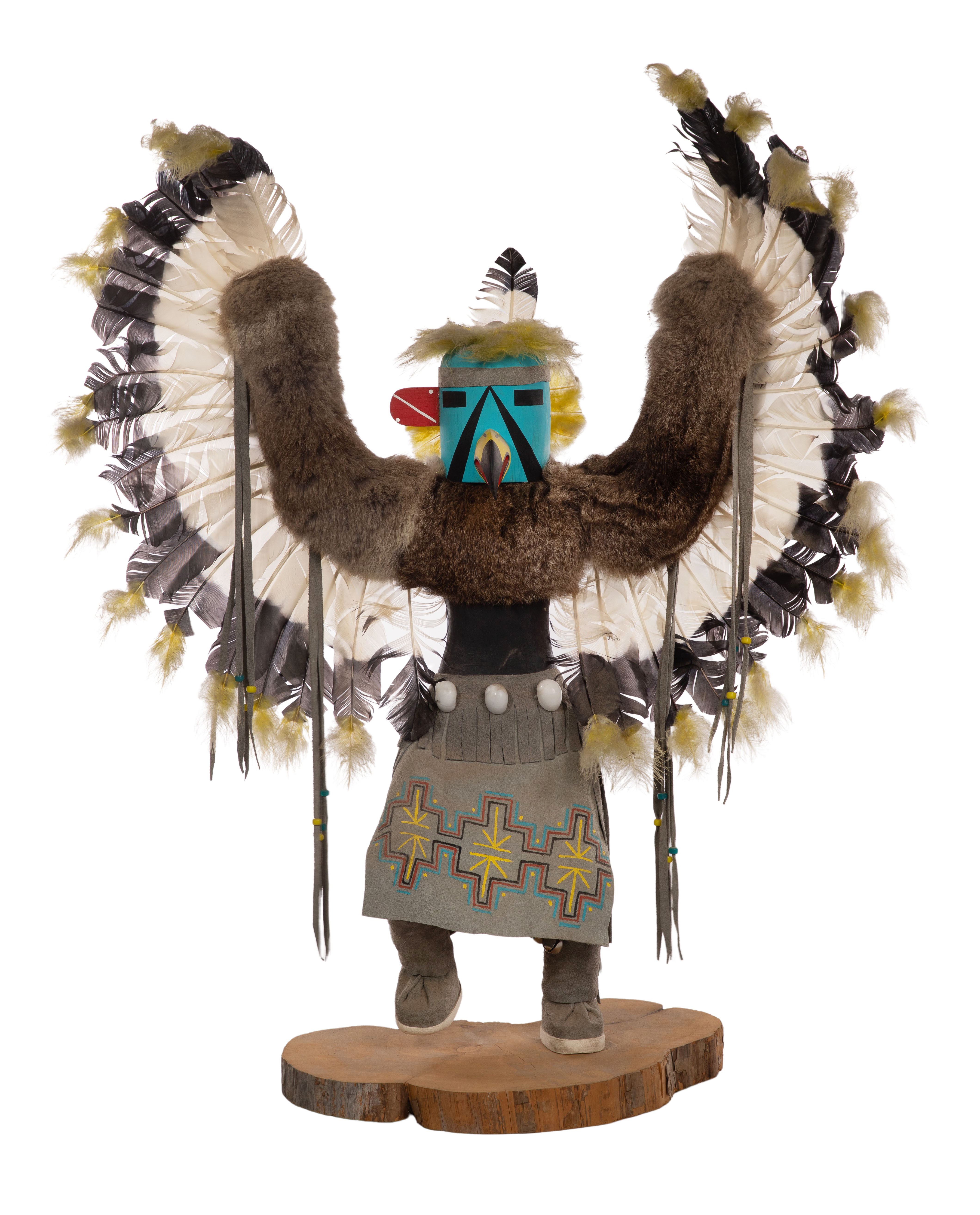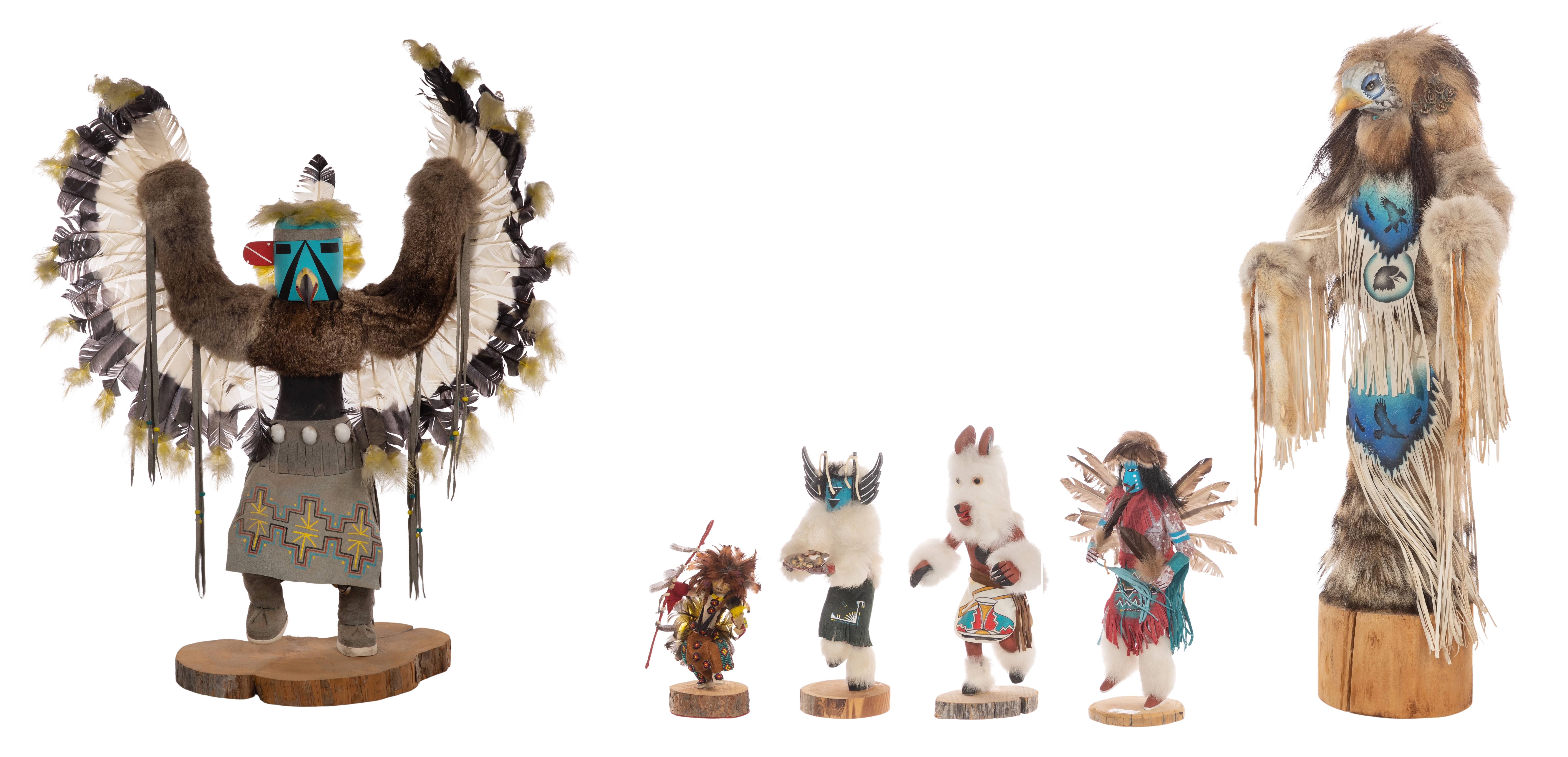 (6) items including an Alta Apachito Eagle kachina, 20th century, marker signed to underside, depicting an eagle figure with fur and feathers, on a wood base as well as a Bear Byem, a Crow Mother by L. Yazzie, a Fancy Dance by T. G. Beinlly, an unknown dancer and an eagle masked figure, a few artist signed