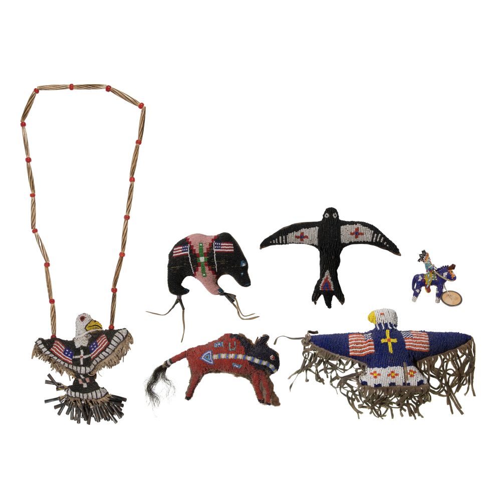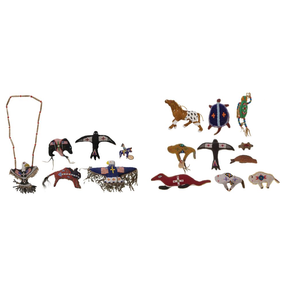 (16) total items including (14) fetishes having leather or animal material backing, some having American flag beadwork; together with a beaded horse with rider and a beaded horse