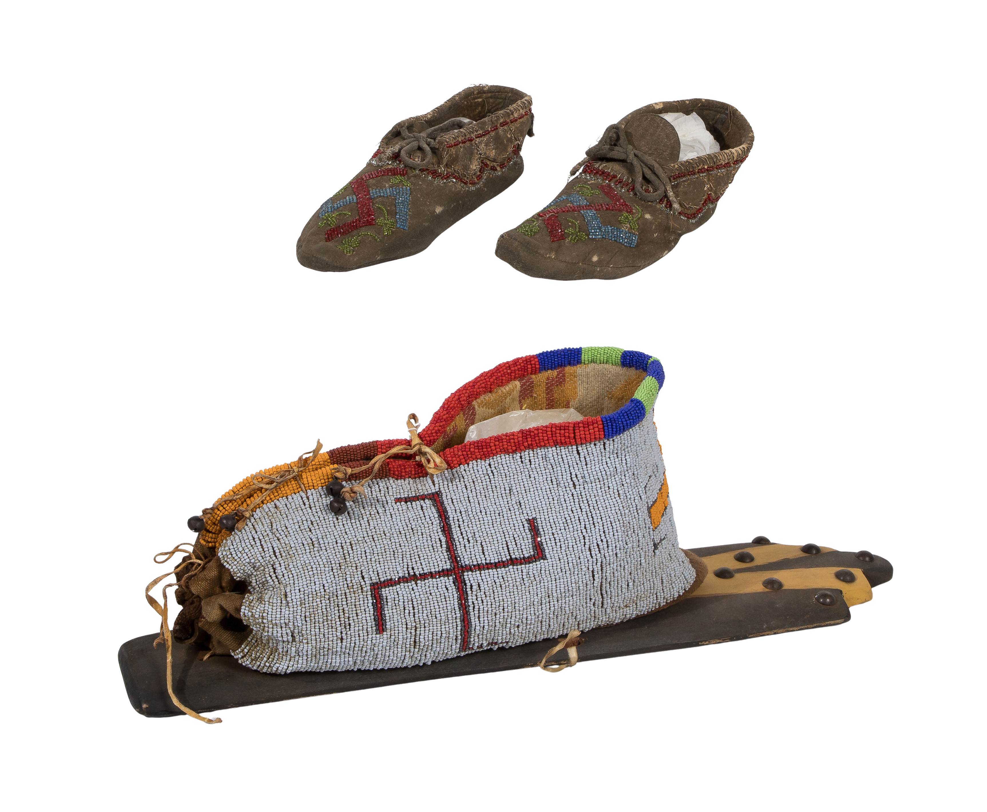 Condition: some damaged and missing beadwork, cradleboard wood having minor chips and paint loss, moccasin leather having light wear