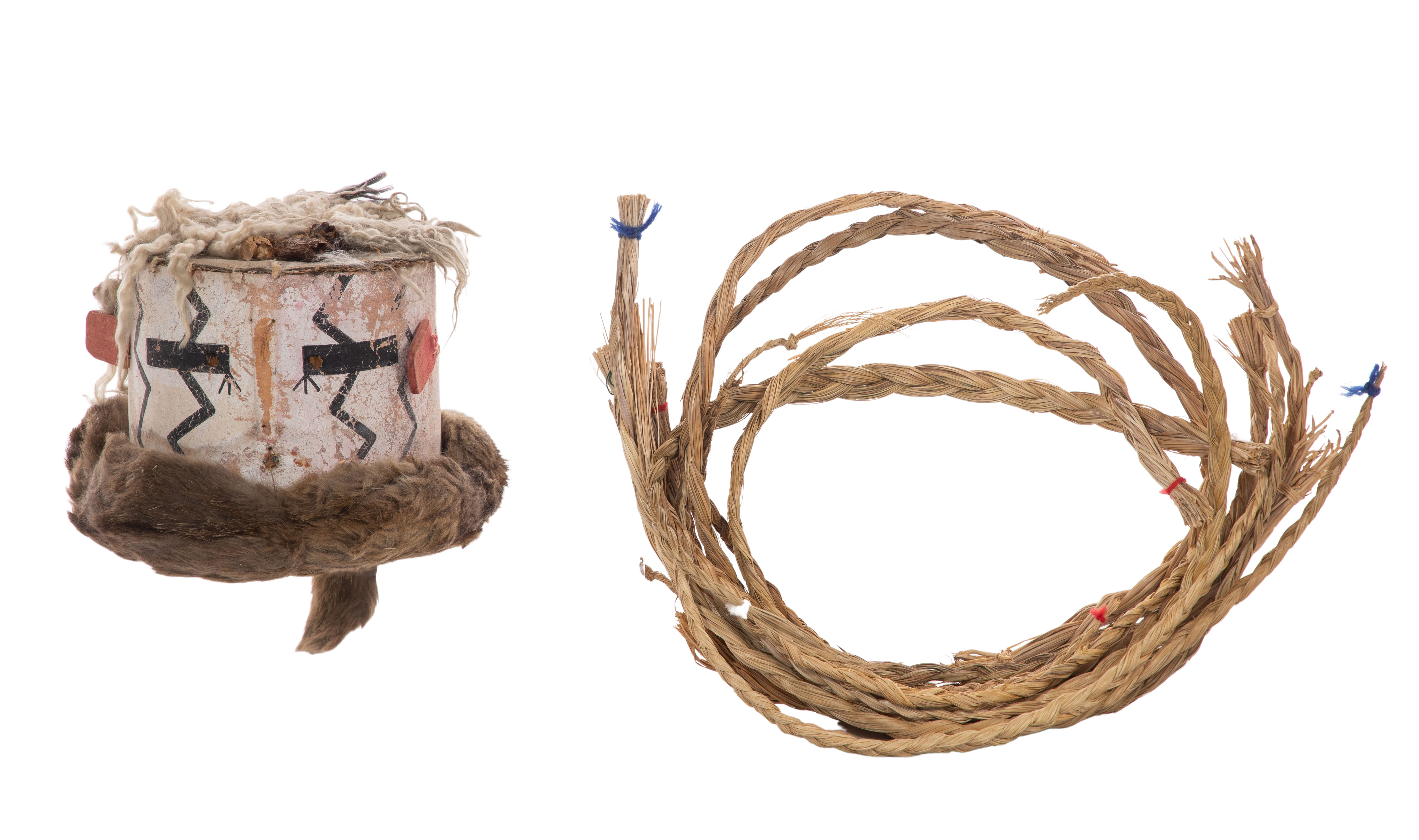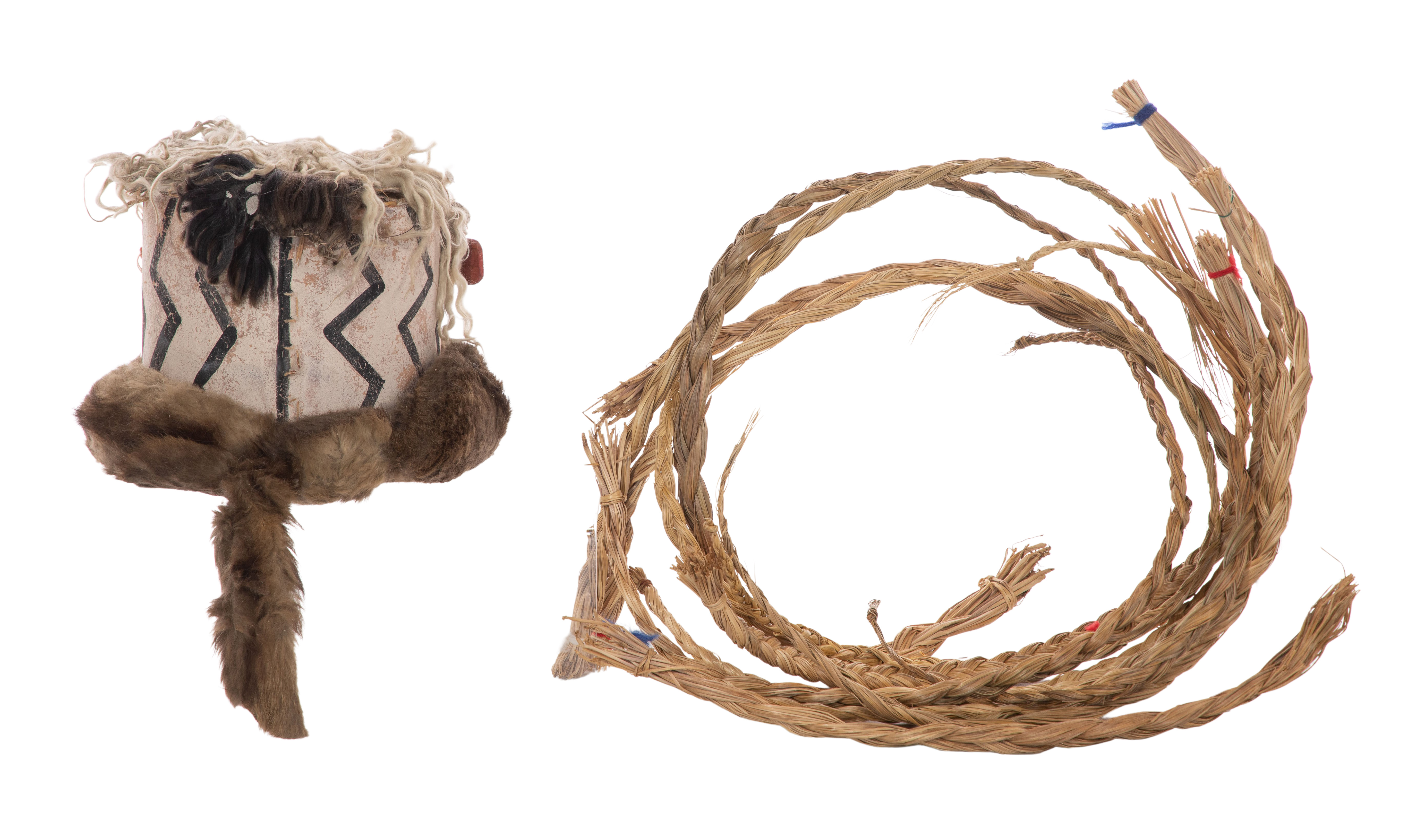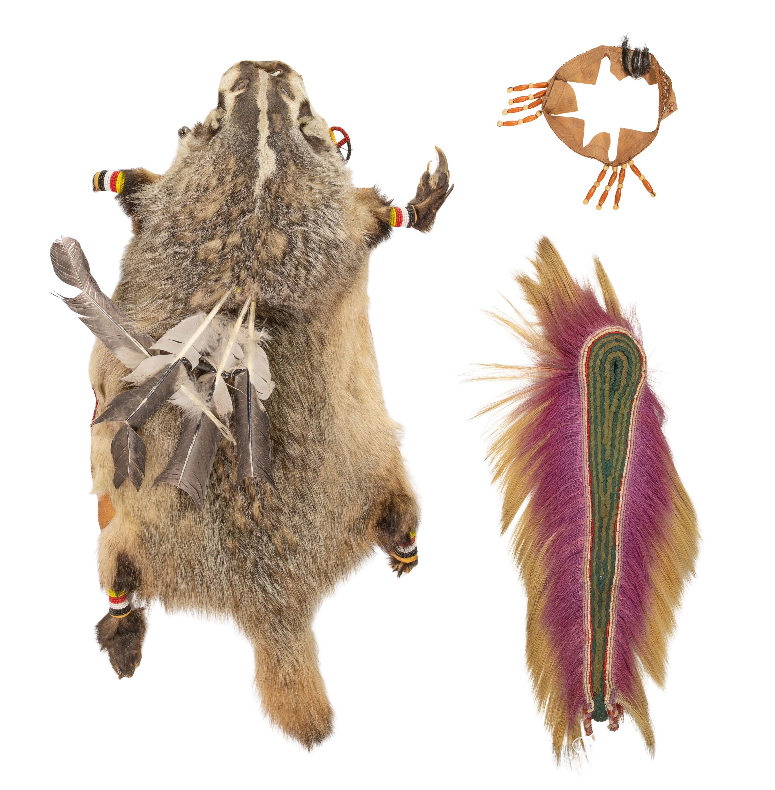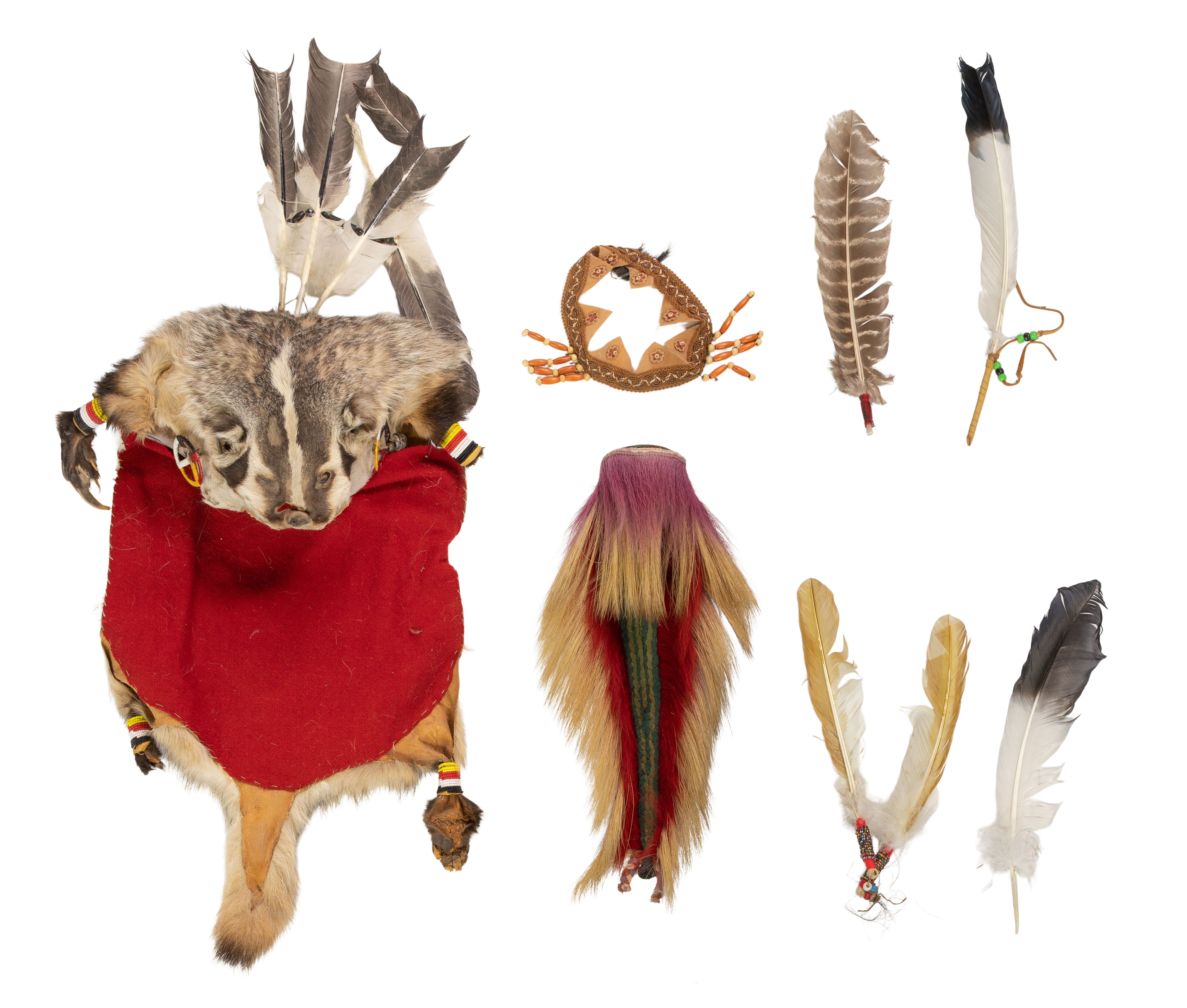 (8) items including a badger pelt headdress having attached feathers, a roach style headdress, a beaded feather set, an owl feather, (2) unknown feathers, a decorative embellished cloth collar, a woven and hide covered ceremonial headpiece and a set of twelve sweet grass smudge braids