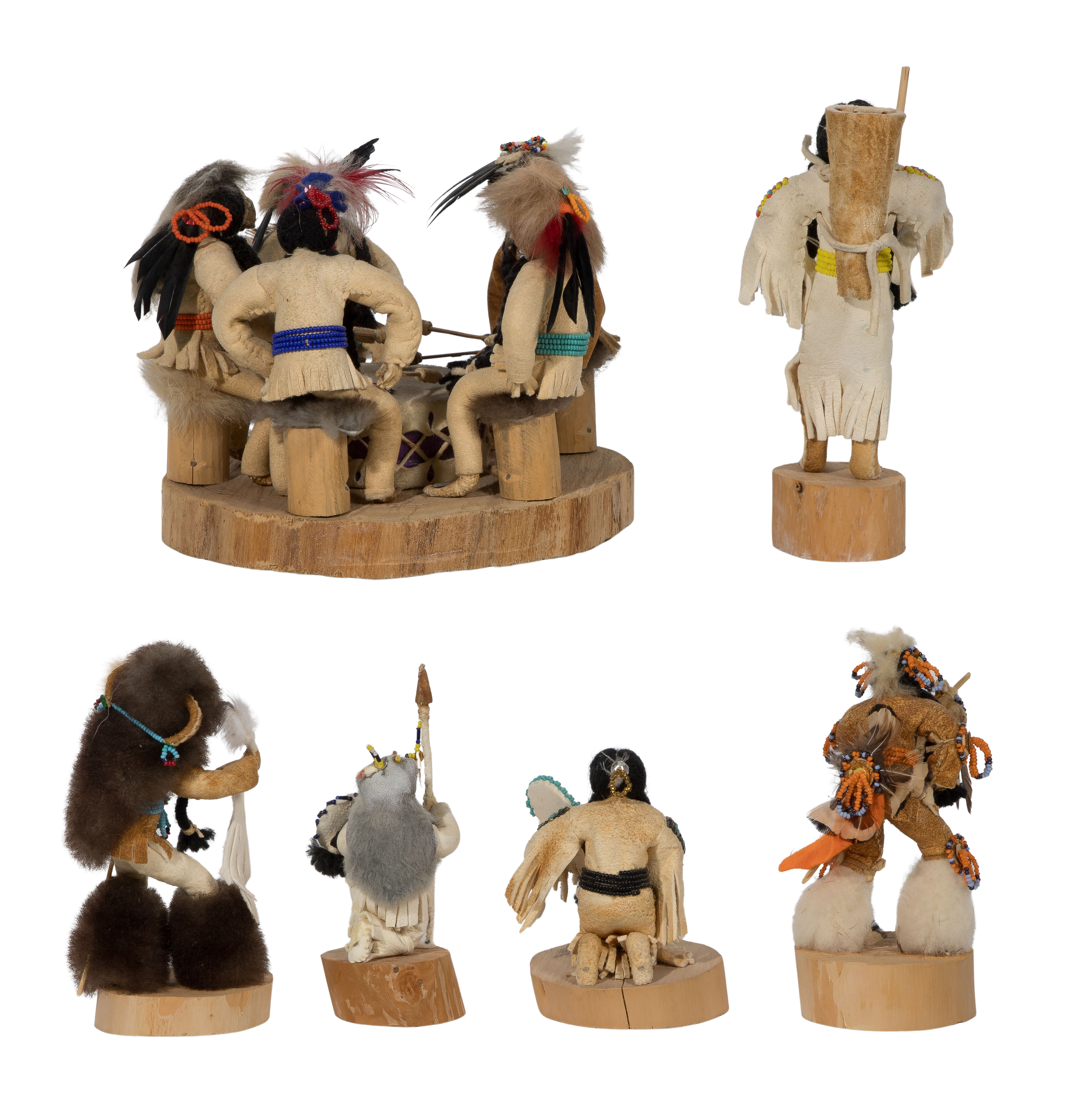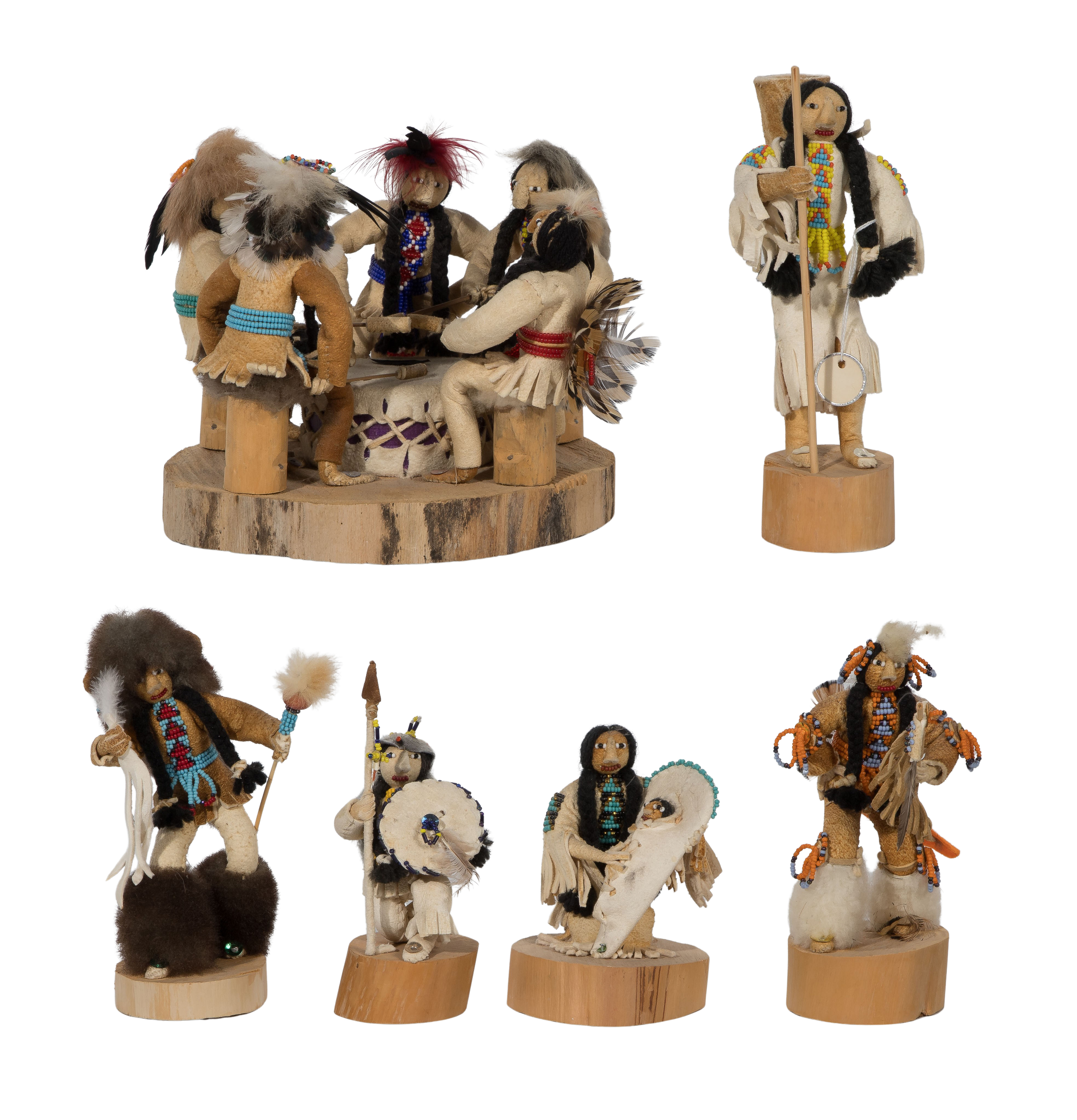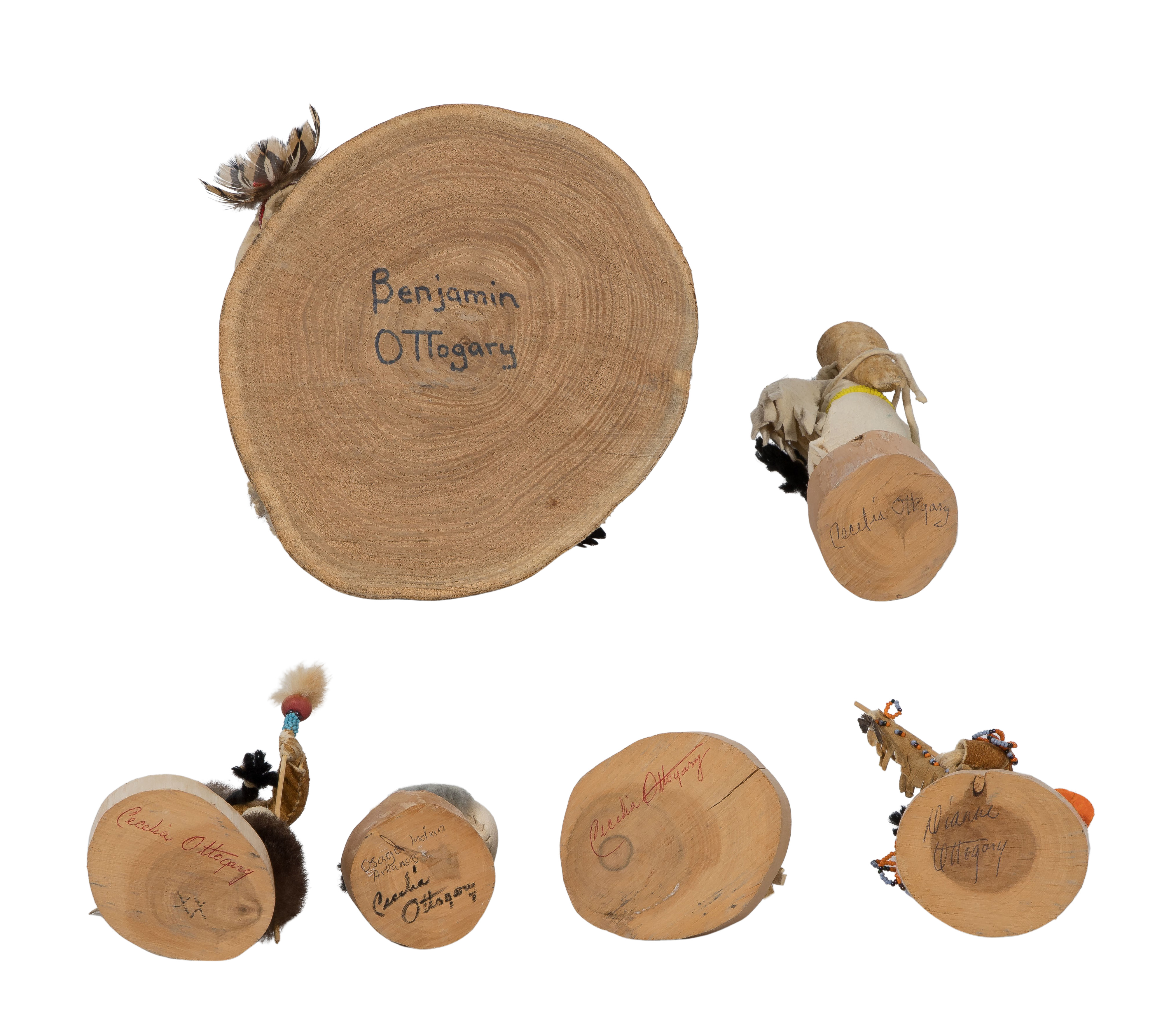 (6) items, all beaded hide covered wood on wood bases, having beaded facial features and feather and fur attachments, (4) ink signed ‘Cecelia Ottogary’ underside, a grouping of five drummers signed ‘Benjamin Ottogary’ and a signed ‘Dianne Ottogary’