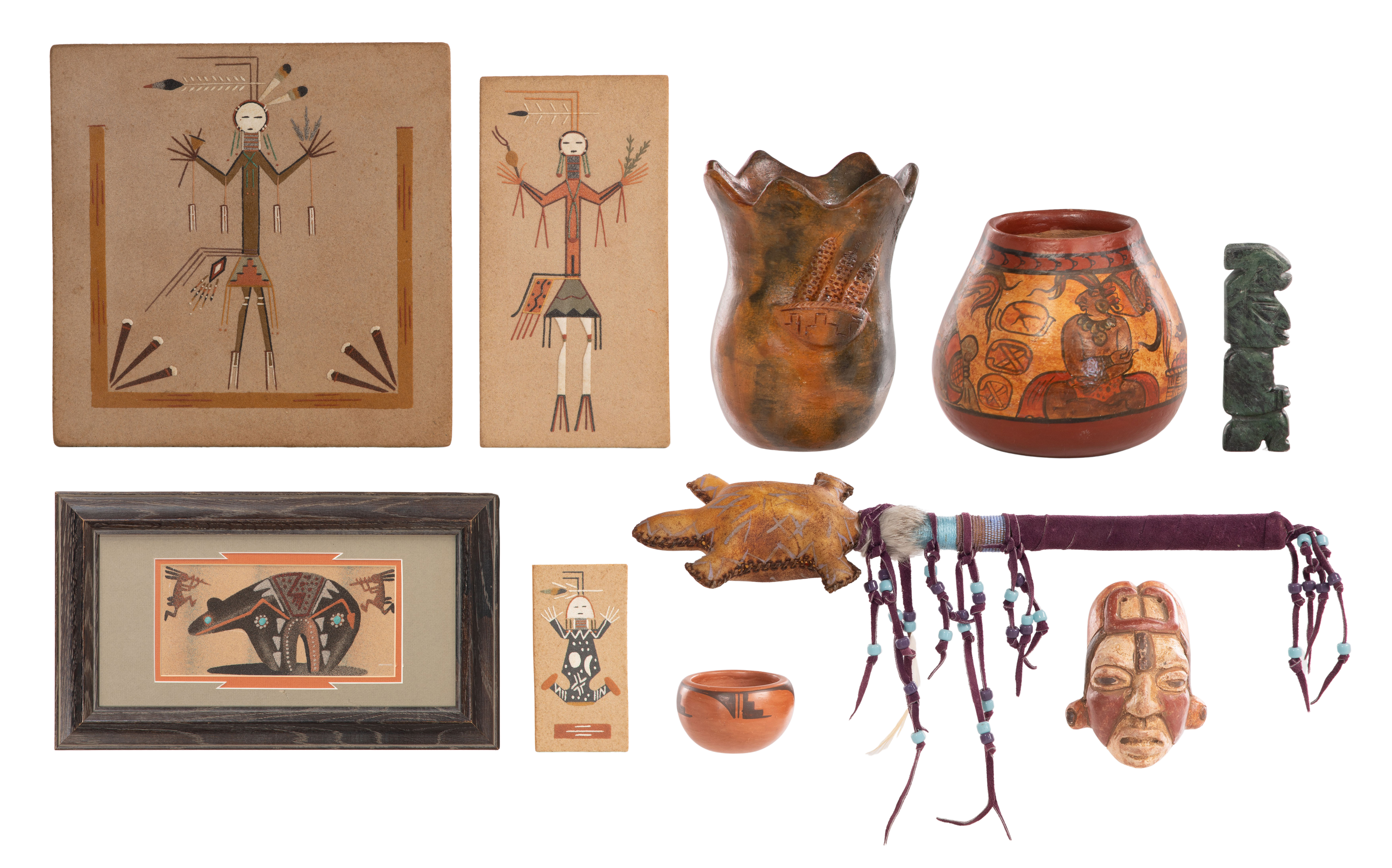 (10) items including (4) Navajo plaques in the style of sand paintings (one matted and framed), signed by artists including V. Tyler, Kay Bennett and David Lee, a Navajo pottery jar signed ‘Wanda Herder’, a small unsigned Hopi bowl, a stitched rawhide turtle effigy rattle, a Chontal style carved stone figurine, a polychrome jar and a maskette in Mayan style