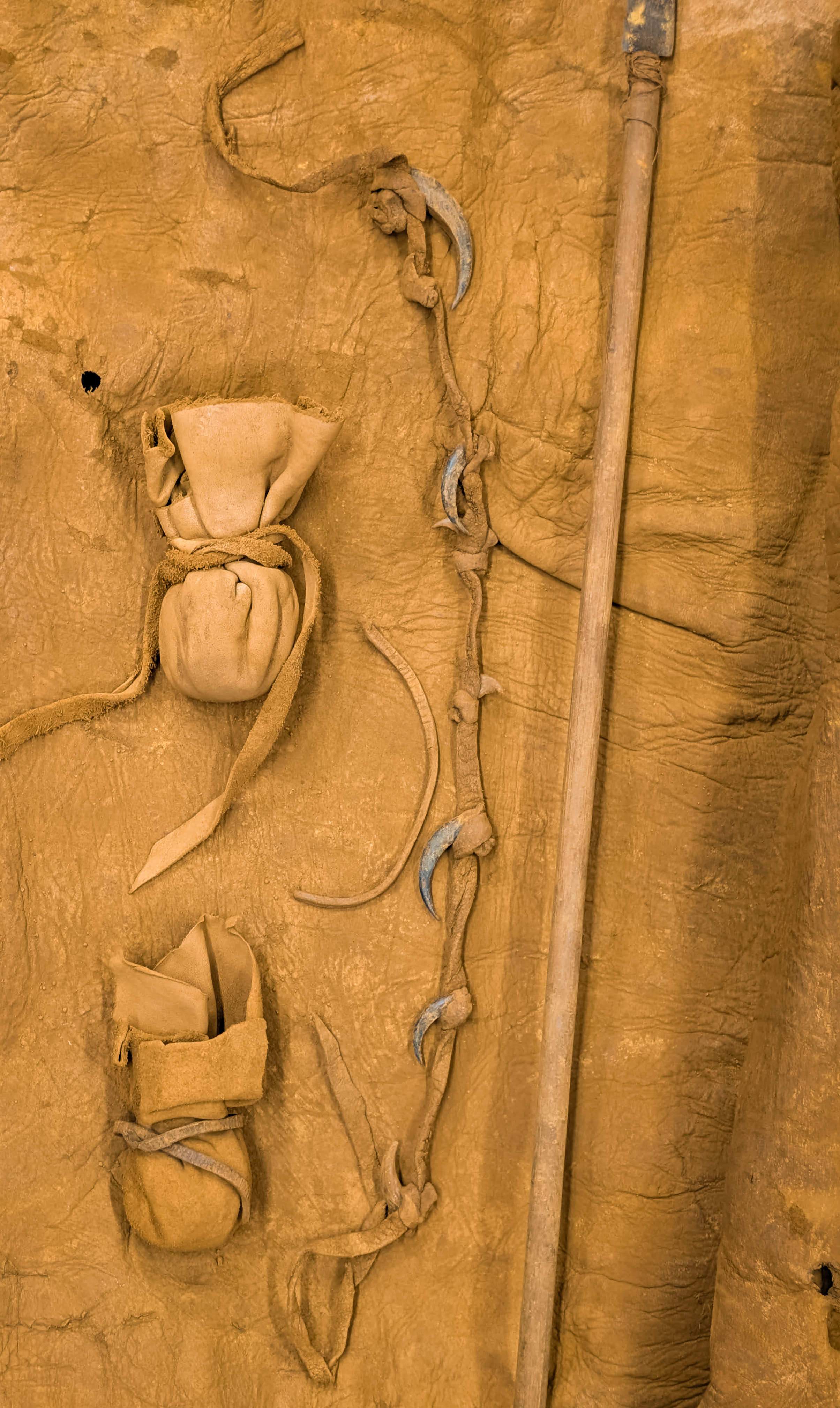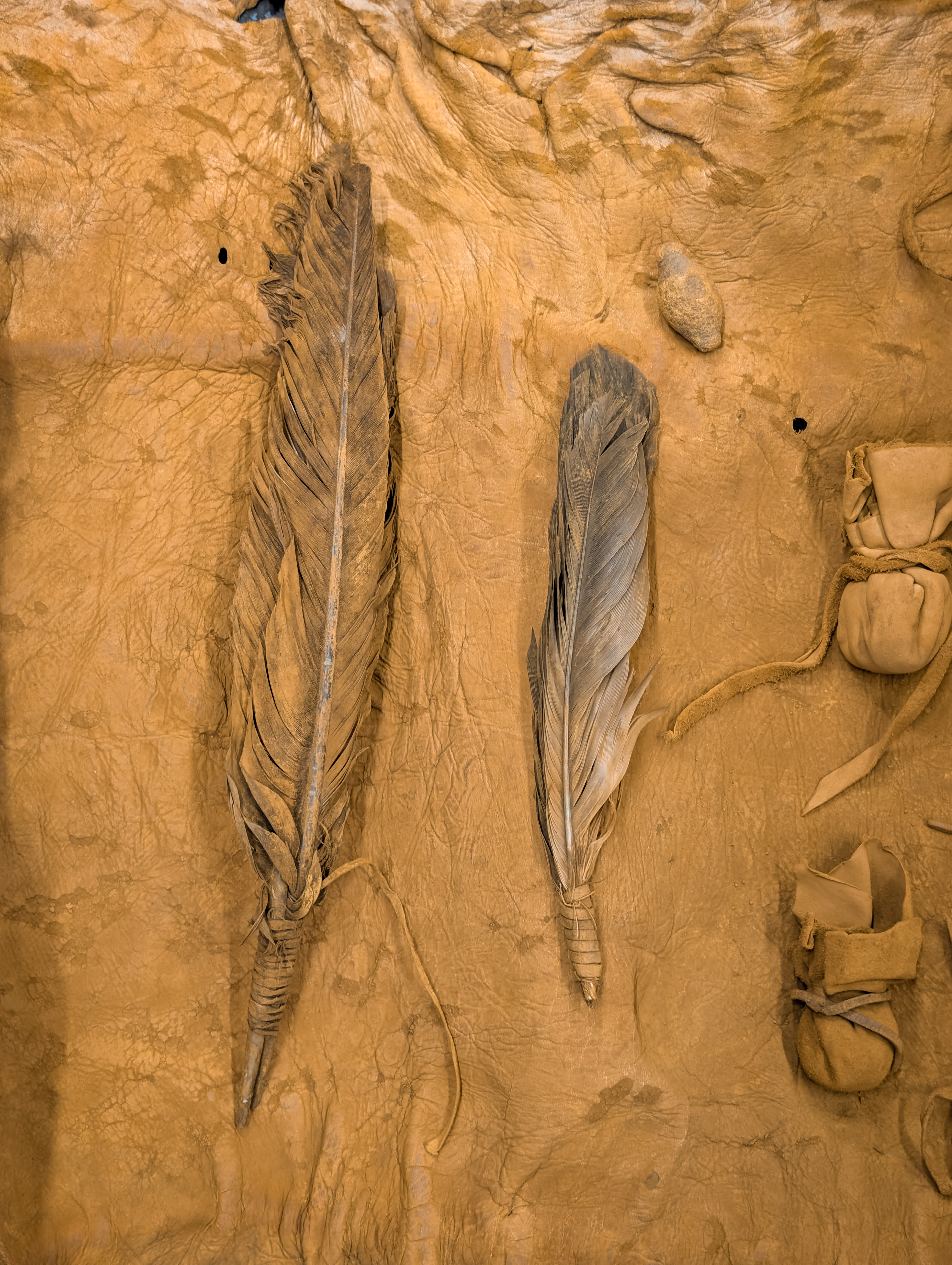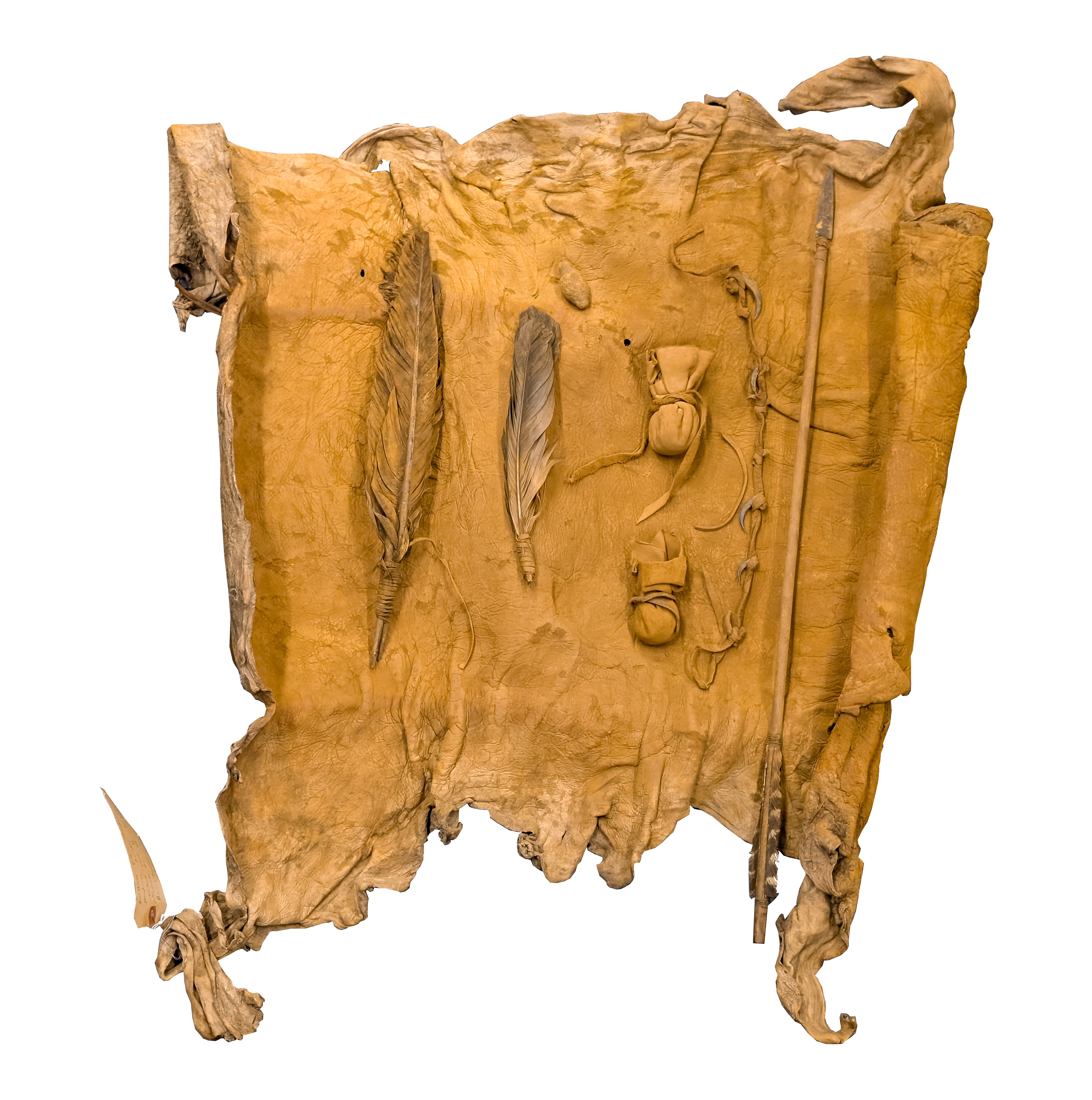 A sacred collection of items that hold spiritual and cultural significance in a rolled hide