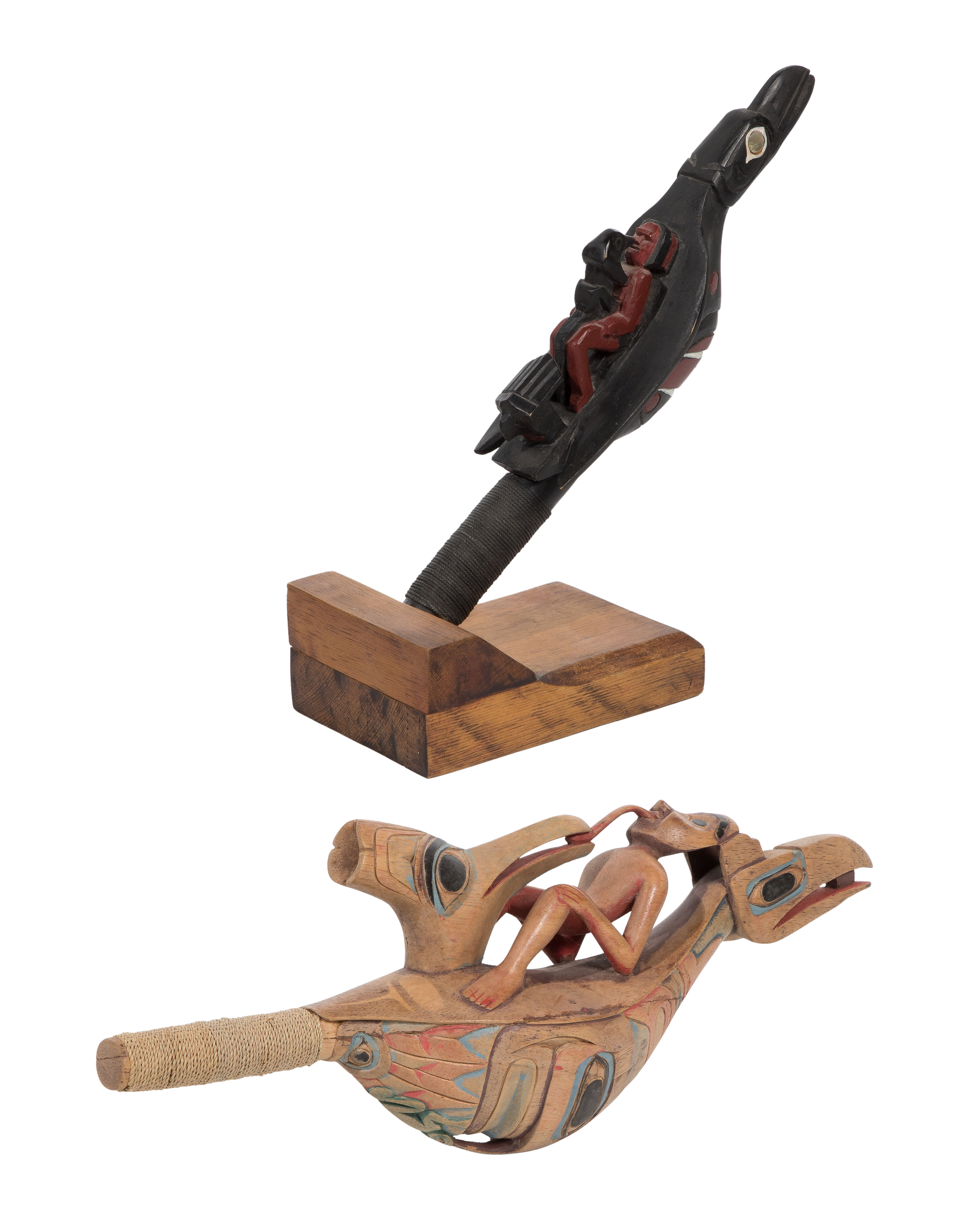 (2) carved and polychrome rattles including a Wilson Bob (Nanoose, 1931-2011) Shaman raven rattle having abalone eyes and stand (signed), and another rattle, both depicting birds and figures having cord wrapped handles