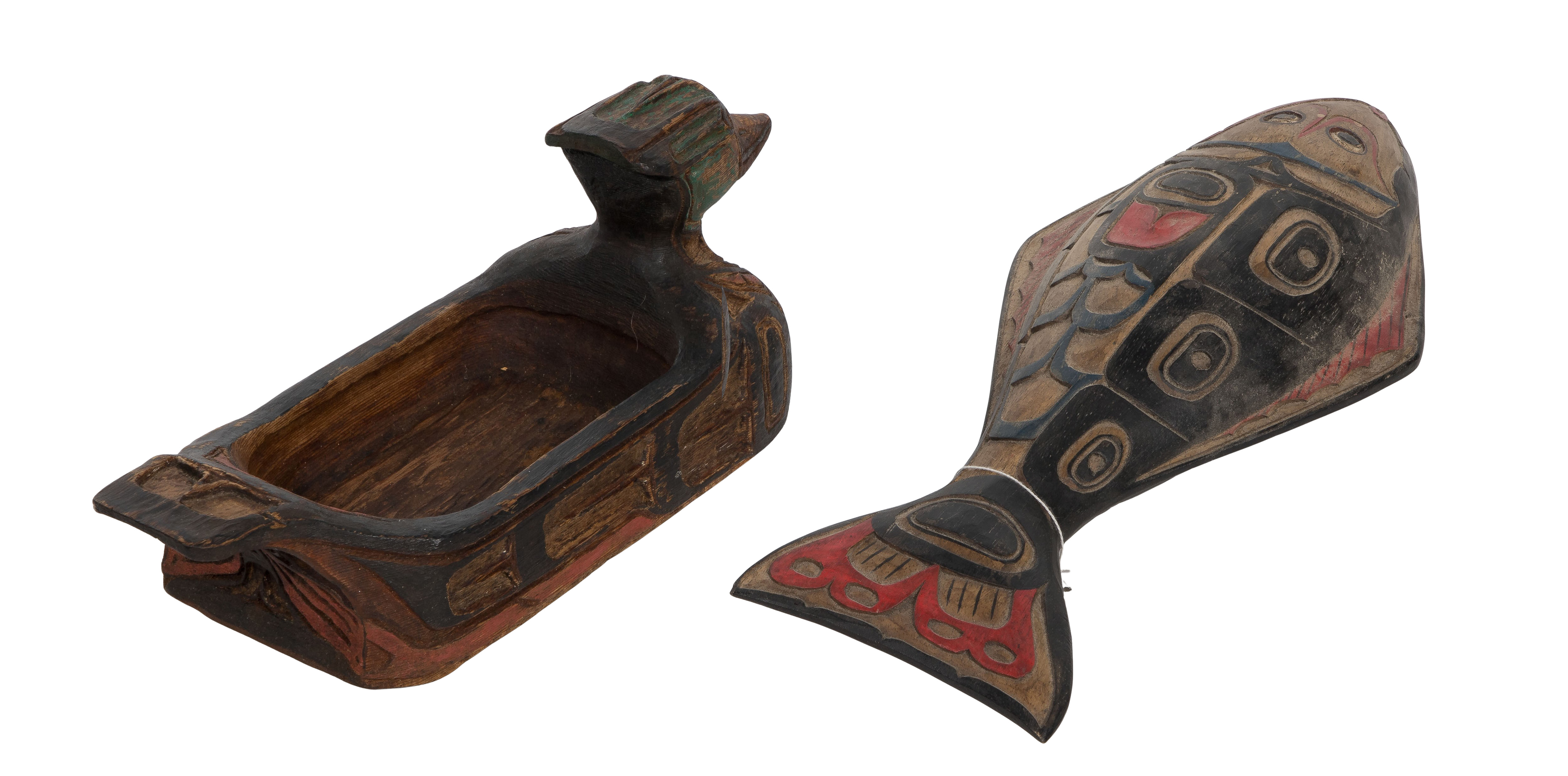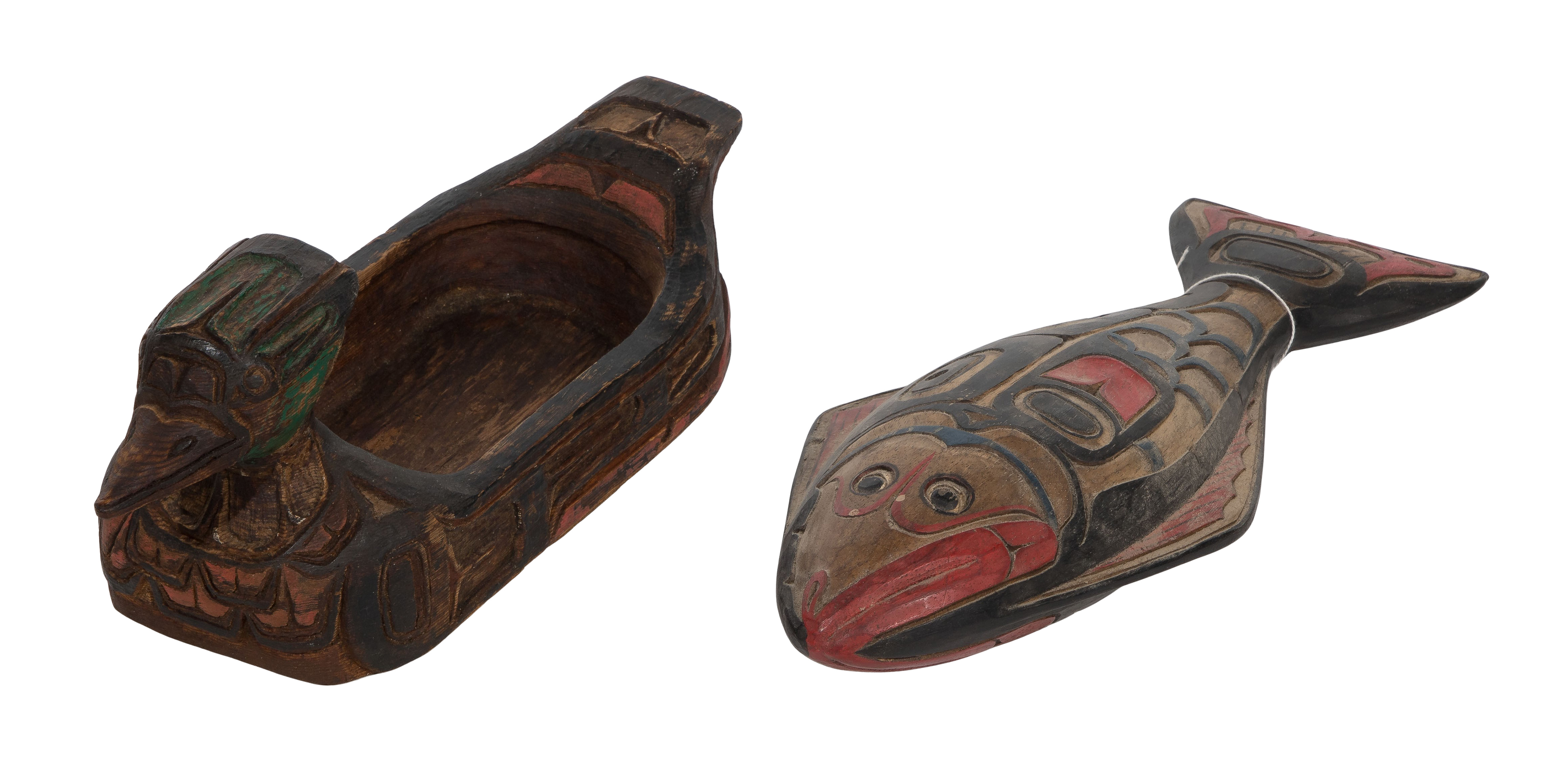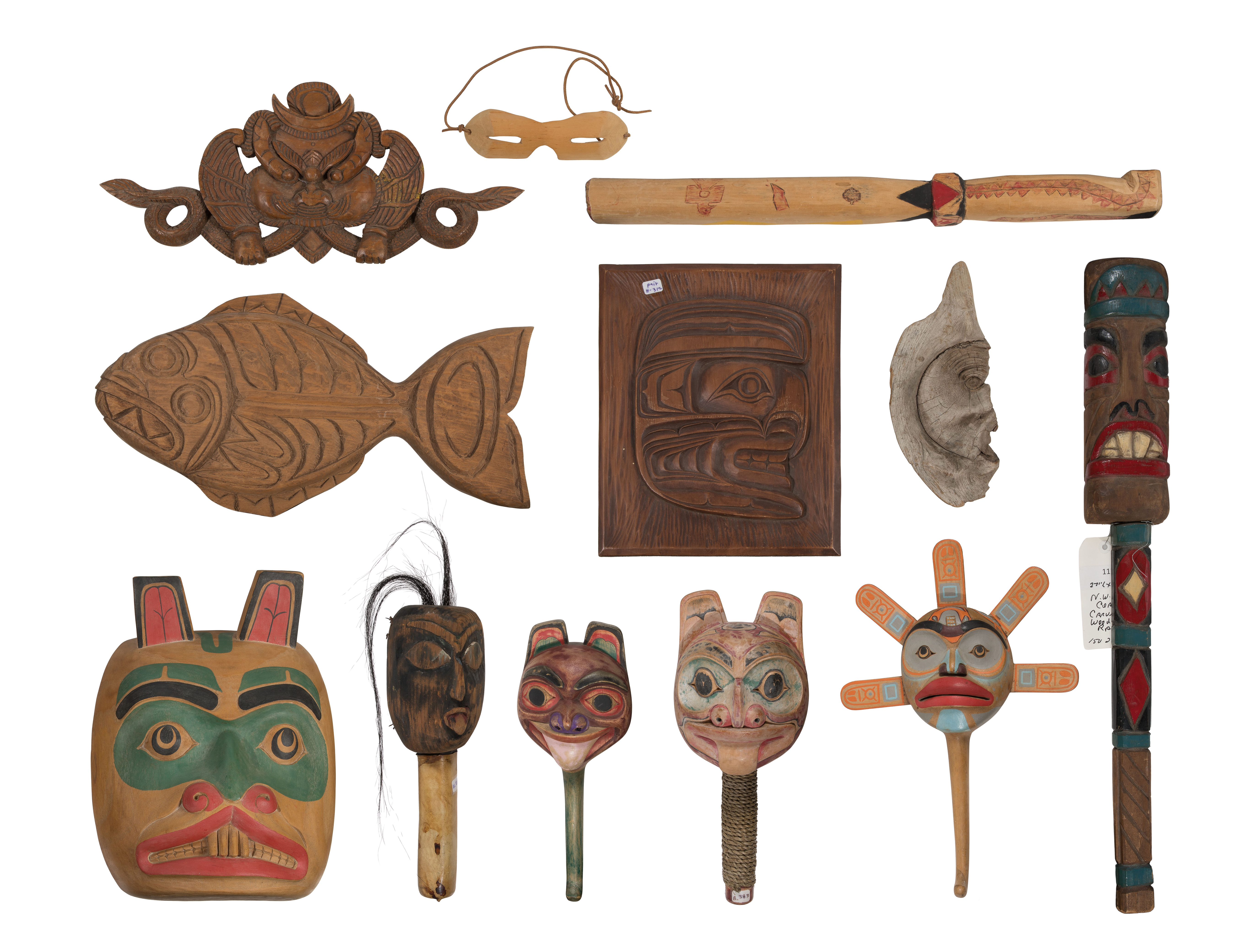(14) total items including a carved Tlingit fish signed ‘Alex Jackson’, a face panel signed ‘William Lee’, (4) effigy dance rattles, a dance stick, a mask, a decorative stick, a carved driftwood face, hunting gogglesvas well as (2) carved and polychrome items including a fish form rattle and a duck form grease bowl; together with a Tibetan Cheppu protection carving