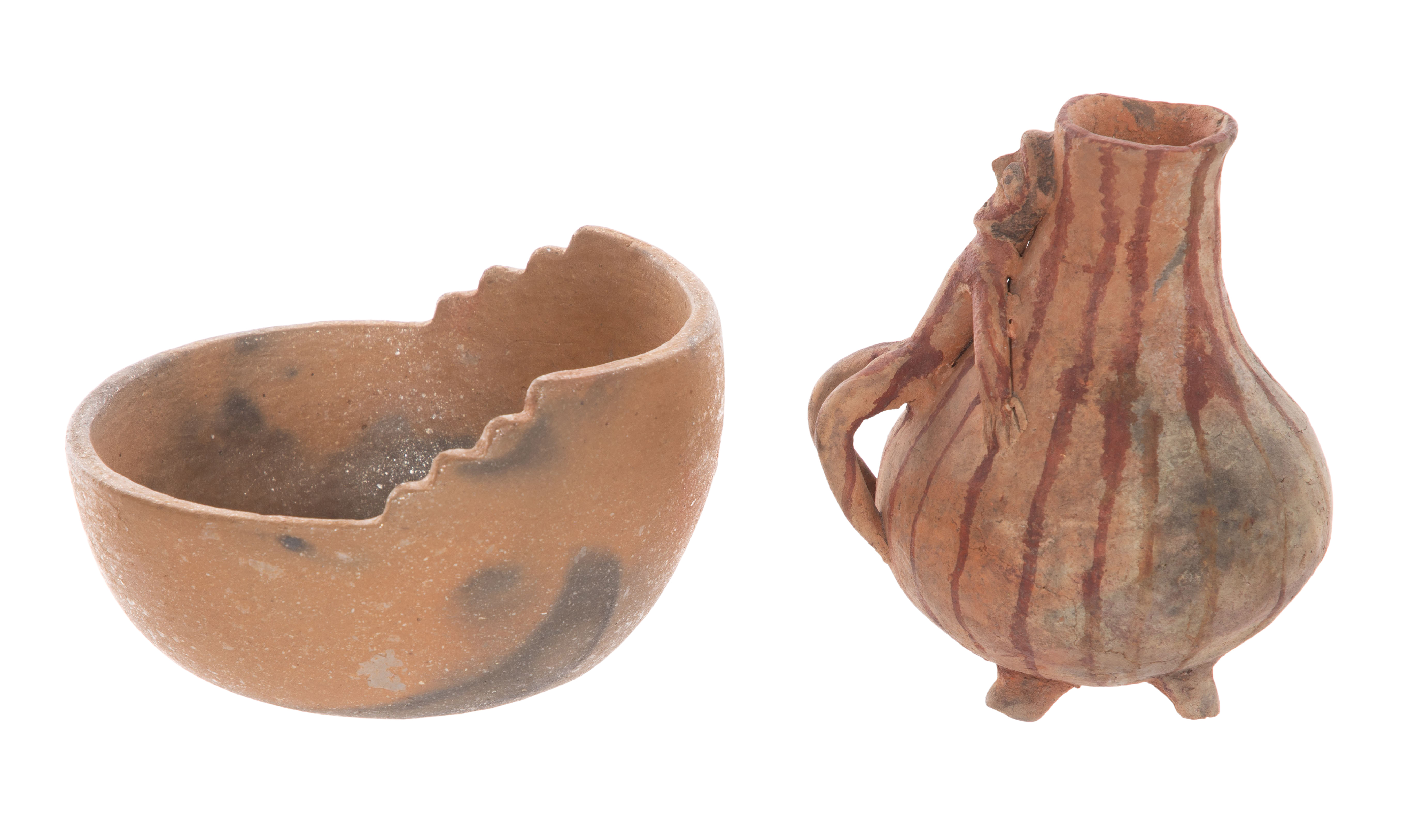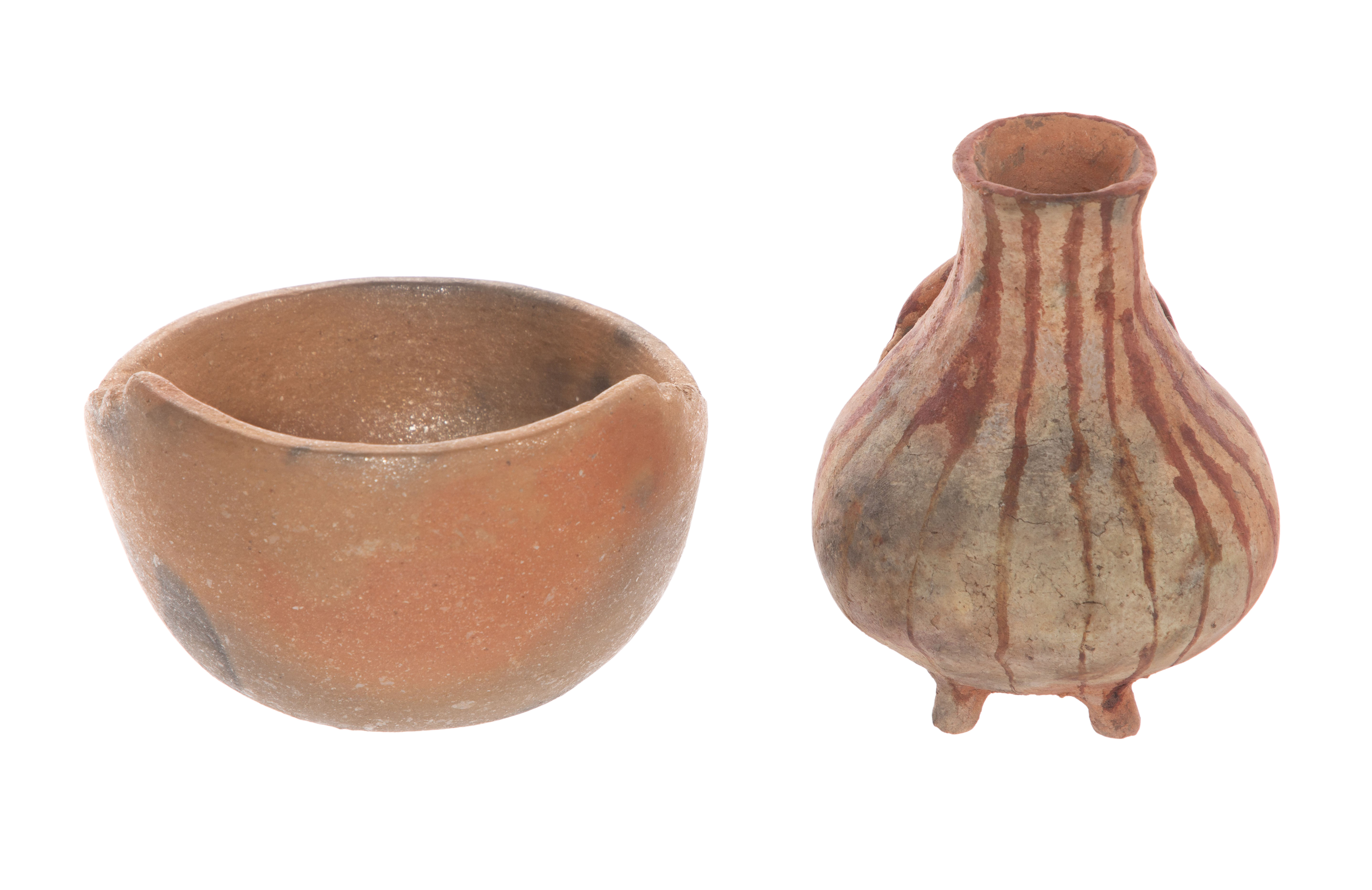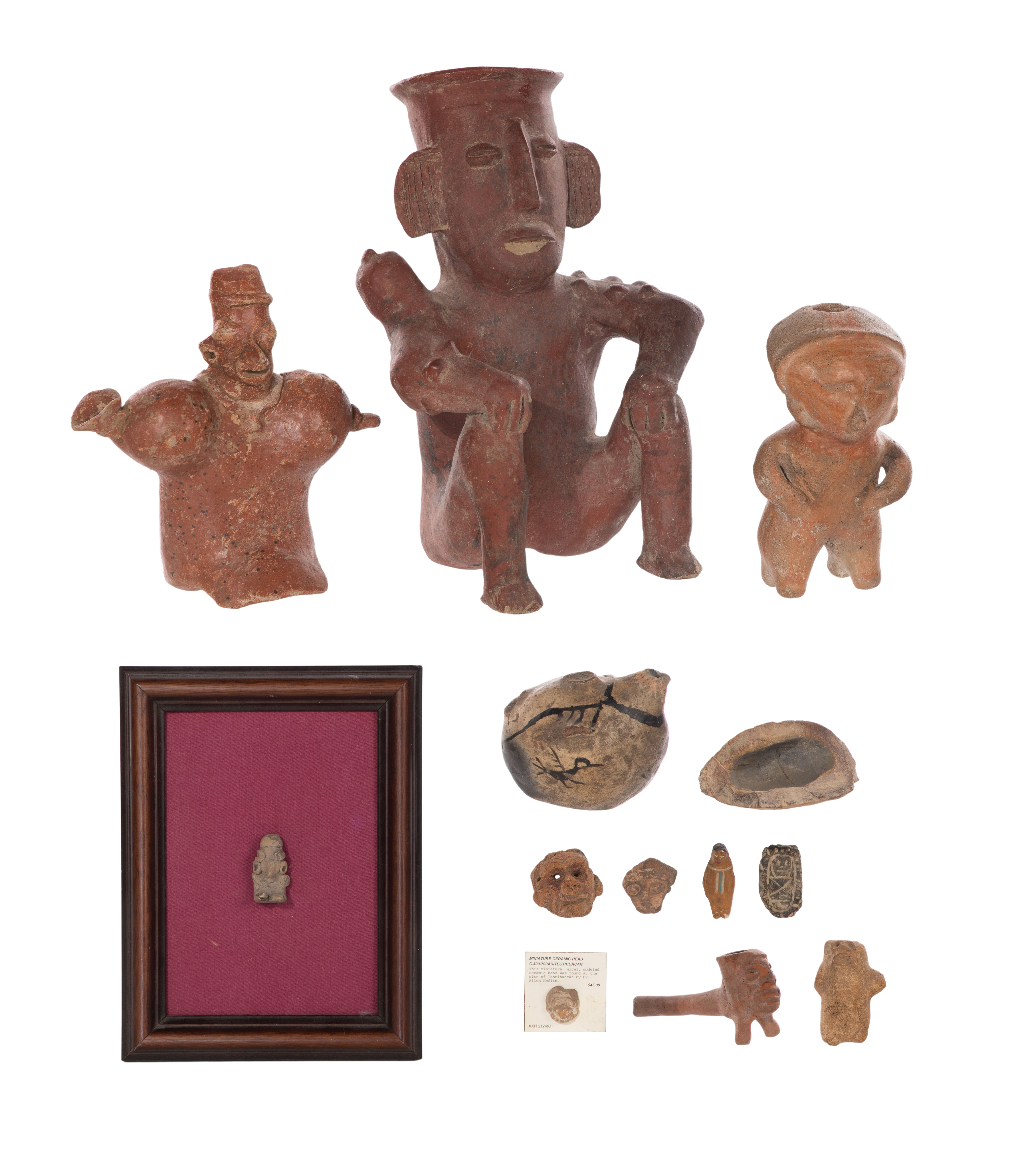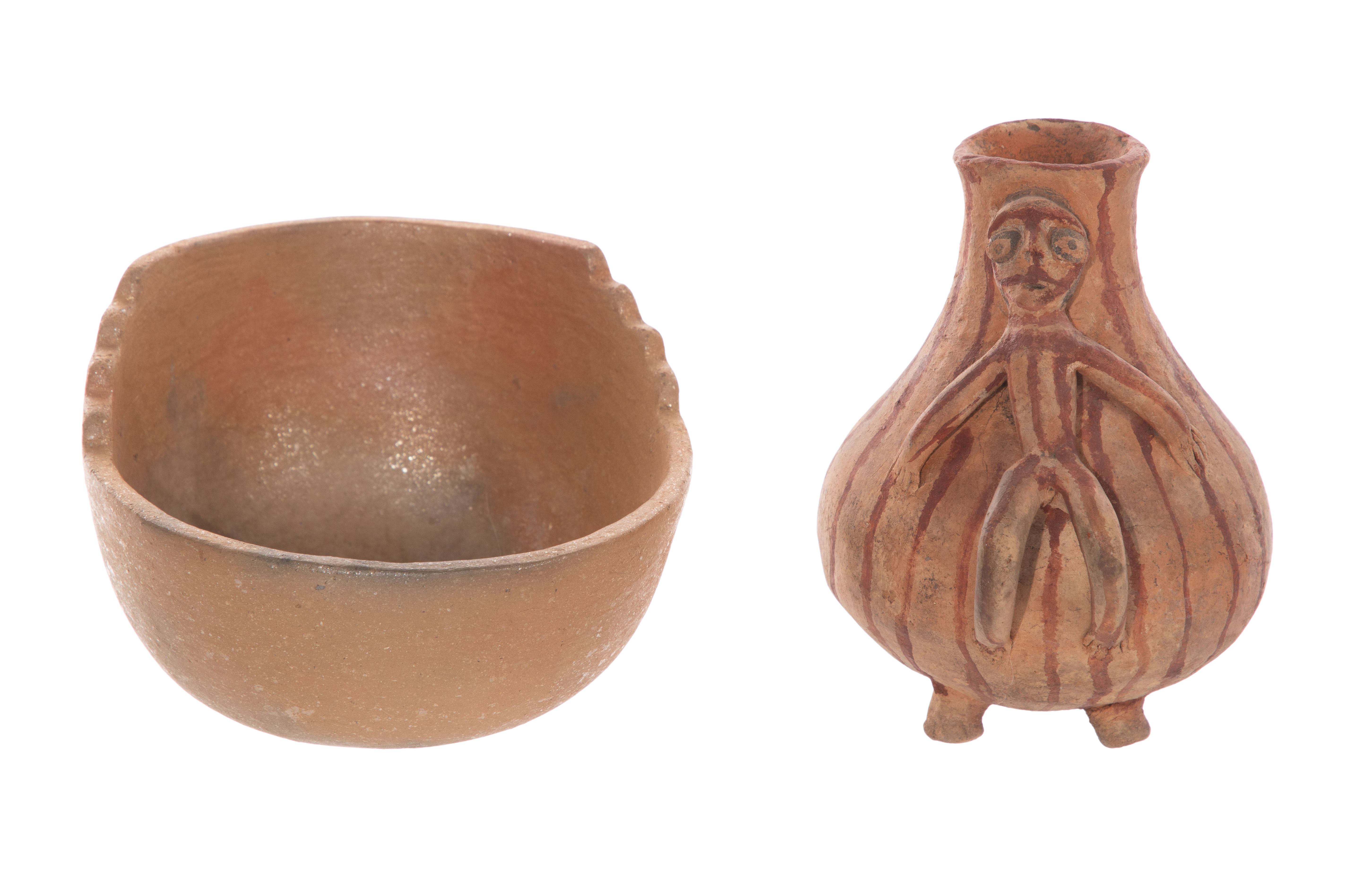 (15) items including Pre-Columbian style figures, fragments, pipes, paint bowls and beads of various materials, sizes and shapes as well as a pre-Columbian style Central American terra-cotta footed vessel having applied figure and a round, earth-toned ceramic micaceous clay bowl having a stepped rim and incised signature