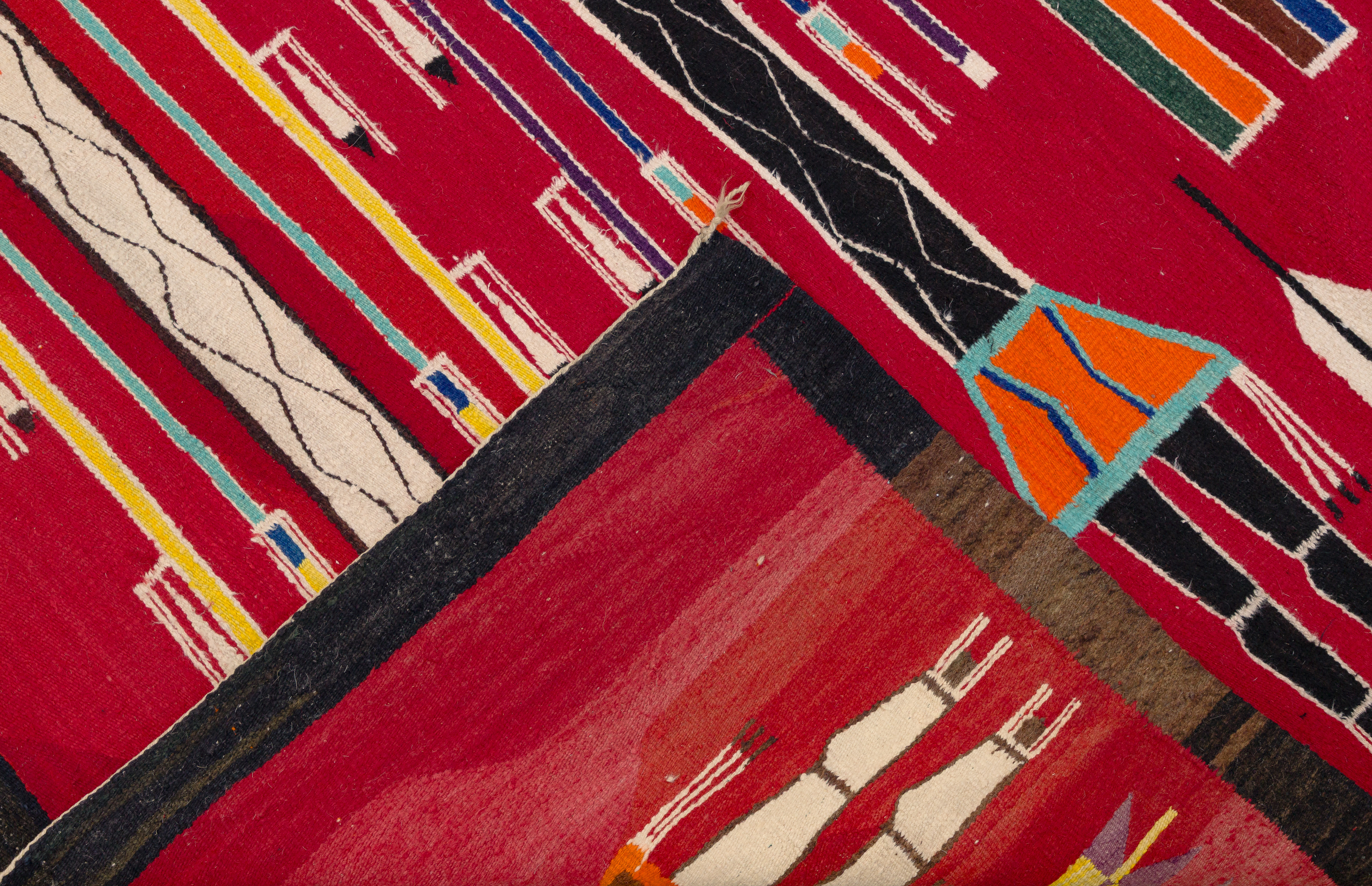 Hand woven Yei style rug in hues of cream, black, purple, orange and blue on a red field