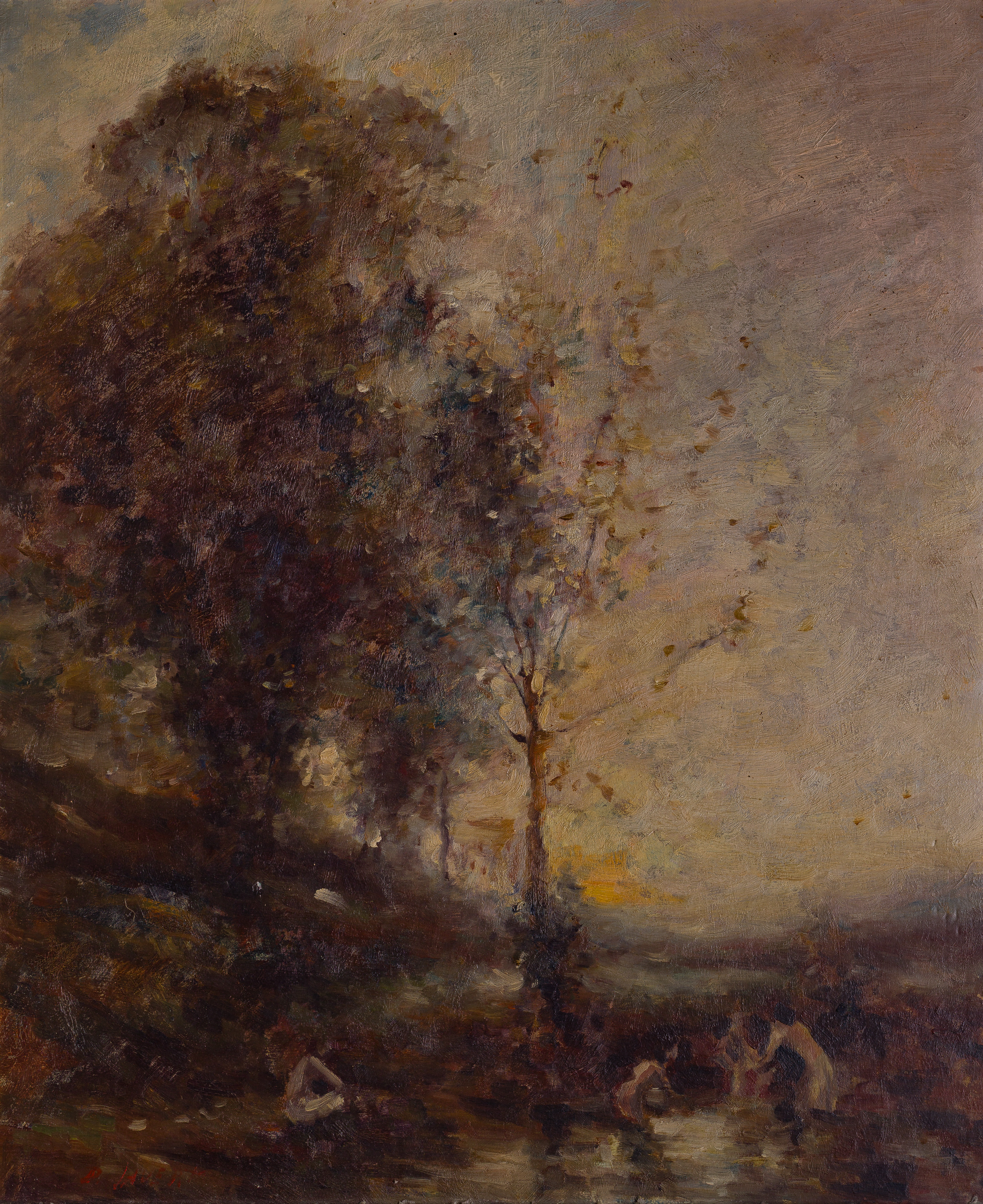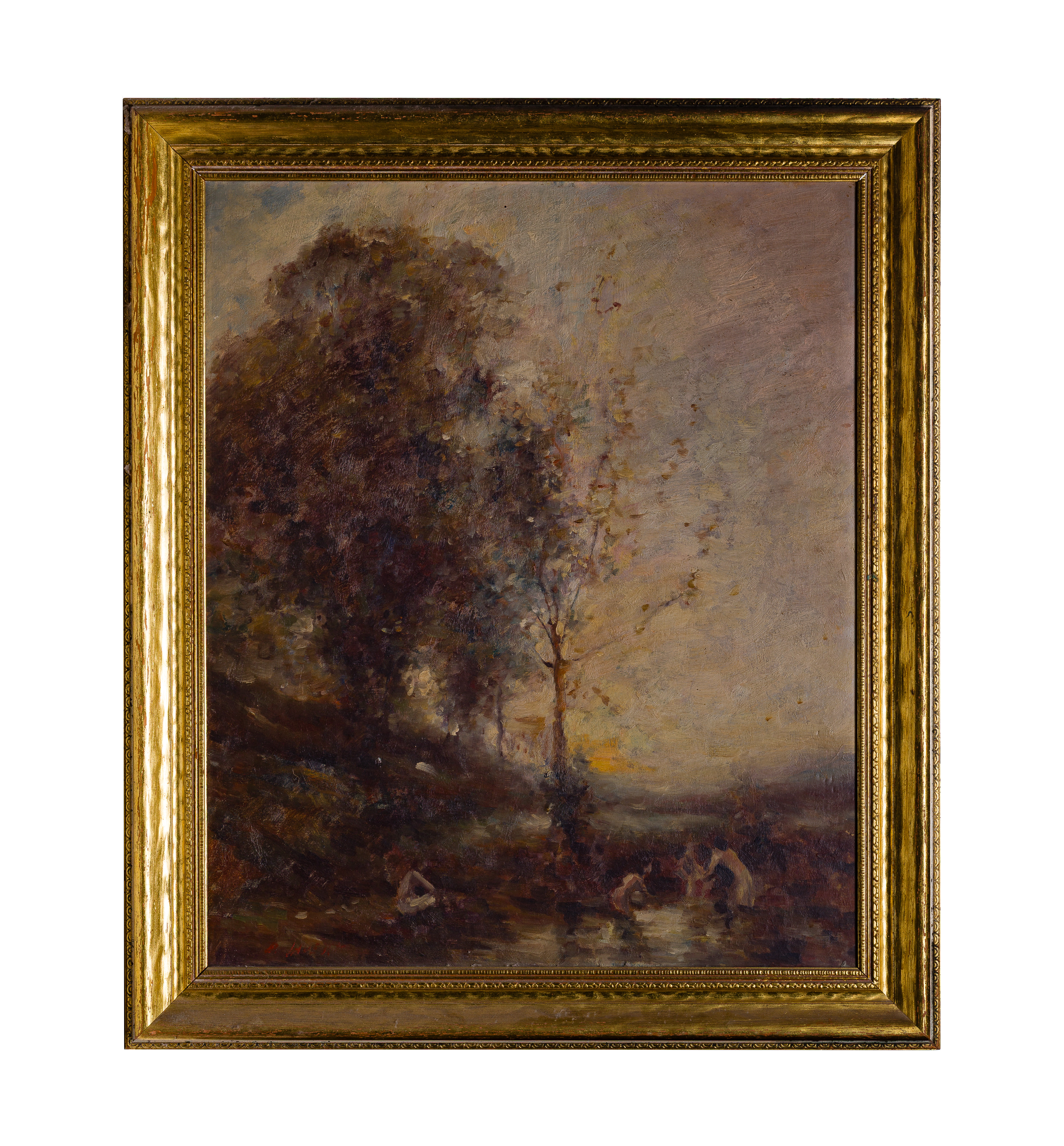 Undated, indistinctly signed depiction of swimmers at a forested waterside, in a gold-tone gesso on carved wood frame