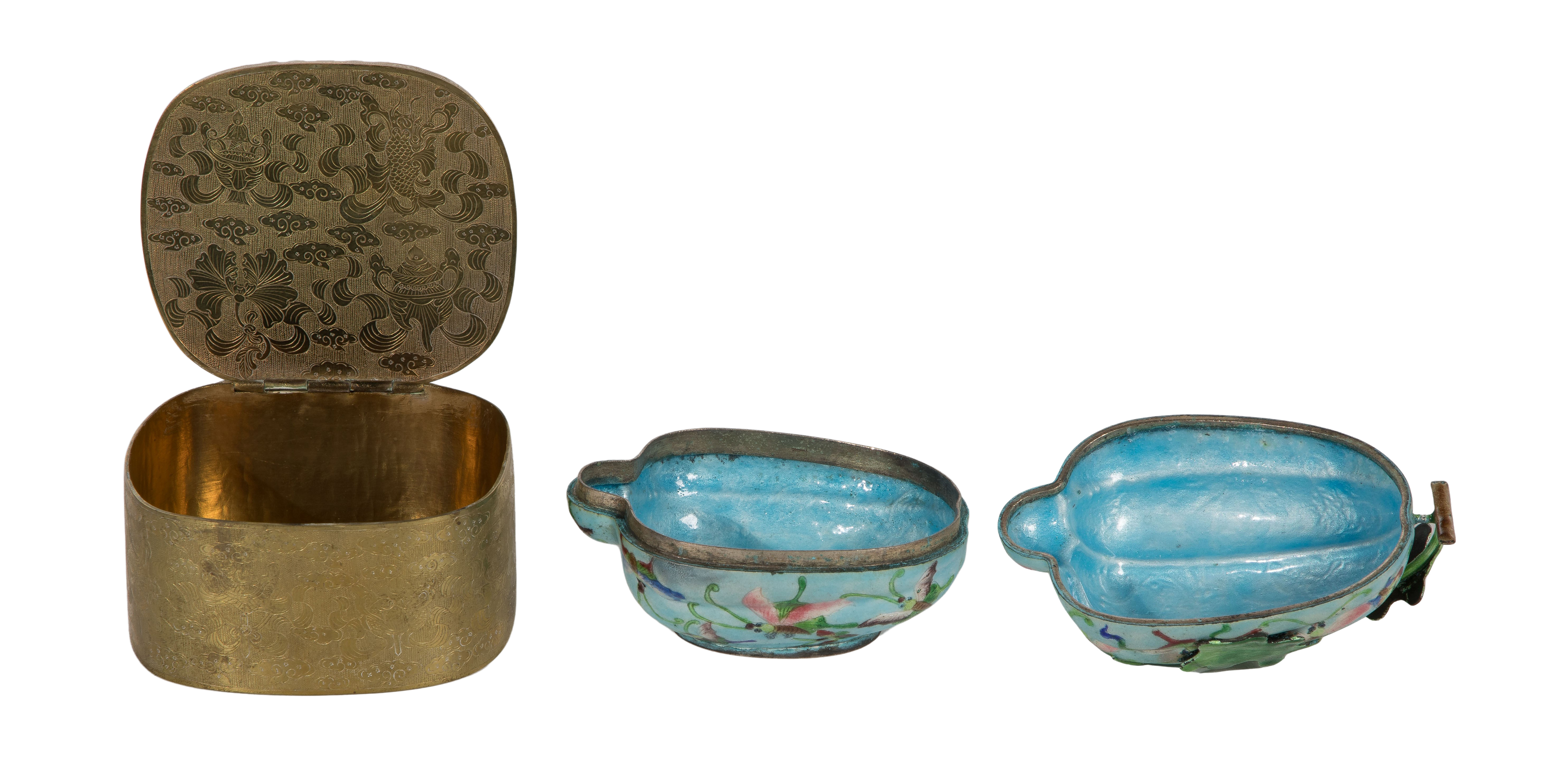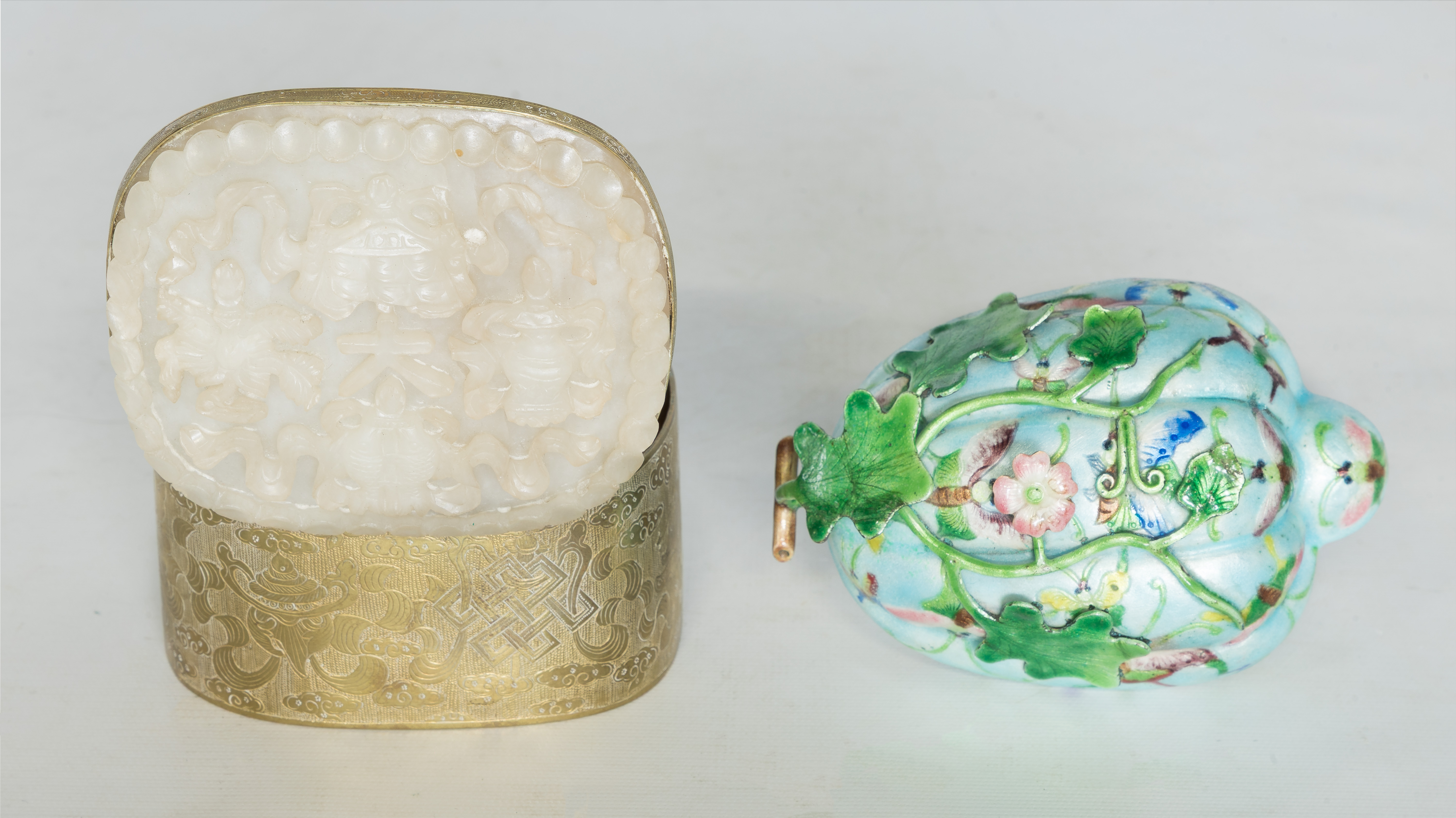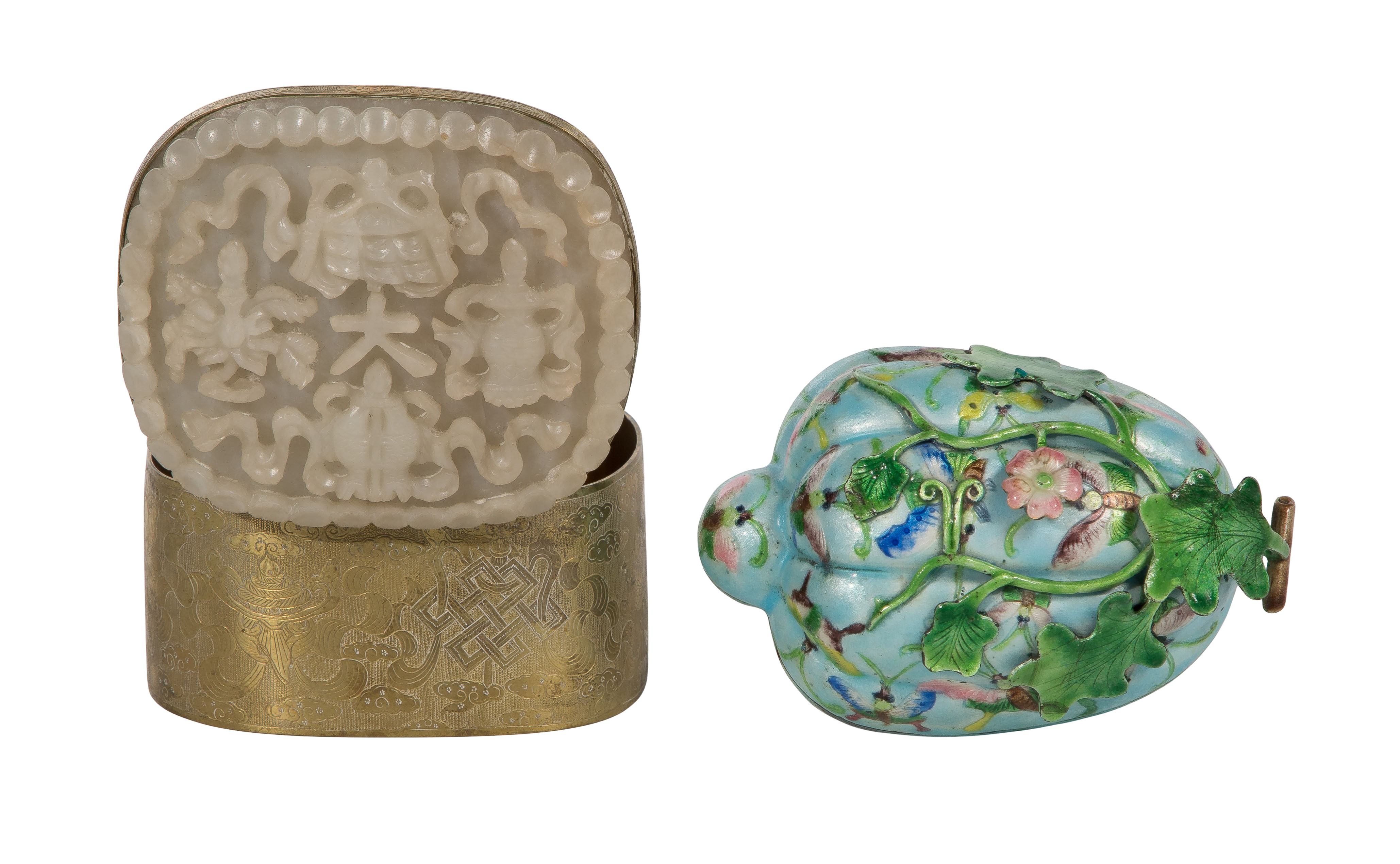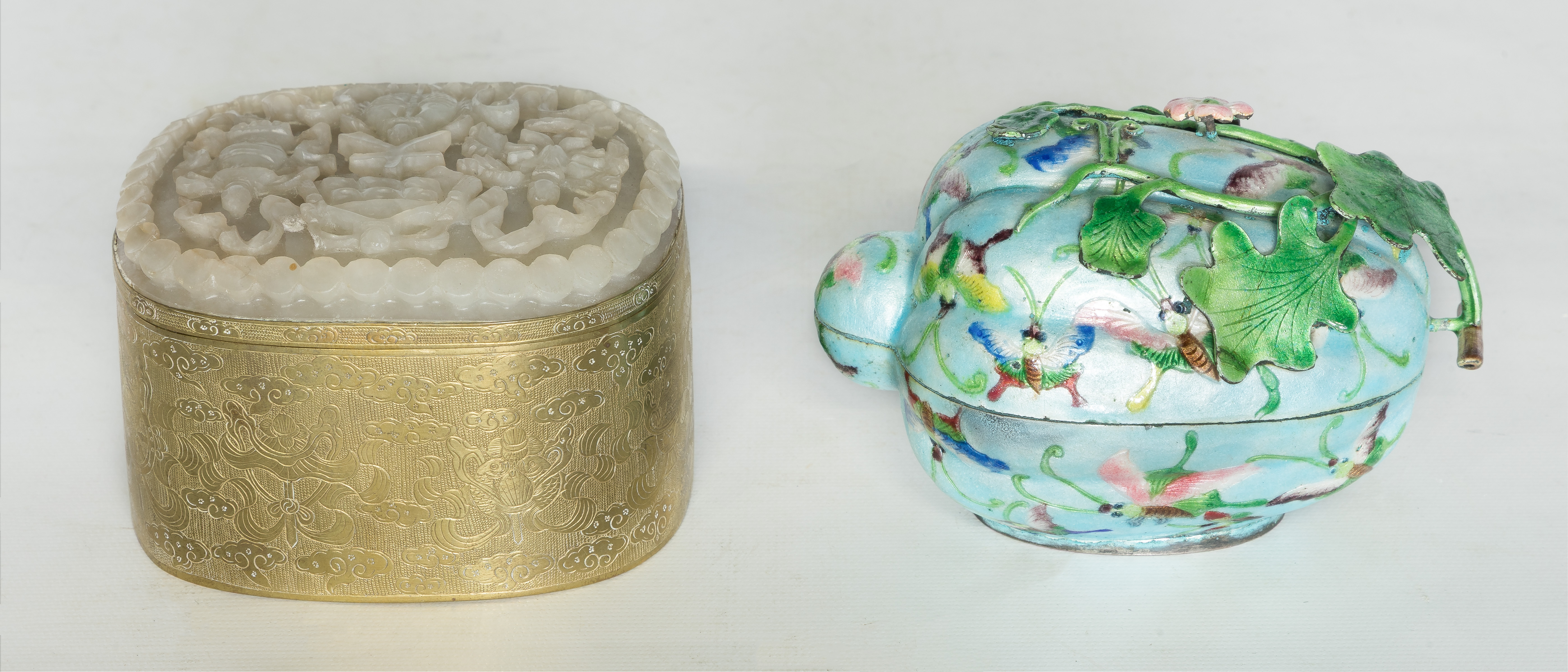 (2) total items including an embossed metal box having a carved jadeite jade lid; together with an enameled copper melon form box having a butterfly and three-dimensional vine and leaves, illegible impressed marks on bottom