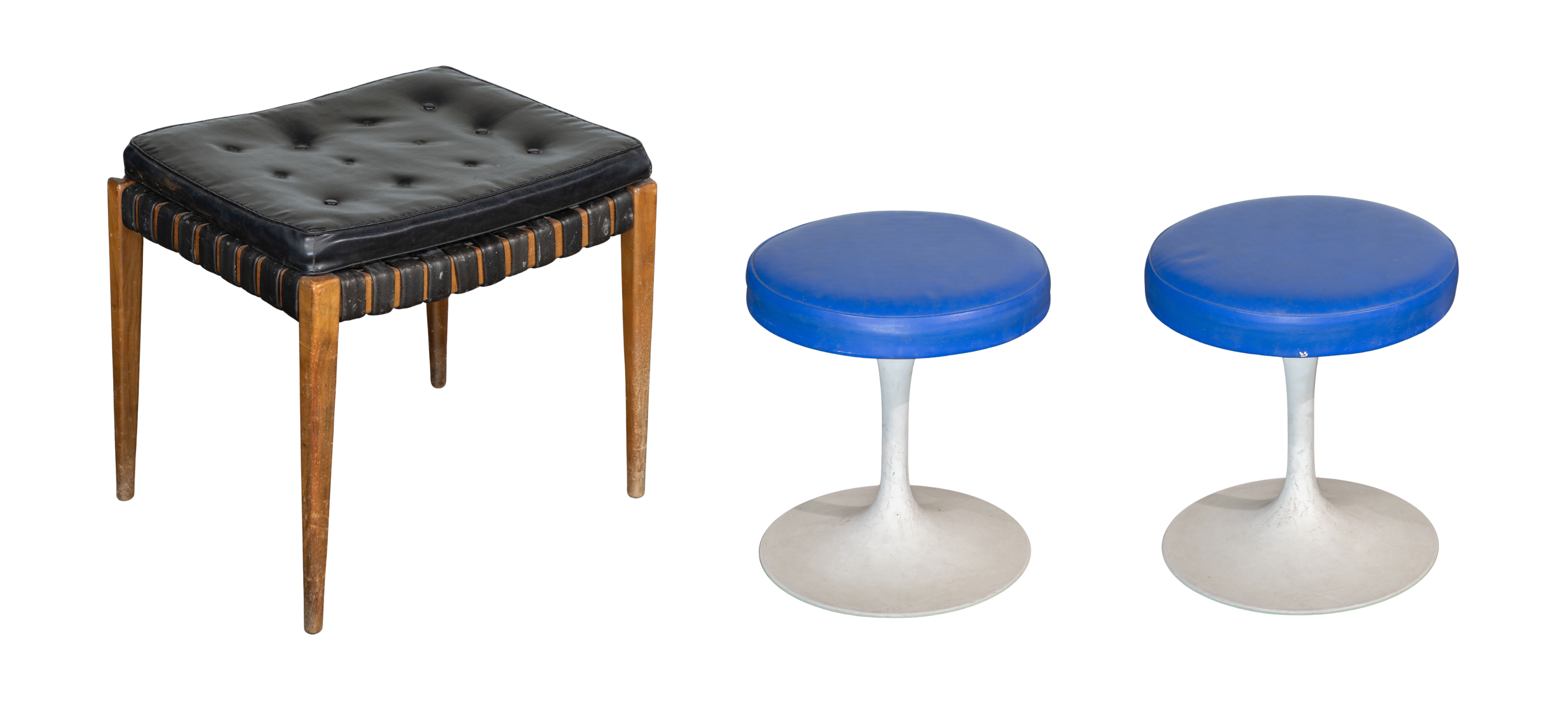 (3) total items including a pair of stools from the Pedestal Collection, having painted metal bases and original blue vinyl seats, retaining original tags; together with a black woven leather ottoman having a tufted cushion