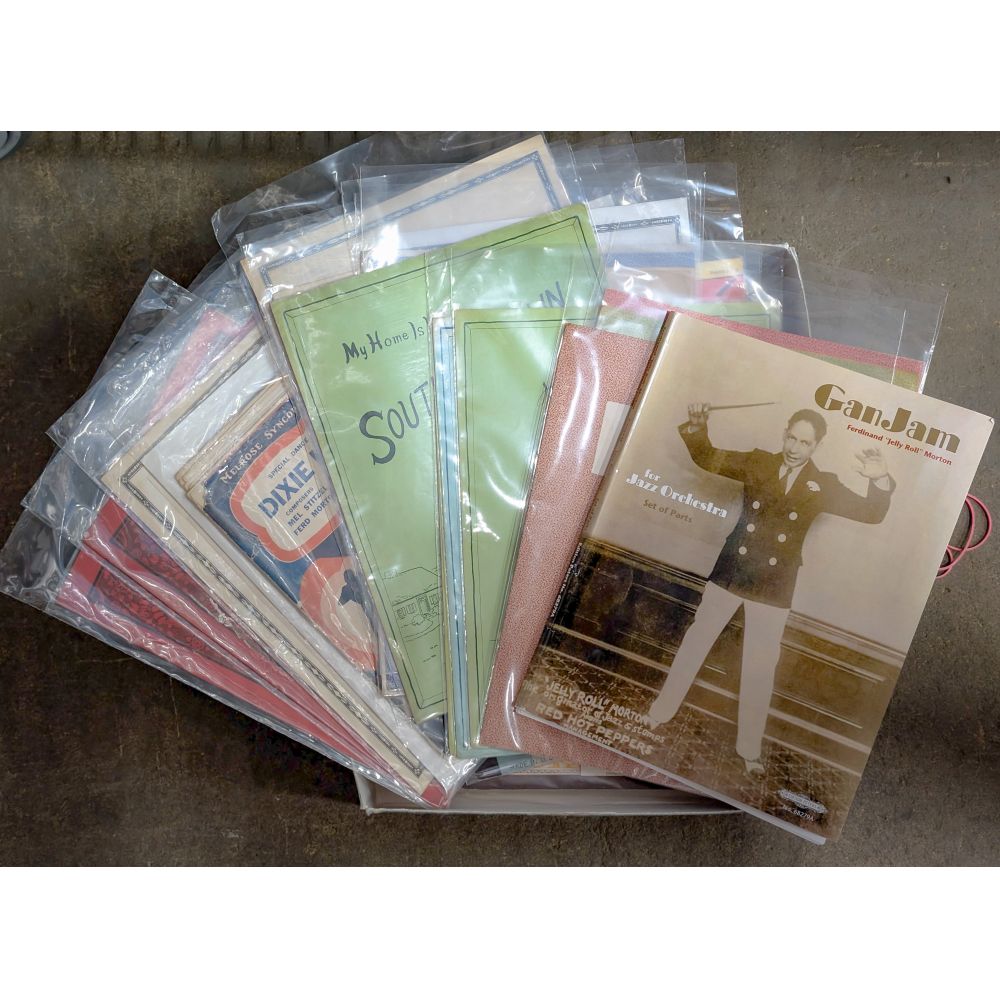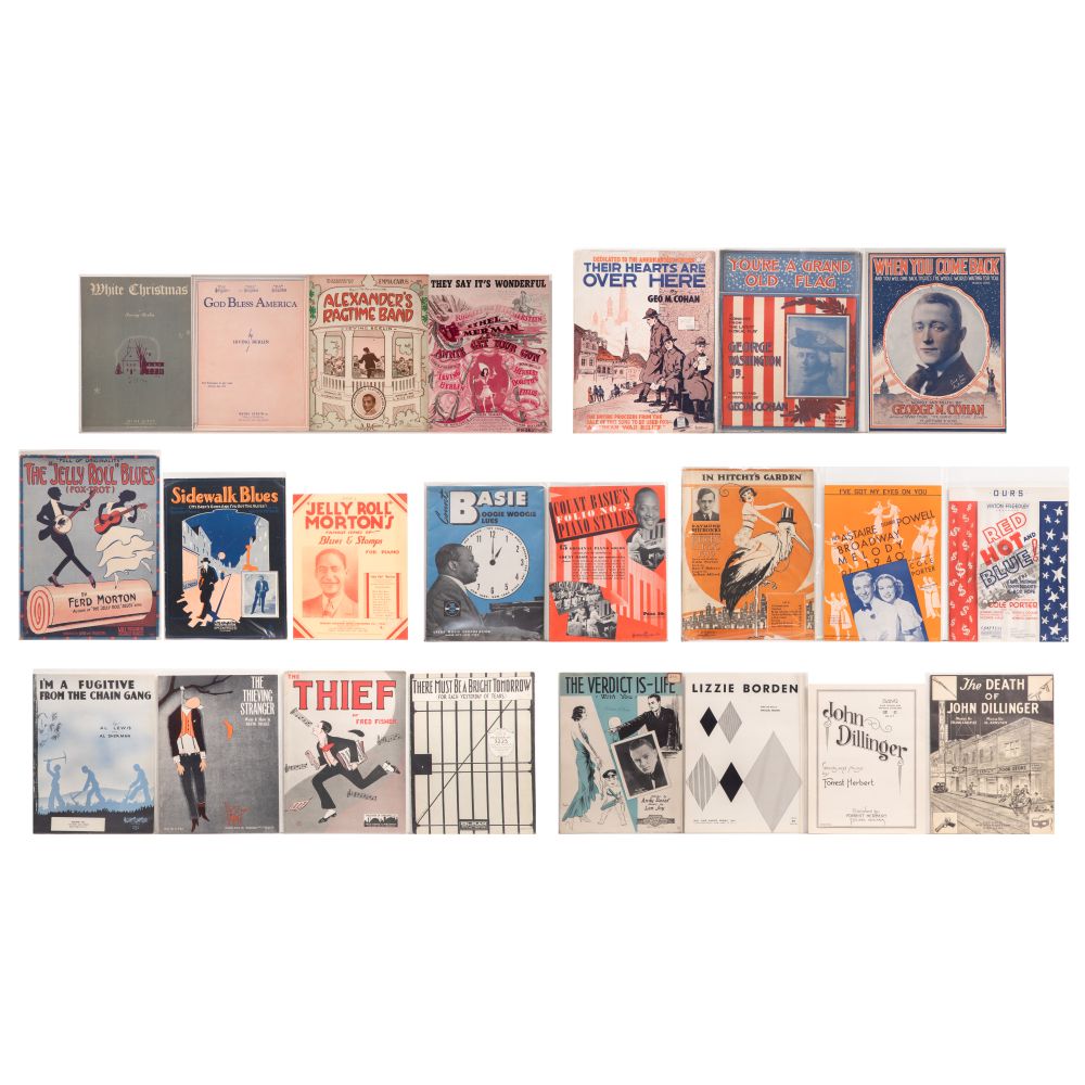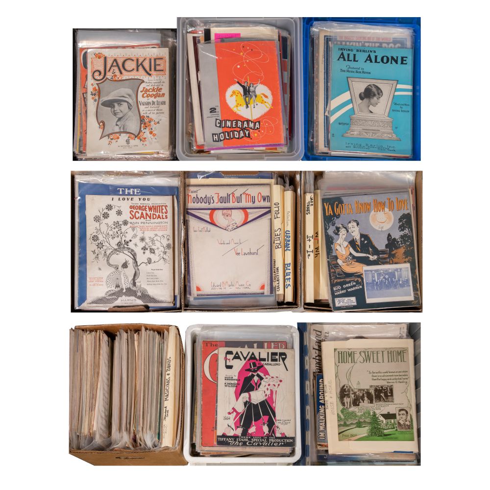 Approximately (2500) items of sheet music, including turn of the century, big band, Broadway, blues, piano solos having artists such as George M. Cohan, Irving Berlin, Cole Porter, Jerome Kern, Jelly Roll Morton, some covers having vibrant lithographic art illustrations, most stored in plastic sleeves