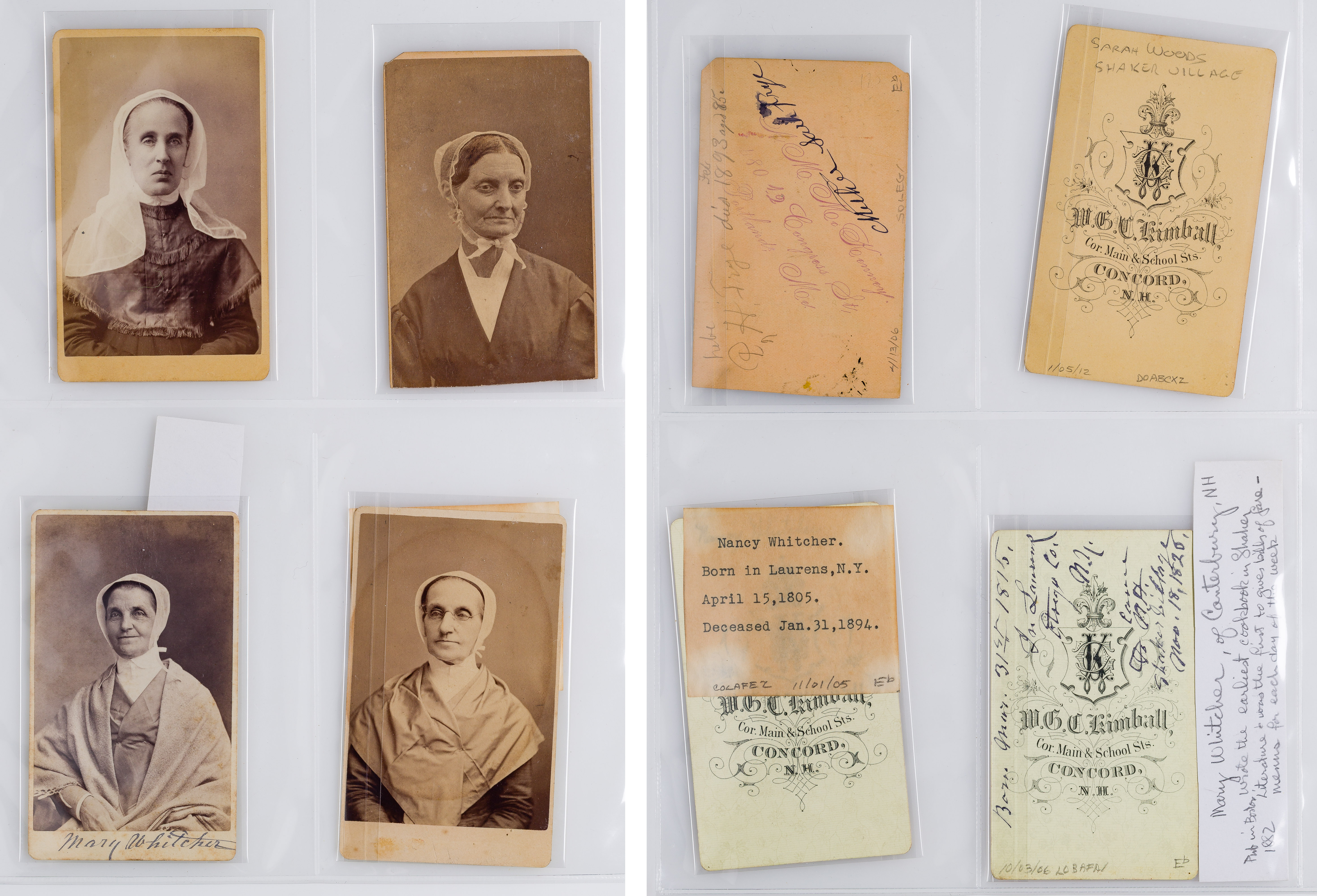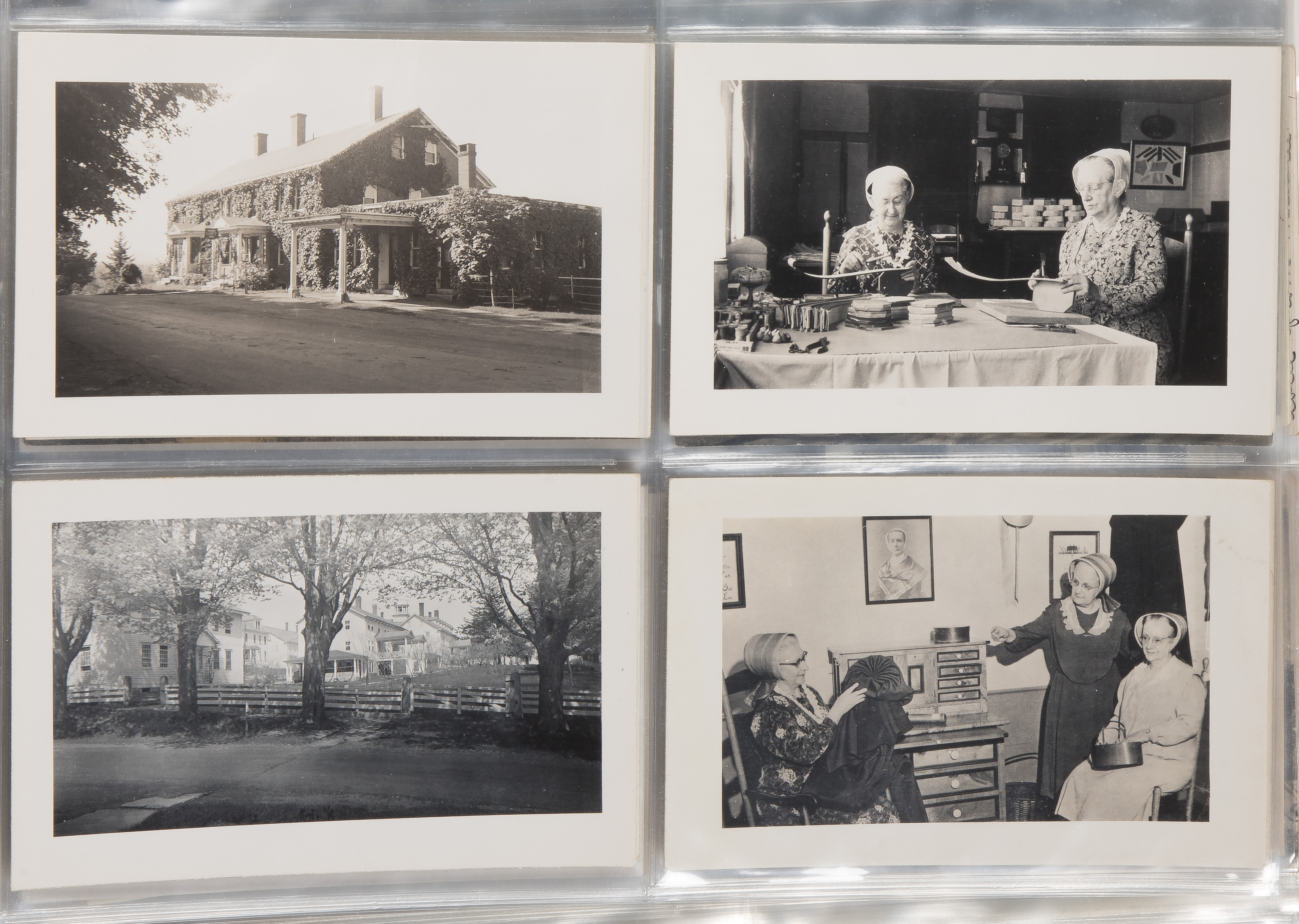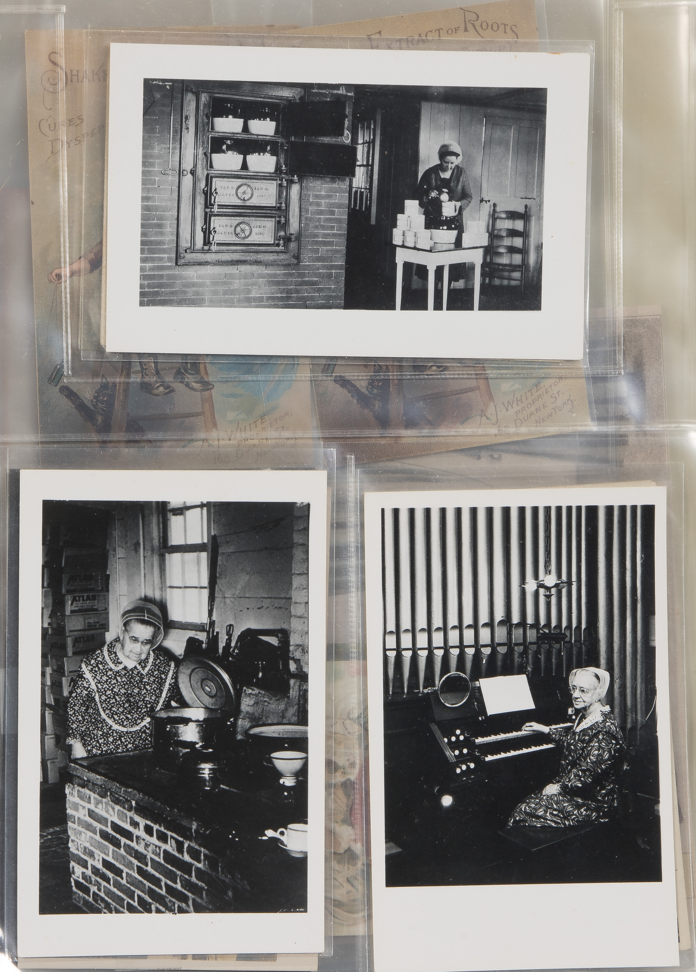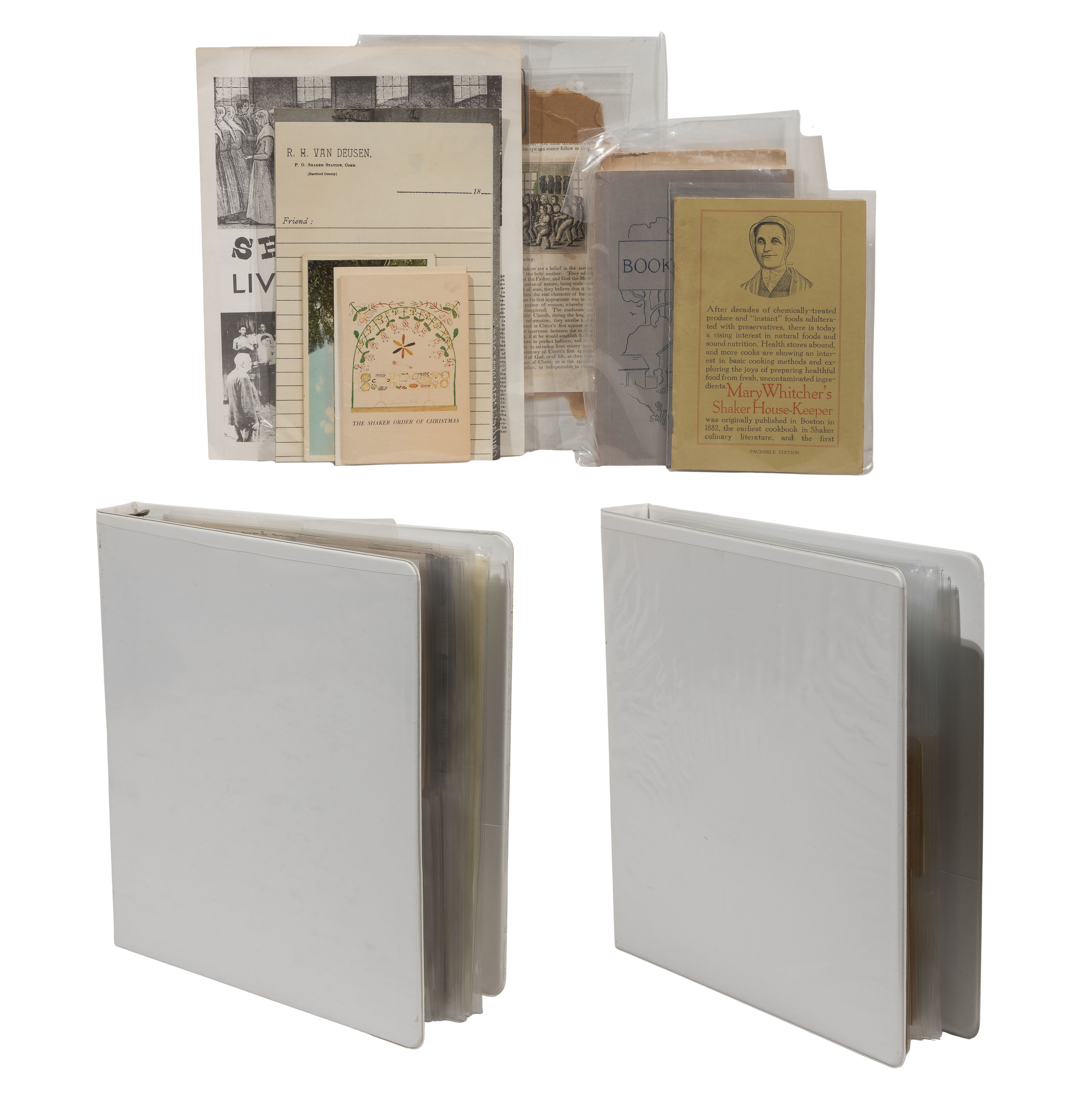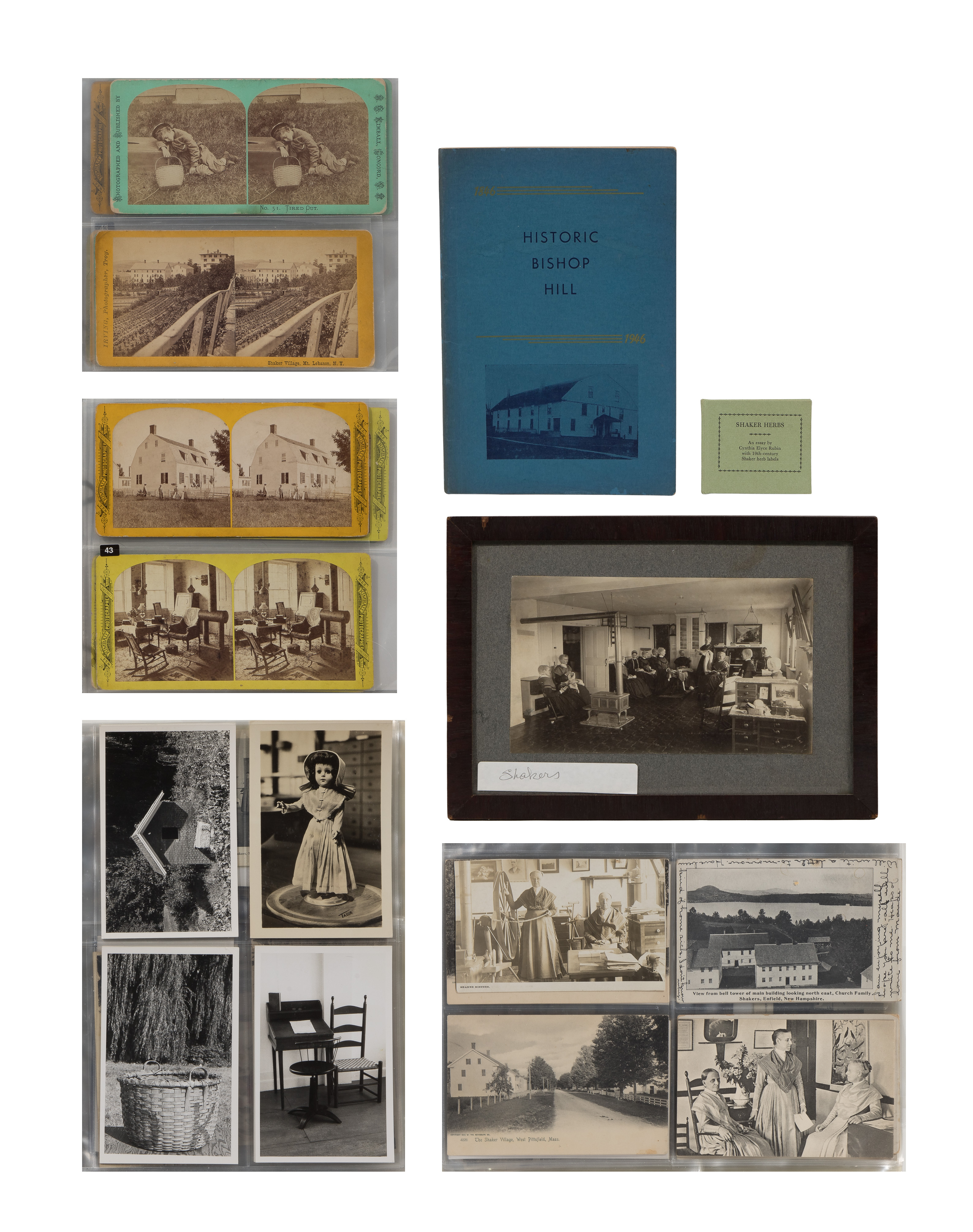 Approximately (125) total items including cabinet cards, cartes de visite, stereoviews and postcards depicting members of the Shaker movement and activities, many in a binder, a framed mounted to card behind glass in a wood frame; together with approximately (30) ephemeral items including paper labels for herbs and ointments, booklets and a map