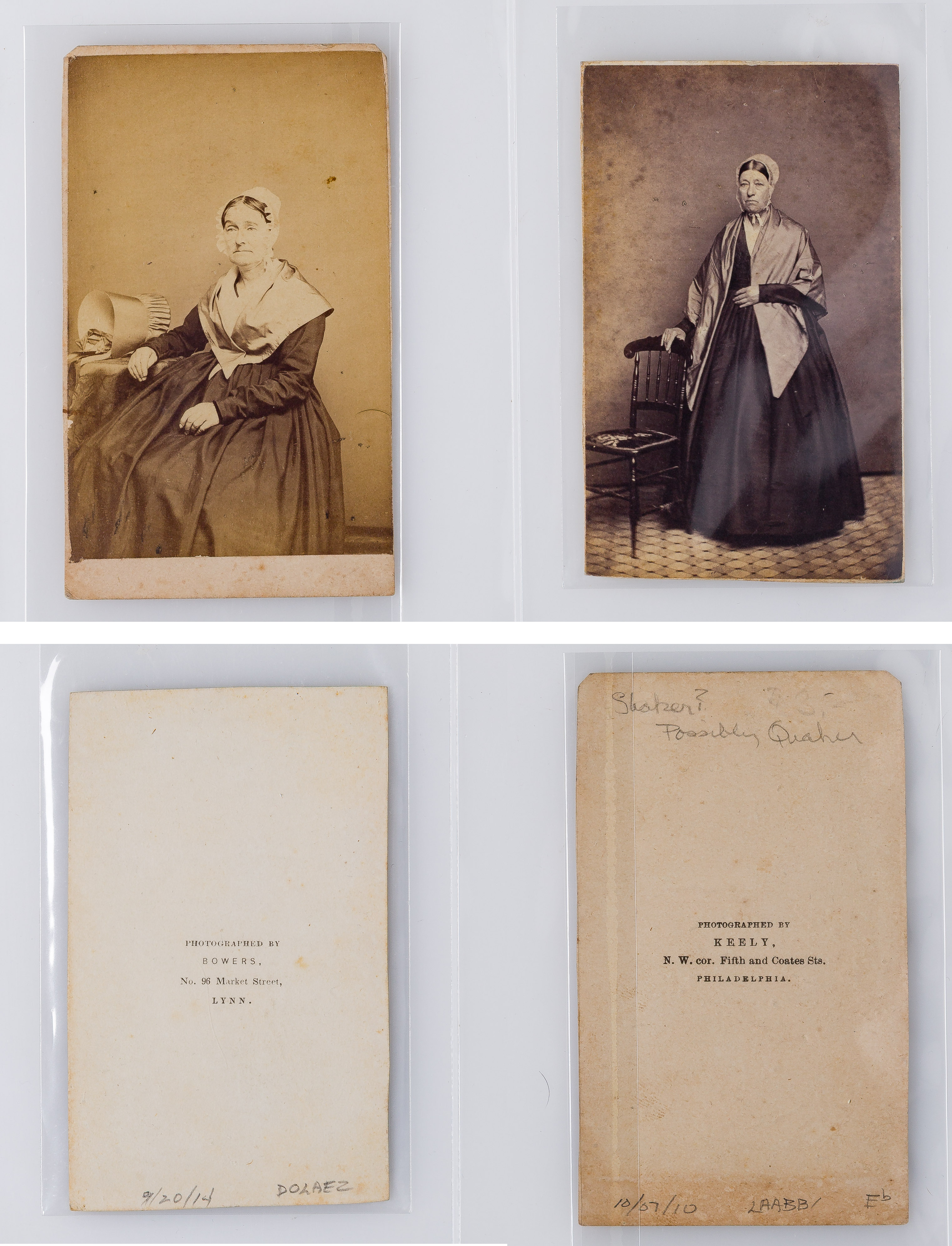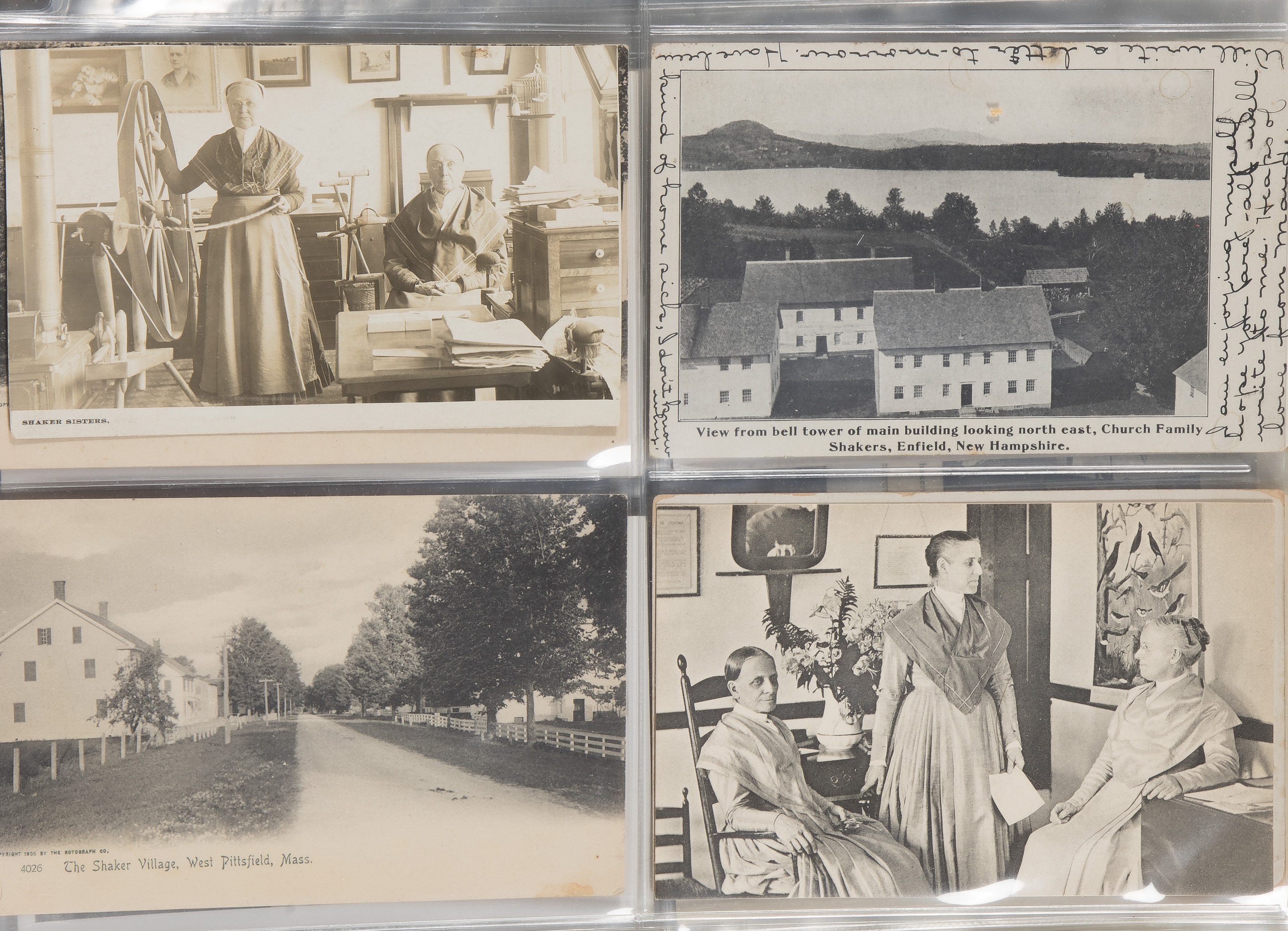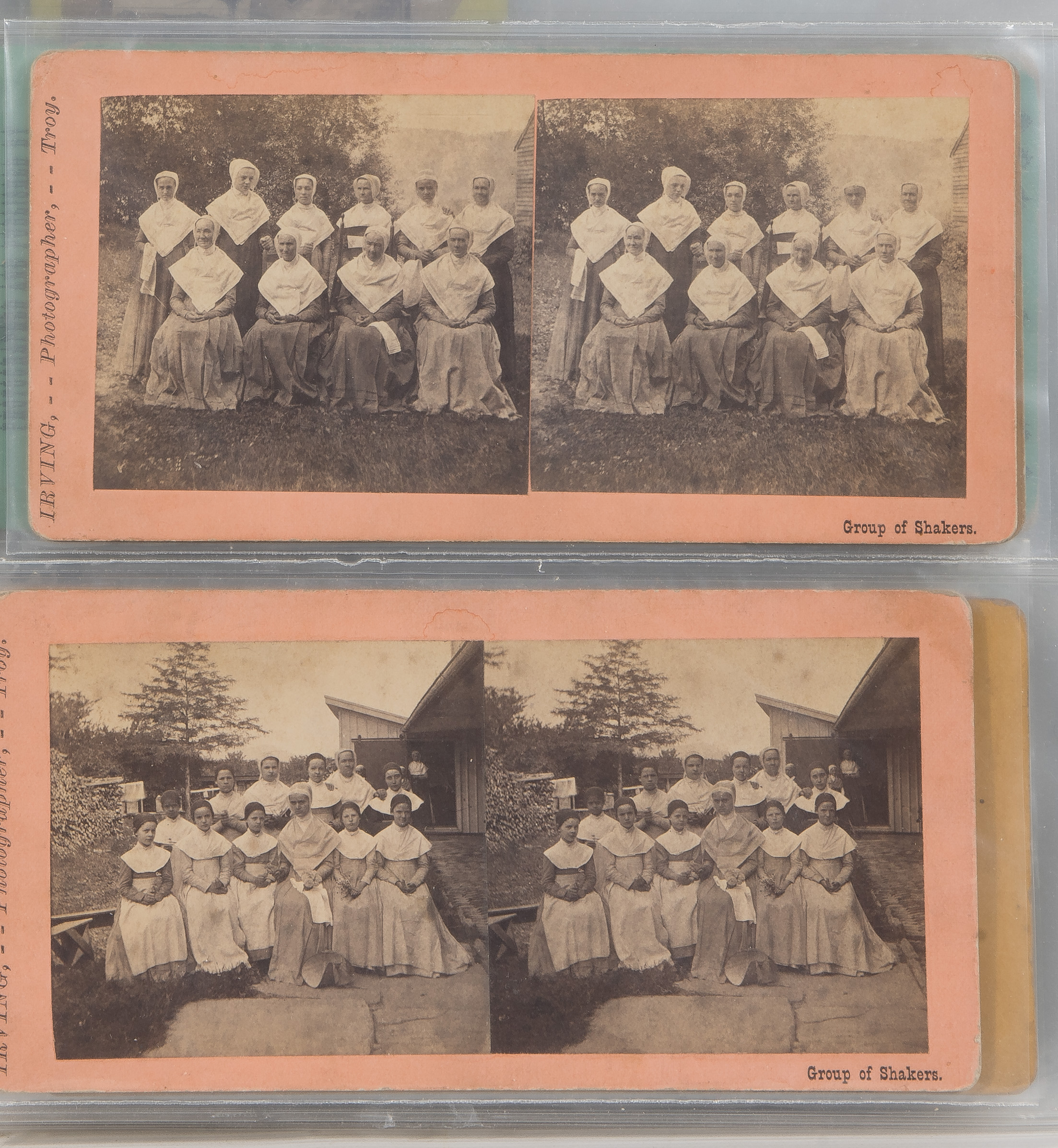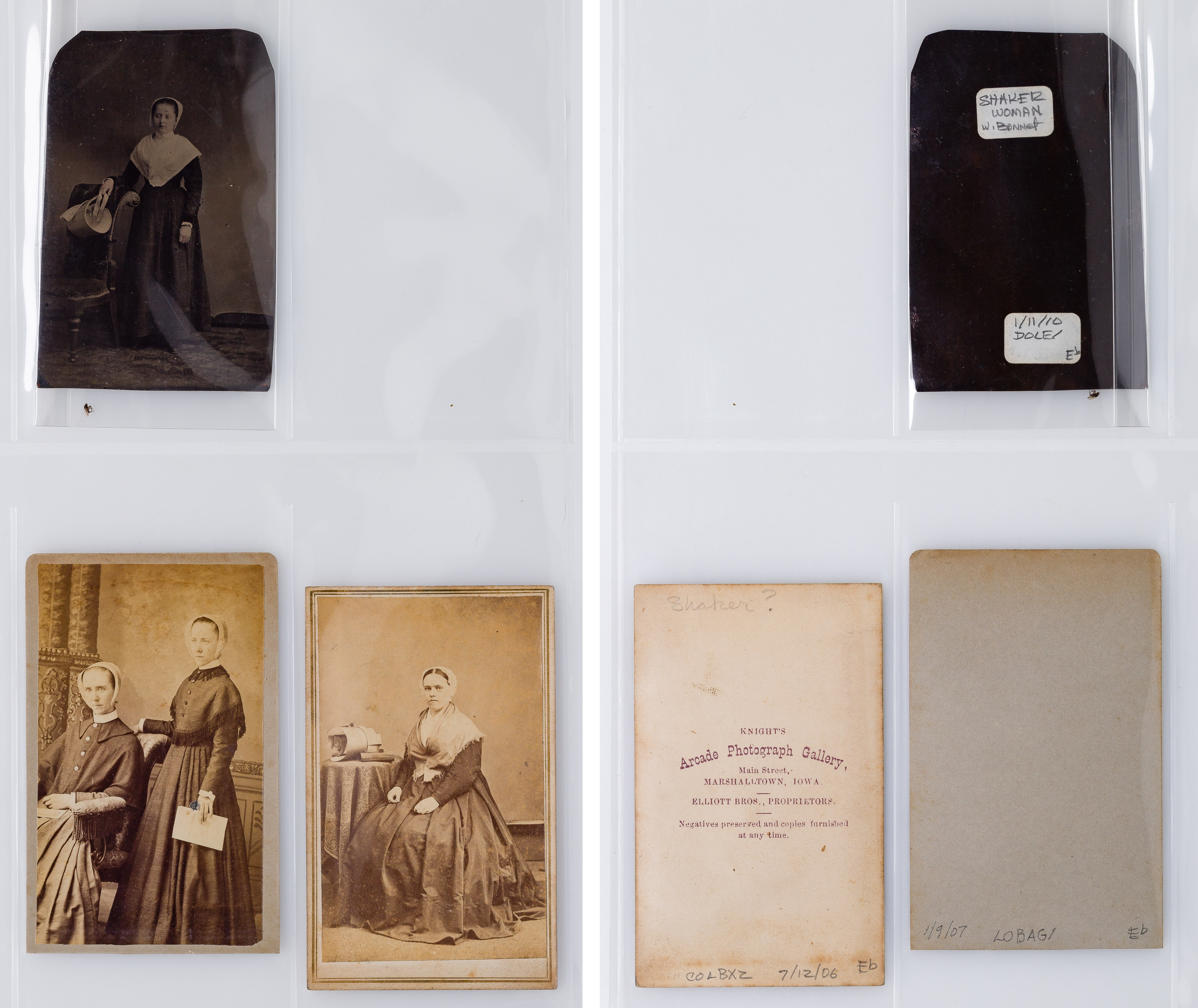 Approximately (125) total items including cabinet cards, cartes de visite, stereoviews and postcards depicting members of the Shaker movement and activities, many in a binder, a framed mounted to card behind glass in a wood frame; together with approximately (30) ephemeral items including paper labels for herbs and ointments, booklets and a map