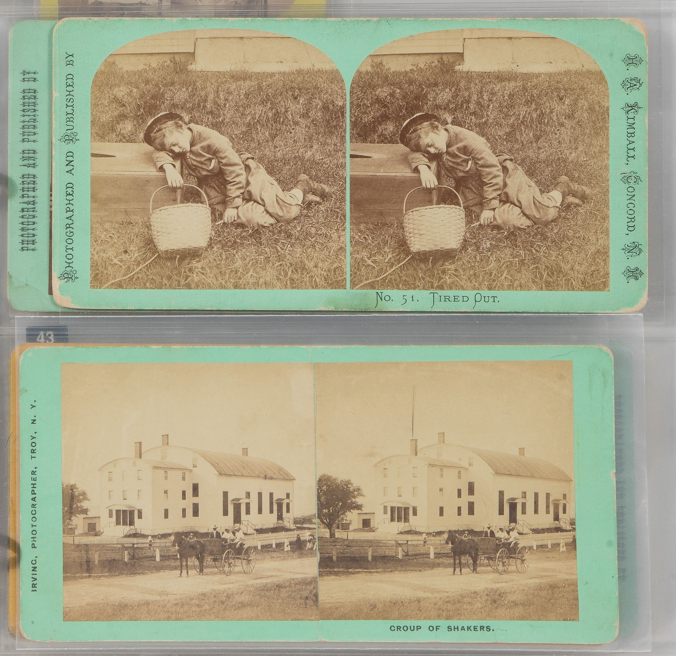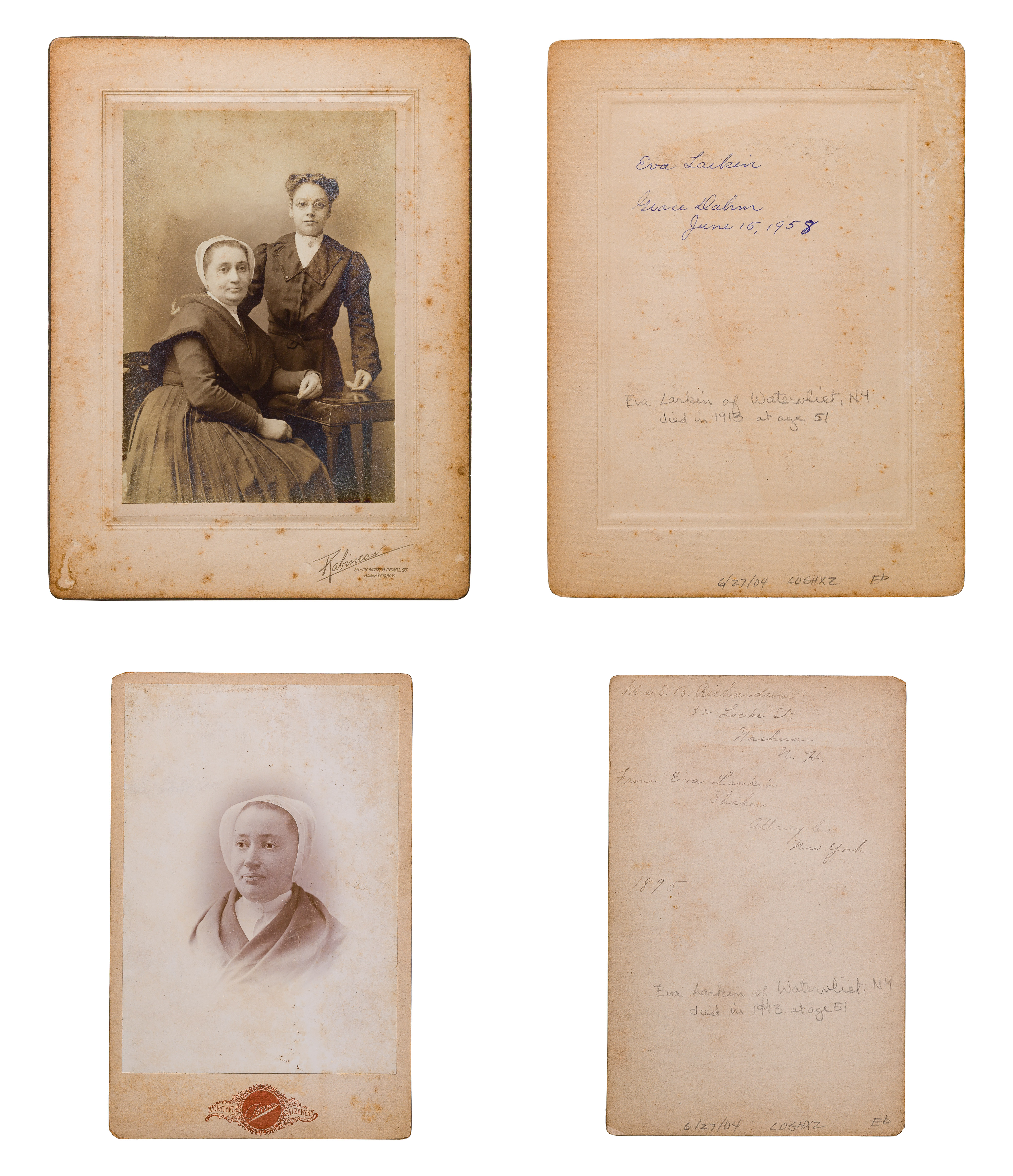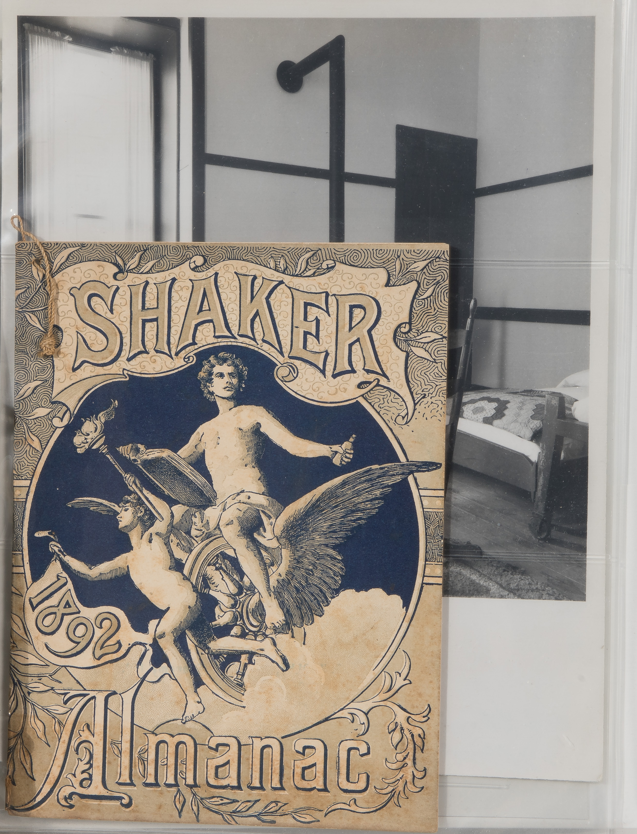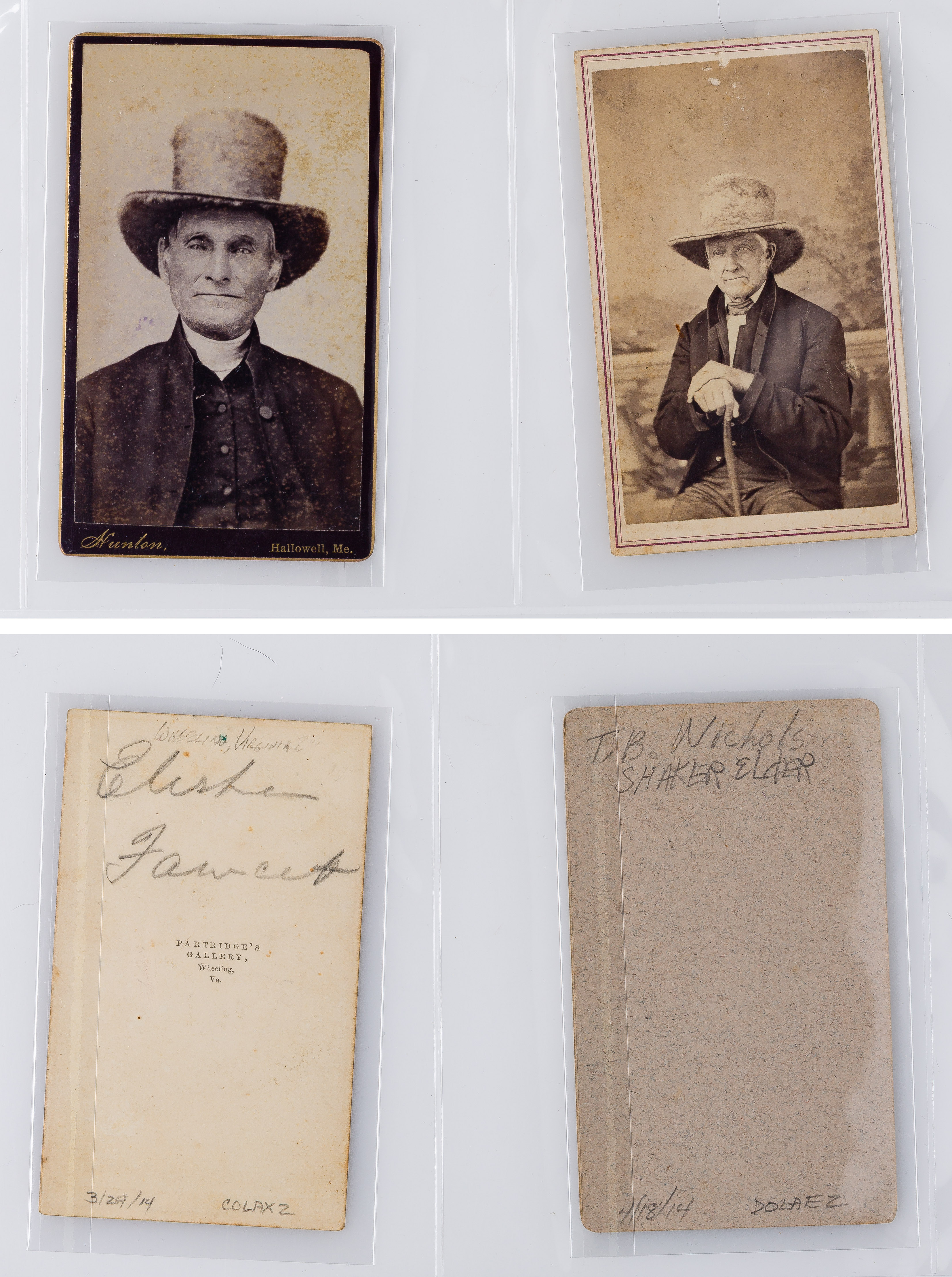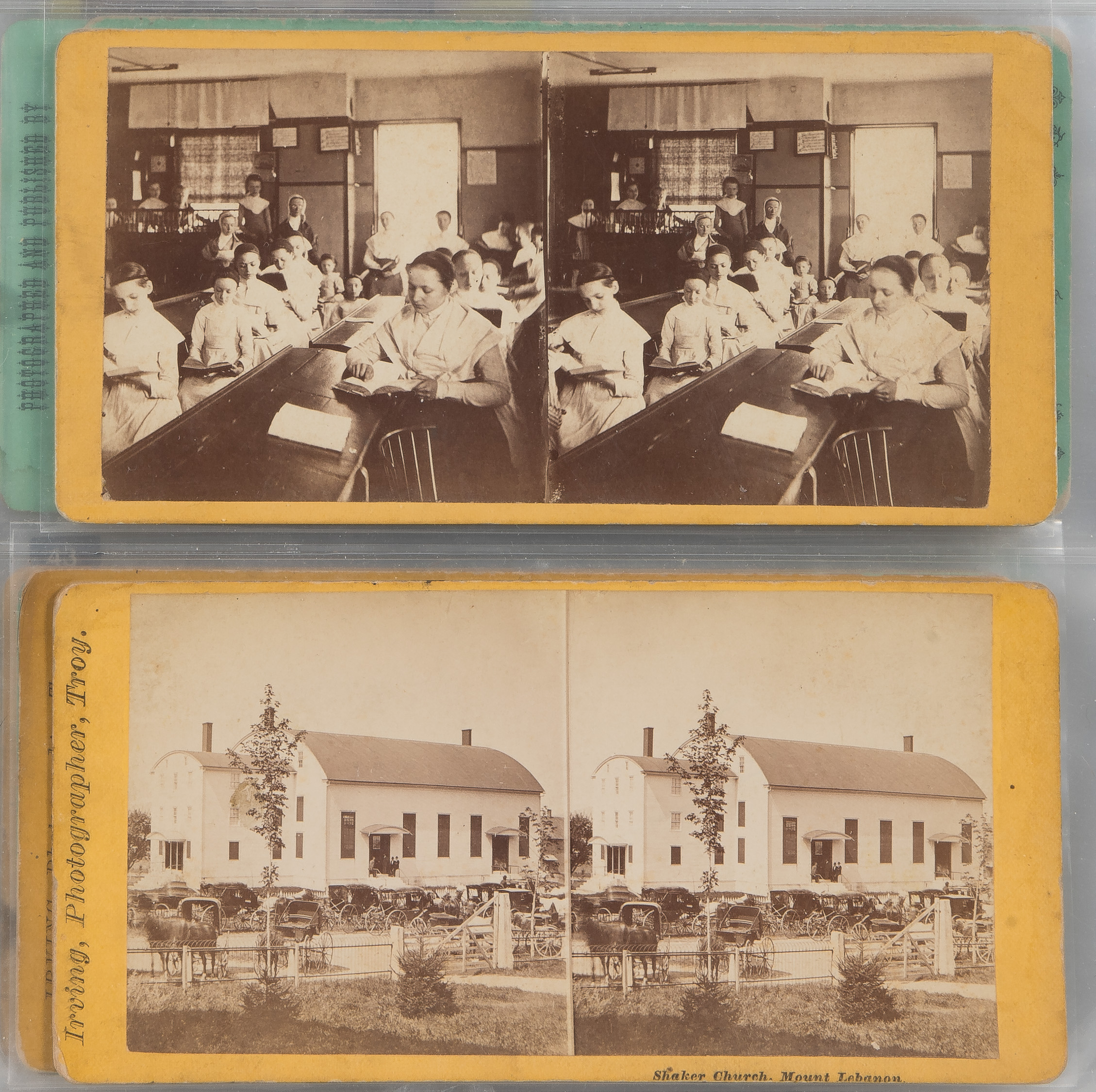 Approximately (125) total items including cabinet cards, cartes de visite, stereoviews and postcards depicting members of the Shaker movement and activities, many in a binder, a framed mounted to card behind glass in a wood frame; together with approximately (30) ephemeral items including paper labels for herbs and ointments, booklets and a map